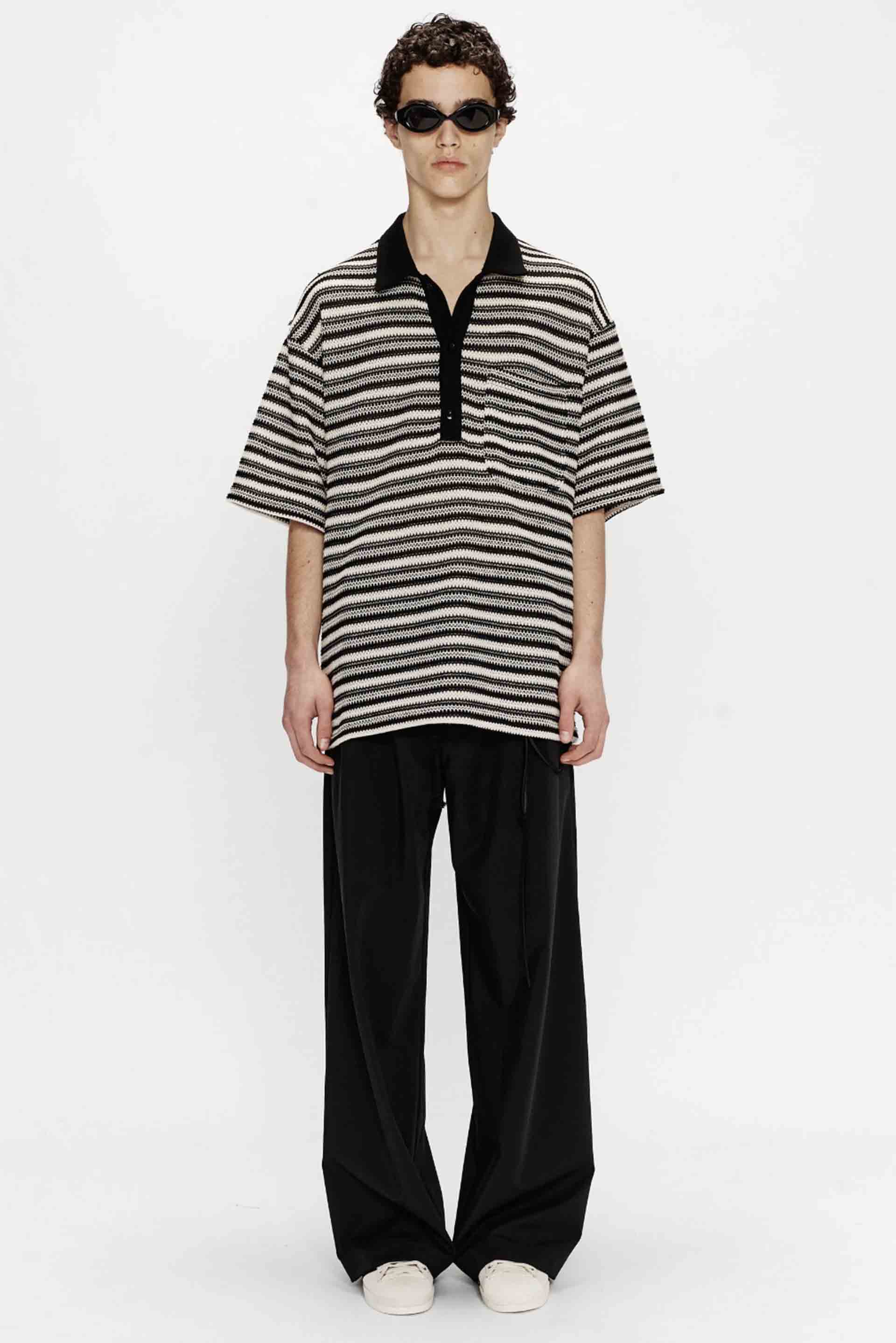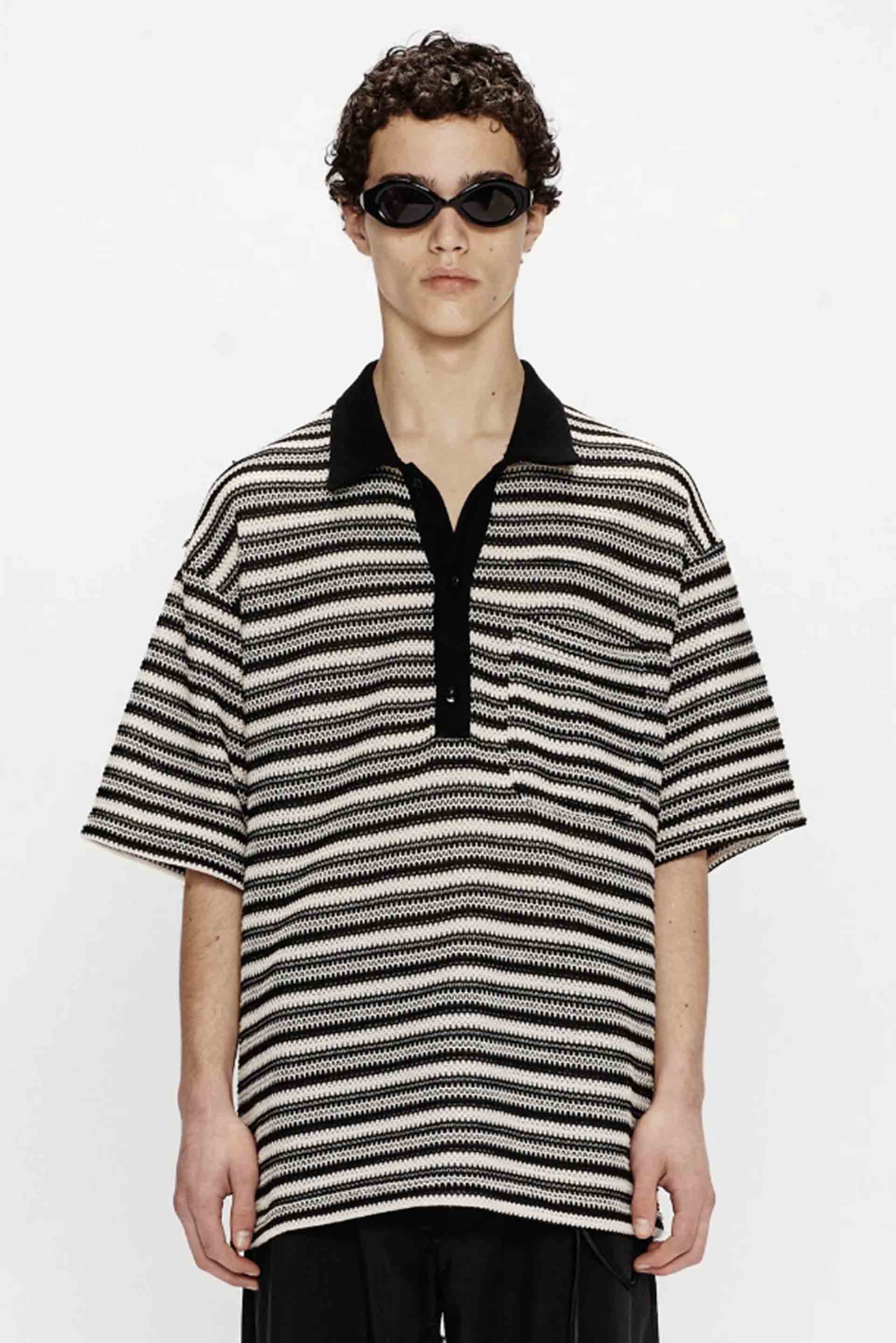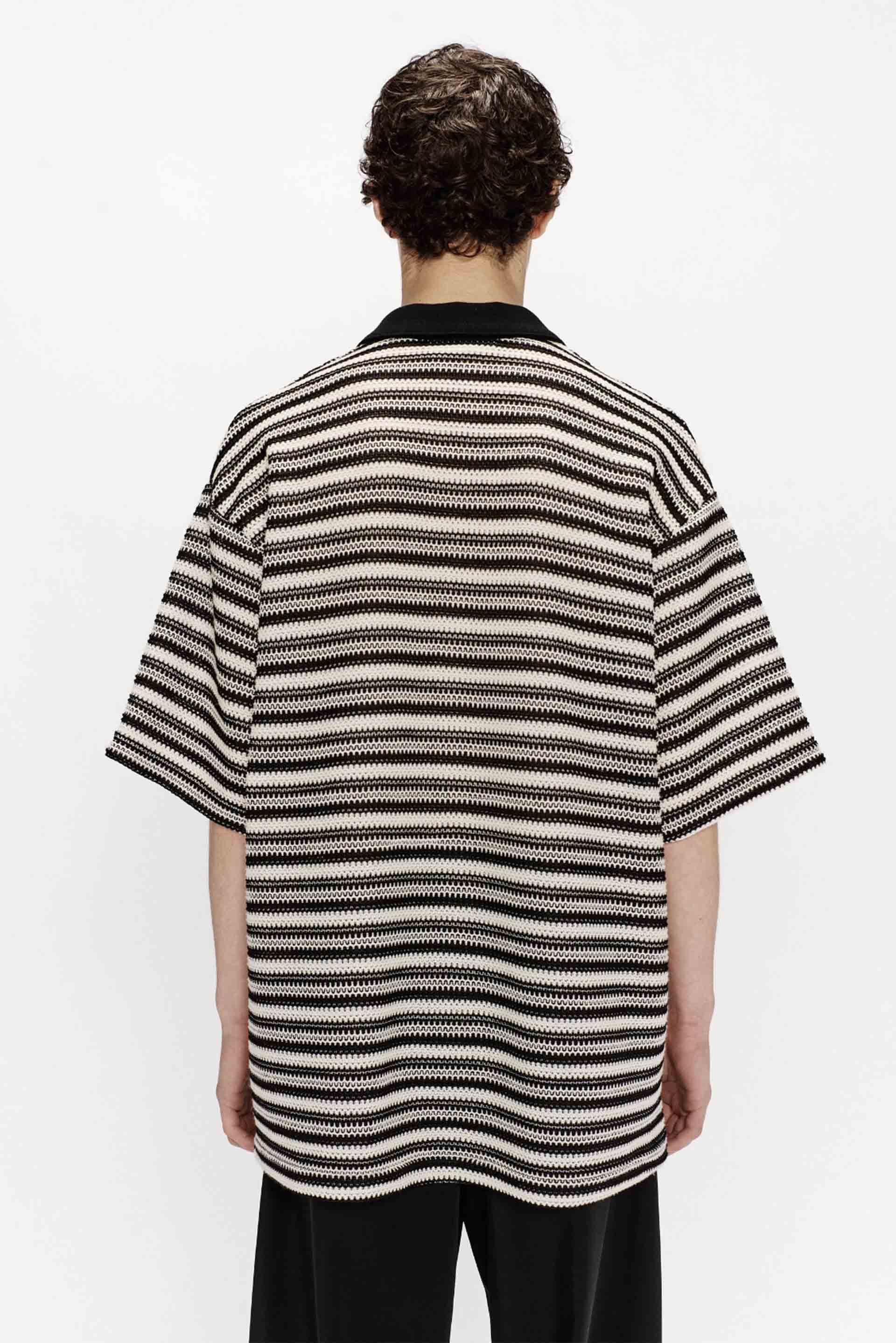 Song for the Mute Polo in Black and White. Short sleeves. Button closure at neck. Oversized boxy fit polo in a crochet knit stripe.