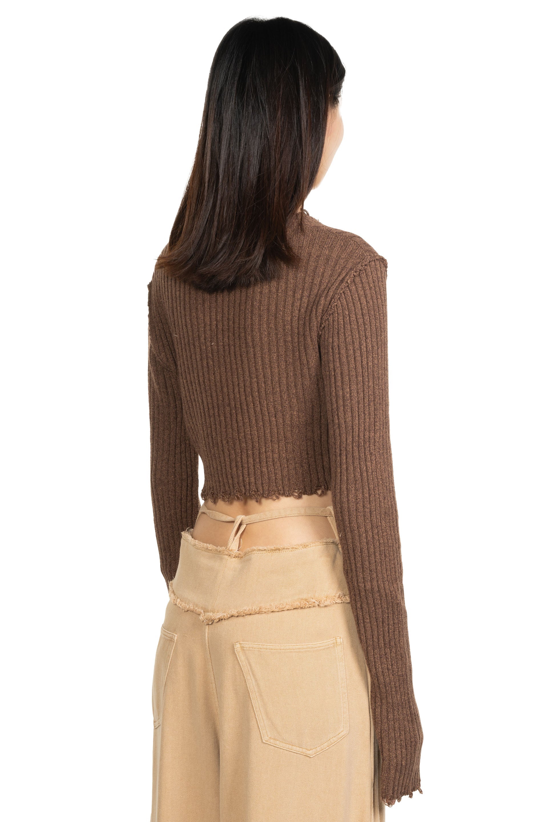 Peng Tai Cropped knit shirt. Long sleeves. Cropped. Distressed details cuffs, bottom and collar. Button closure at front. Soft textural fabric.