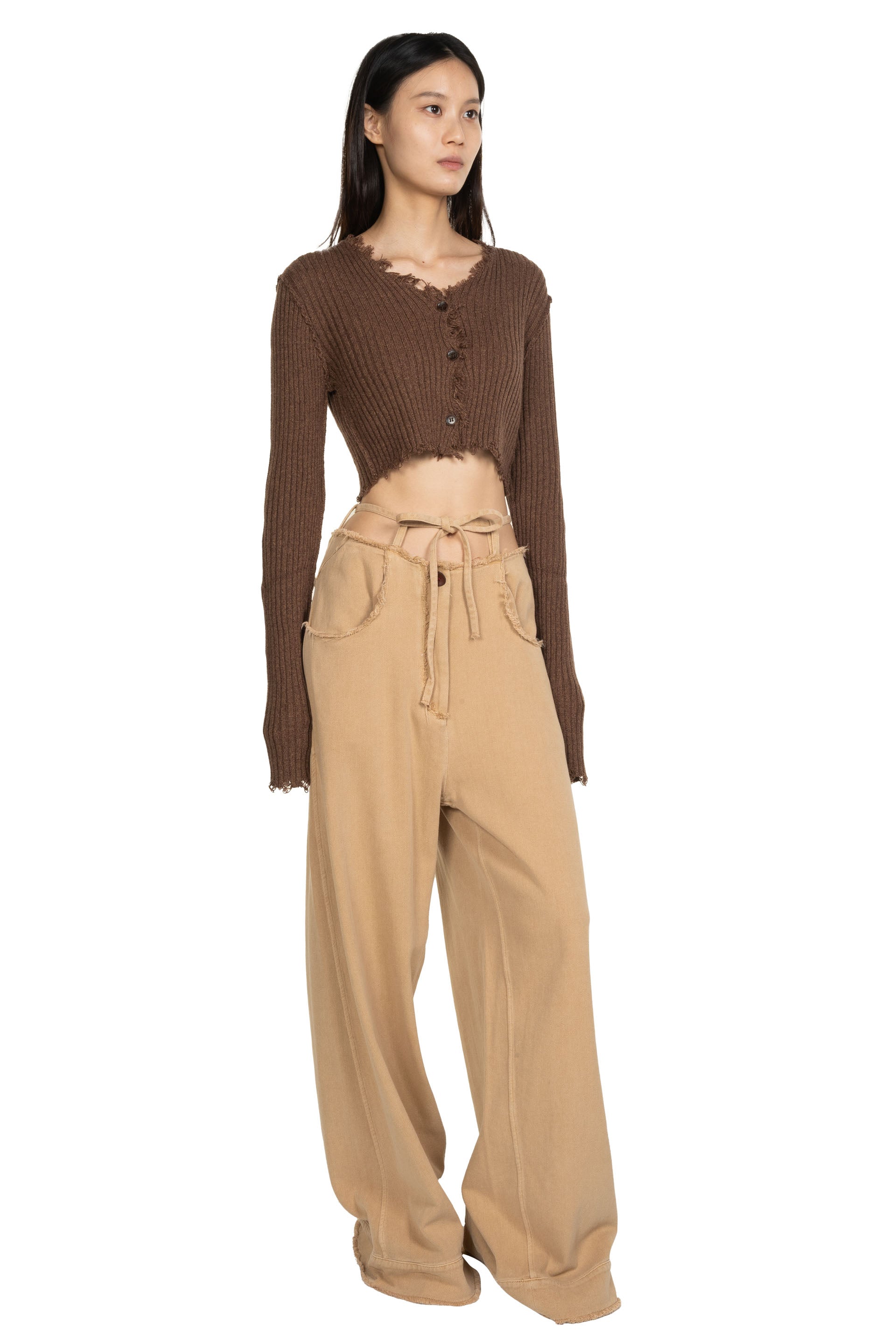 Peng Tai creates modern silhouette with traditional chinese philosophy. Inspired by how Chinese herbal medicine regulates the body from the inside out, Peng Tai aims to research and develop a way to boil Chinese herbal medicine with fabrics, to create clothes that feel like a second skin as seen with the Cropped Knit Shirt Roast Almond.