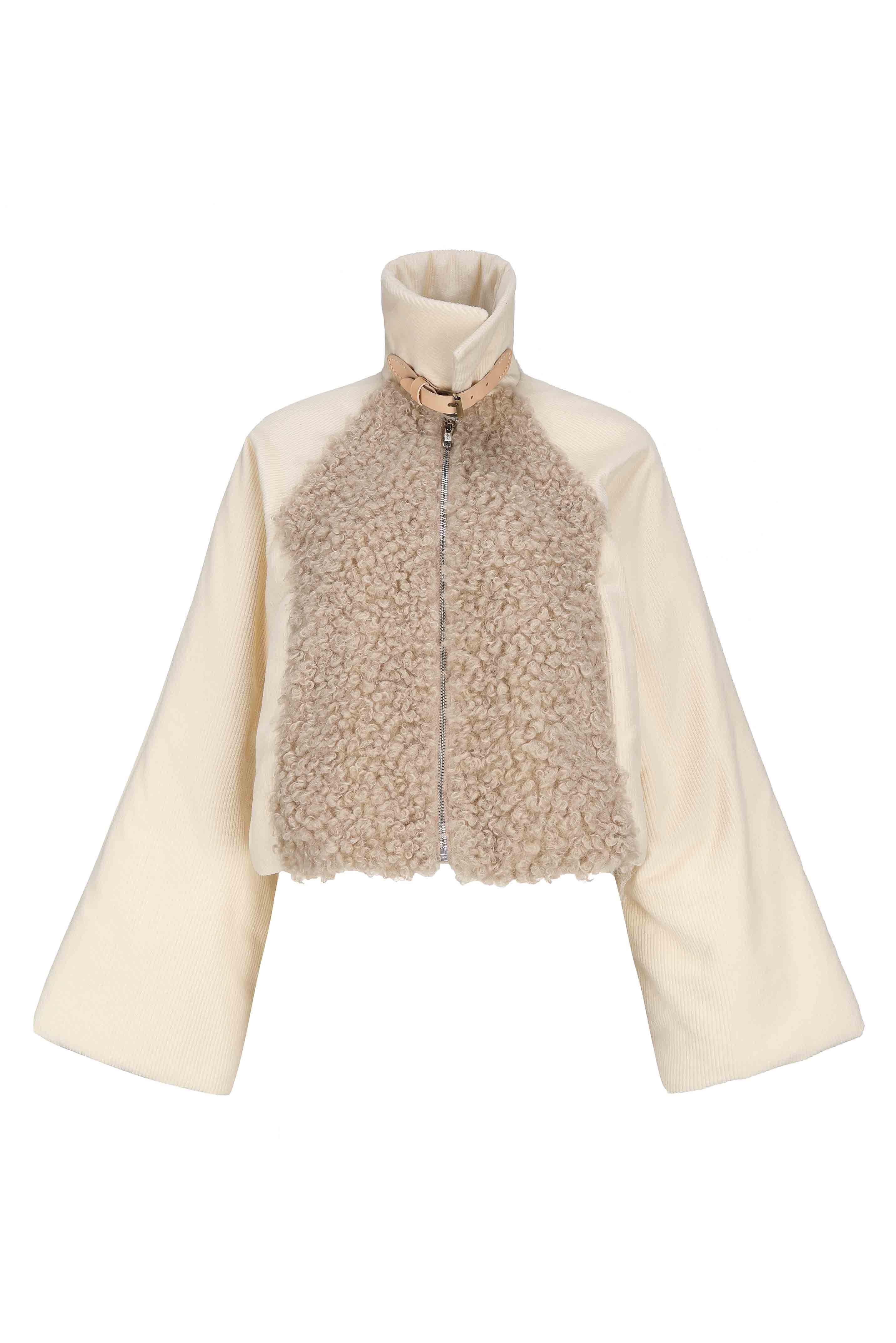 Peng Tai Cropped Terry Jacket Beige. Long sleeves. Two side pockets. Zip closure at front. Belt closure details at neck. Lined. Padded. Lightweight. Slightly cropped boxy fit. Sherling and terry soft texture.