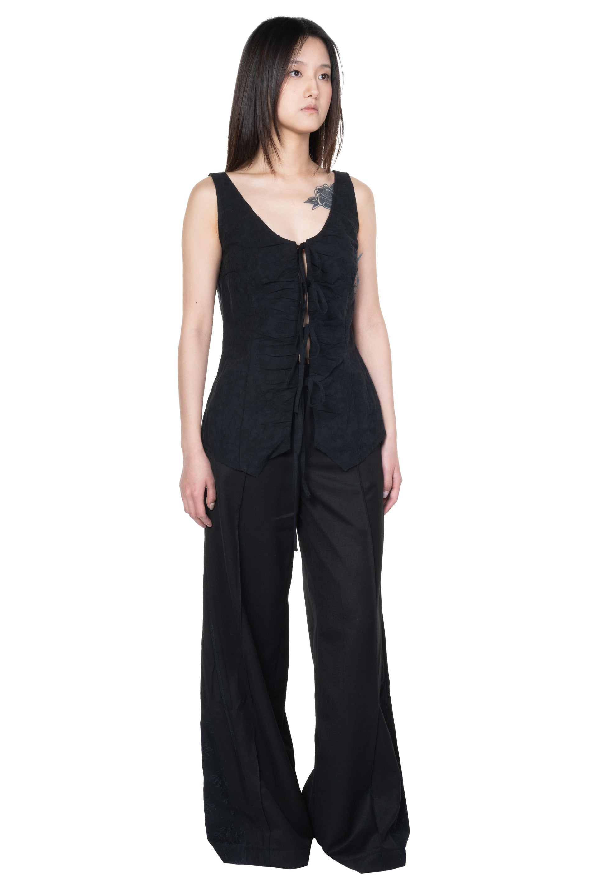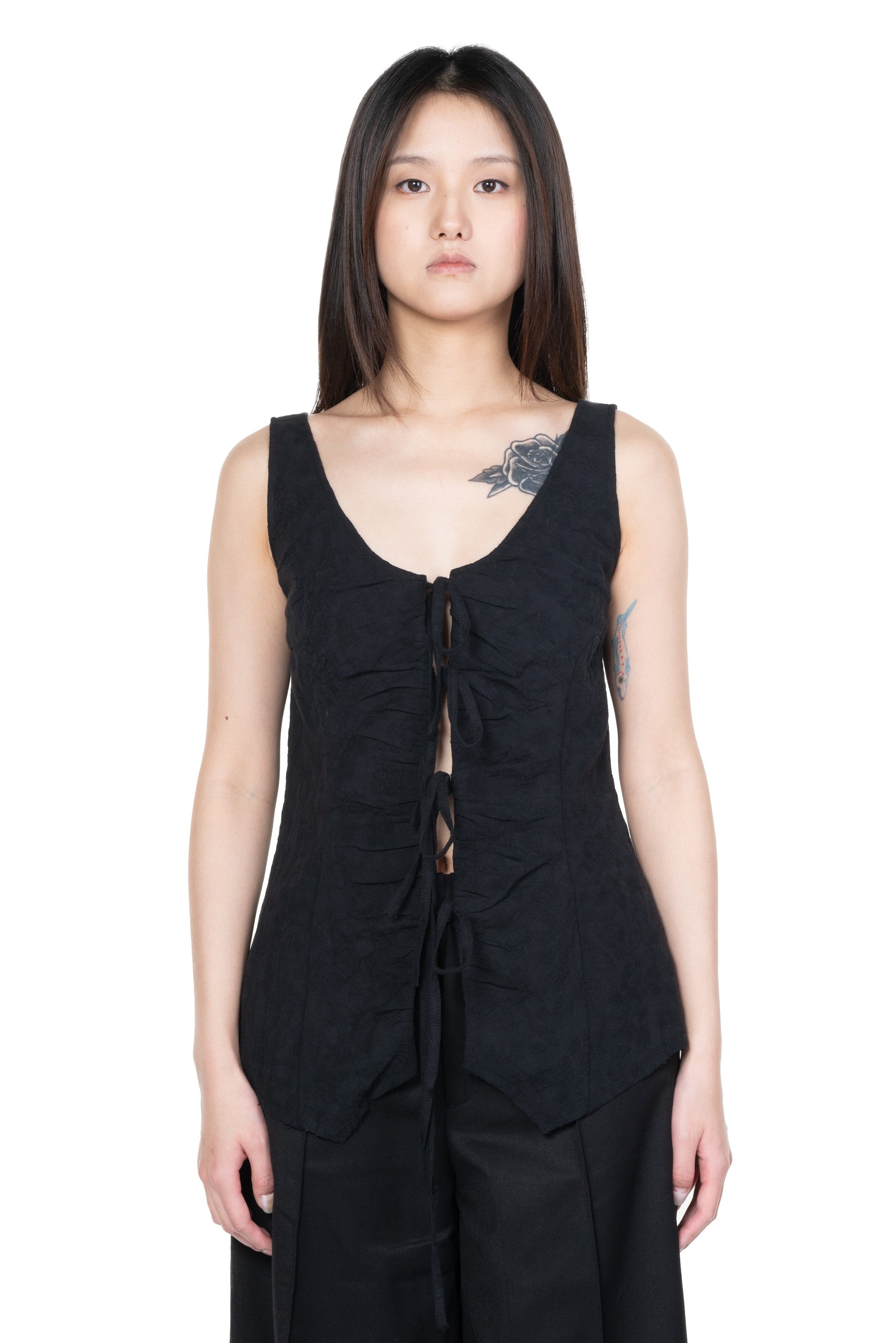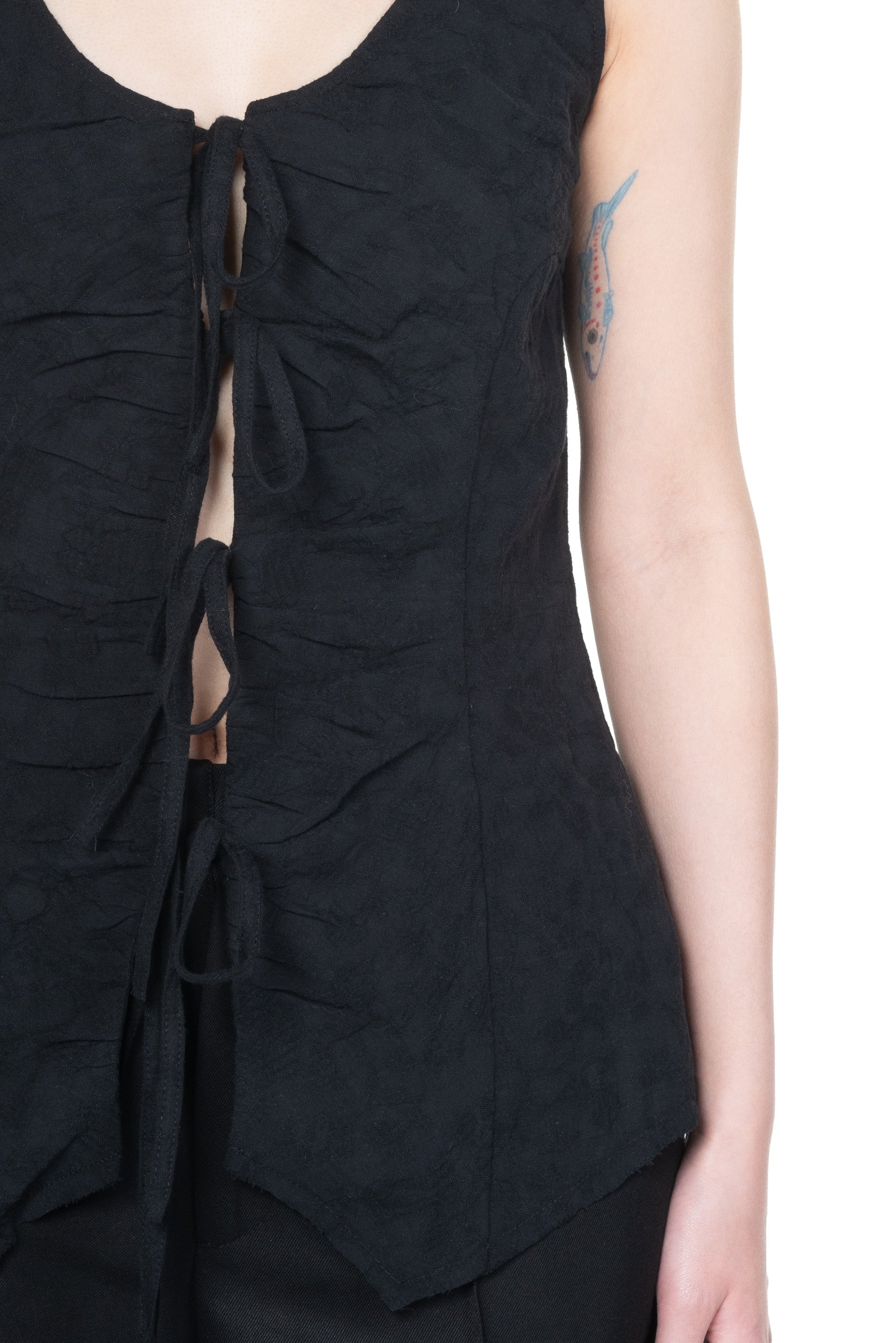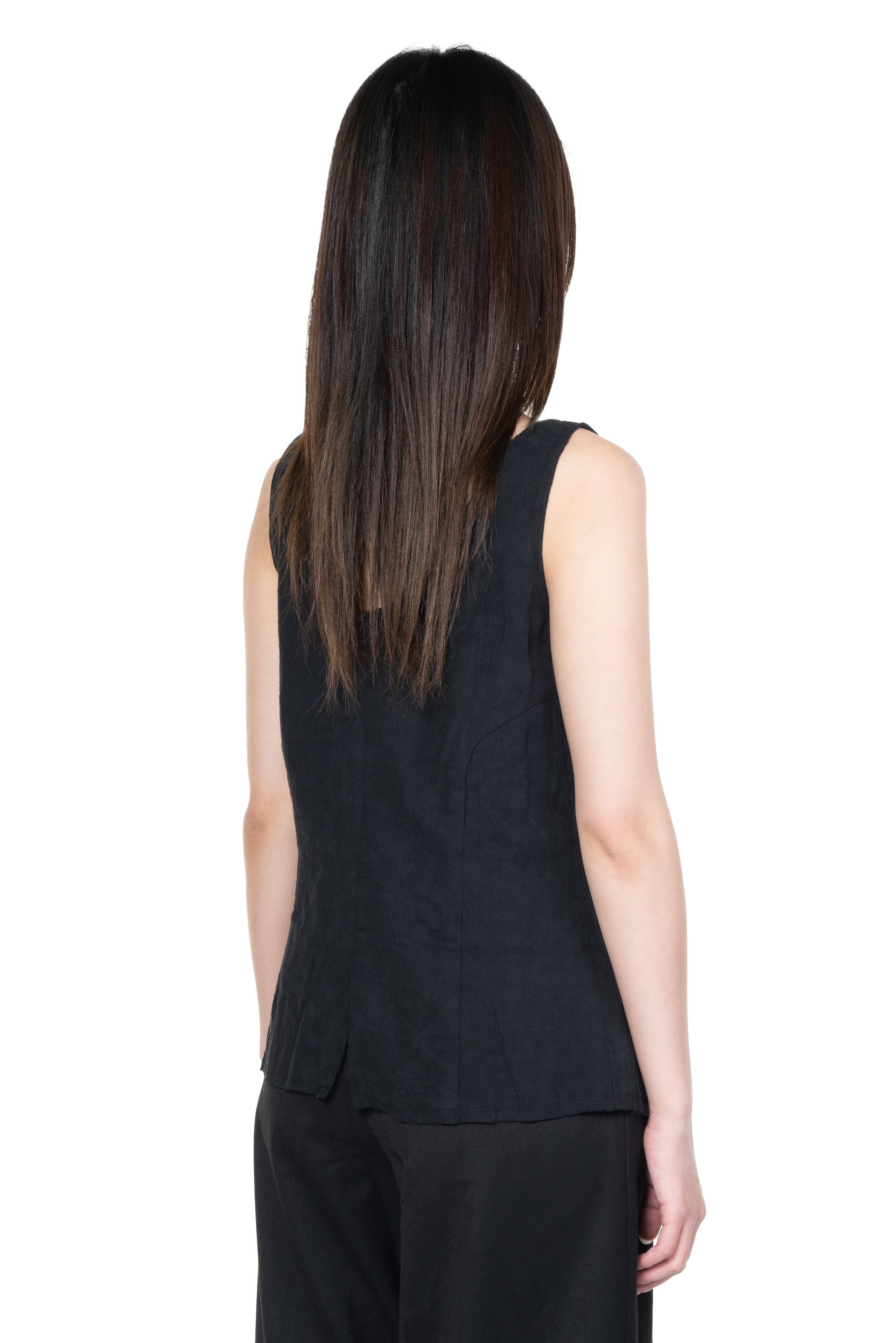 Professor. E Cross Linen Top Black. Sleeveless. Bow closure at front. Signature details at front. Beautiful linen fabric.