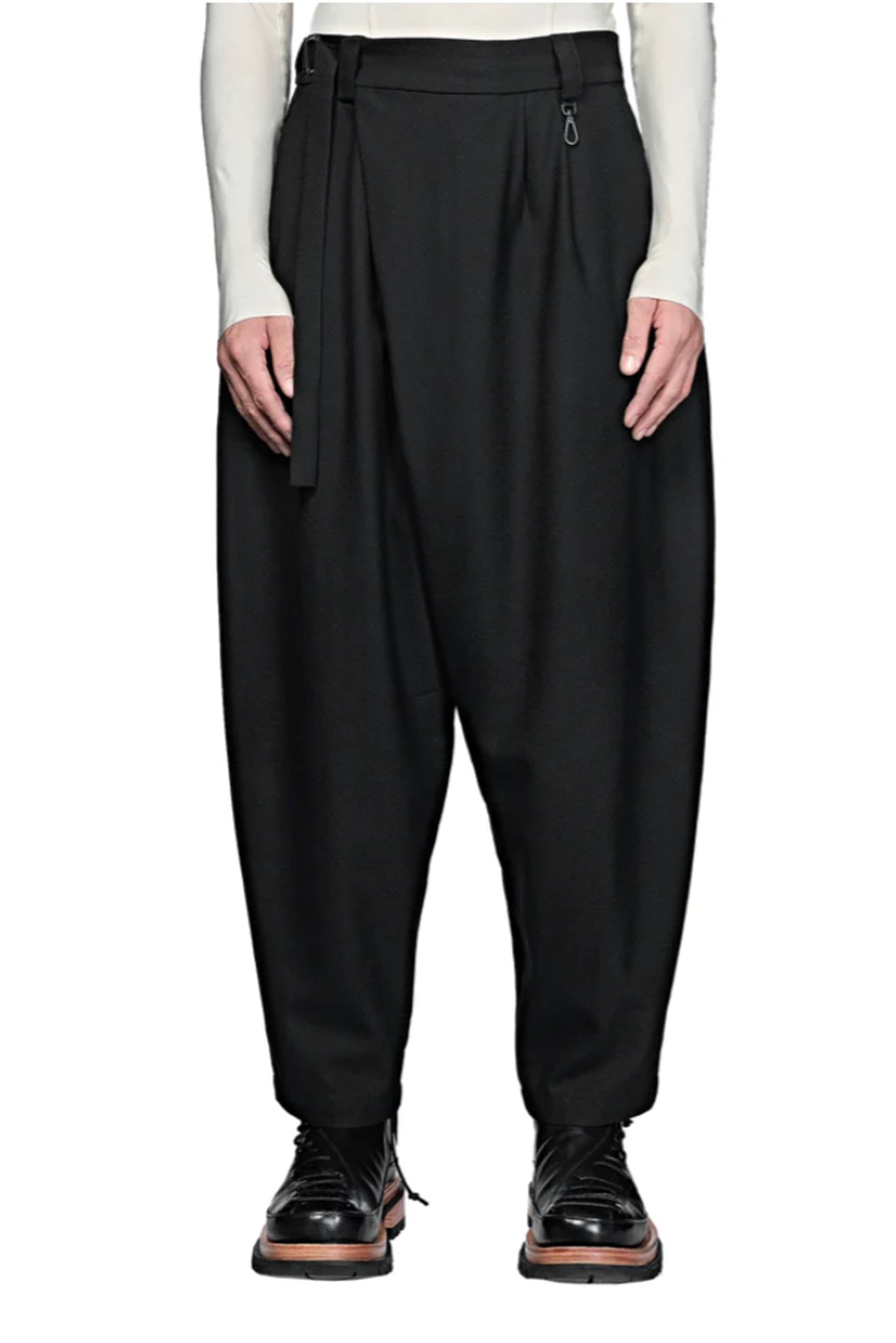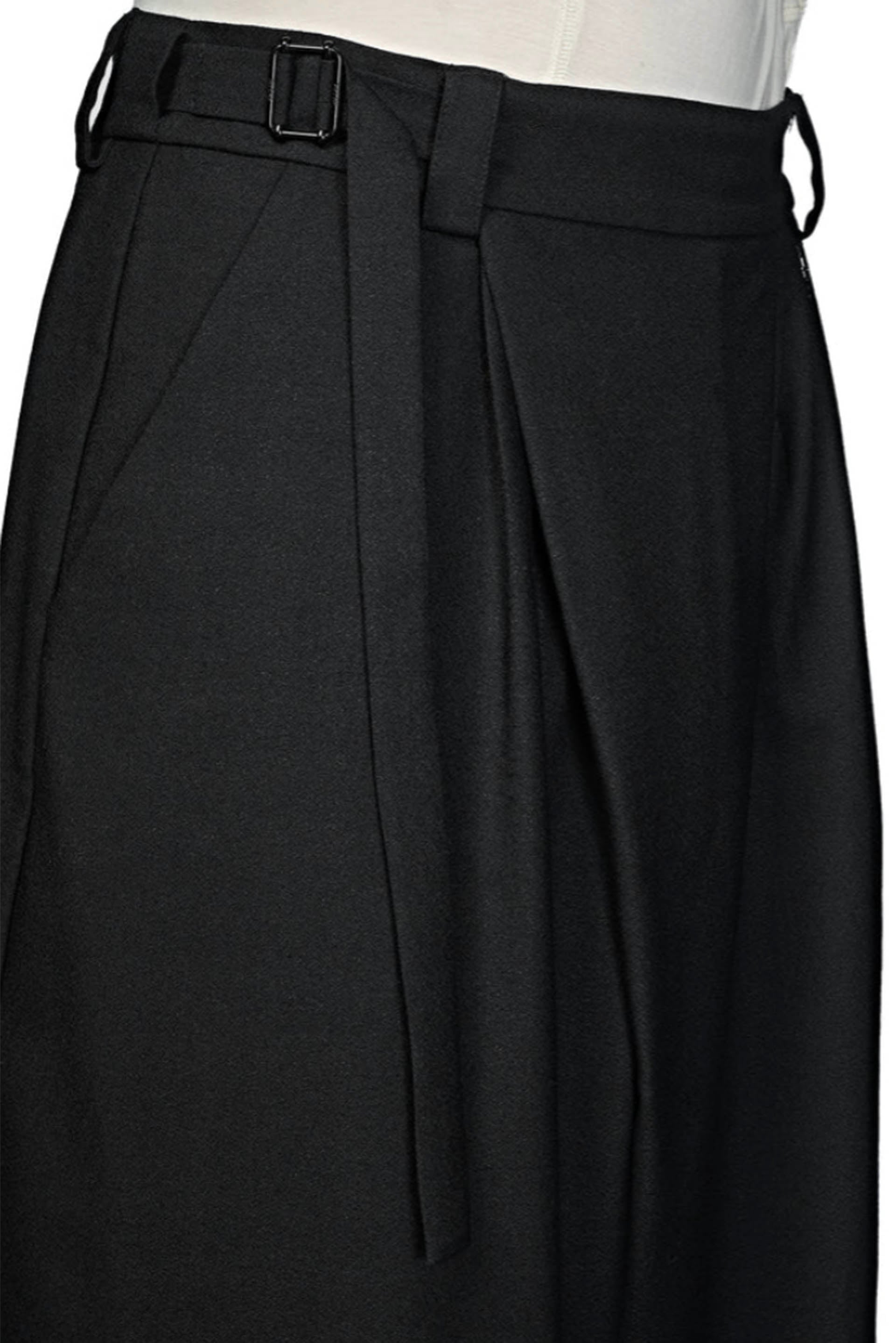 Slanted pleat long pants with four pockets. Adjustable strap detailing with tonal hardware and belt loops. Gun-metal hook at front. Low inseam. Zip-fly. Medium weight, breathable and comfortable.