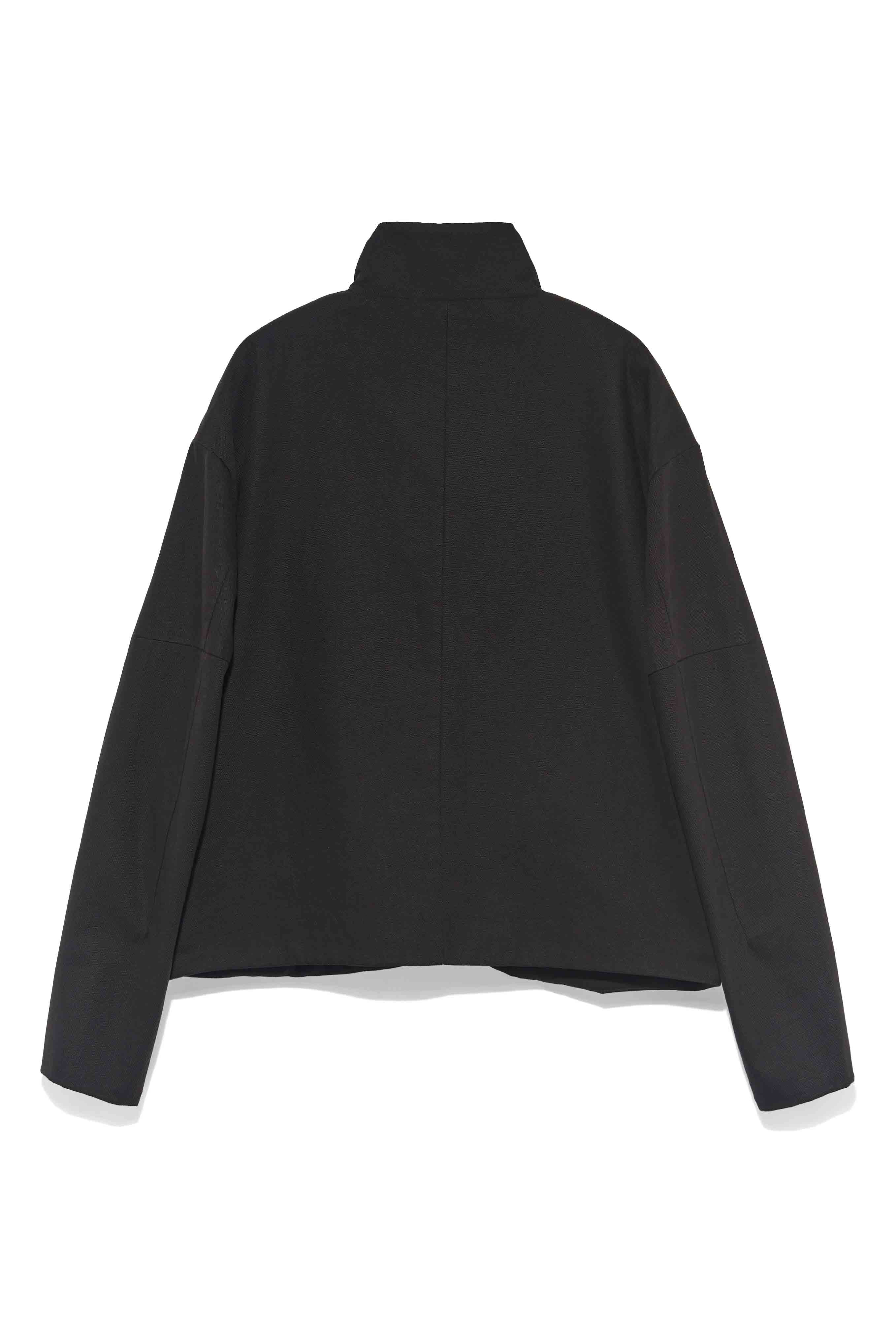 Long sleeves. Two side pockets. Curved design at bottom. Boxy fit. Overlapped. High collar. Double zip closure at front.