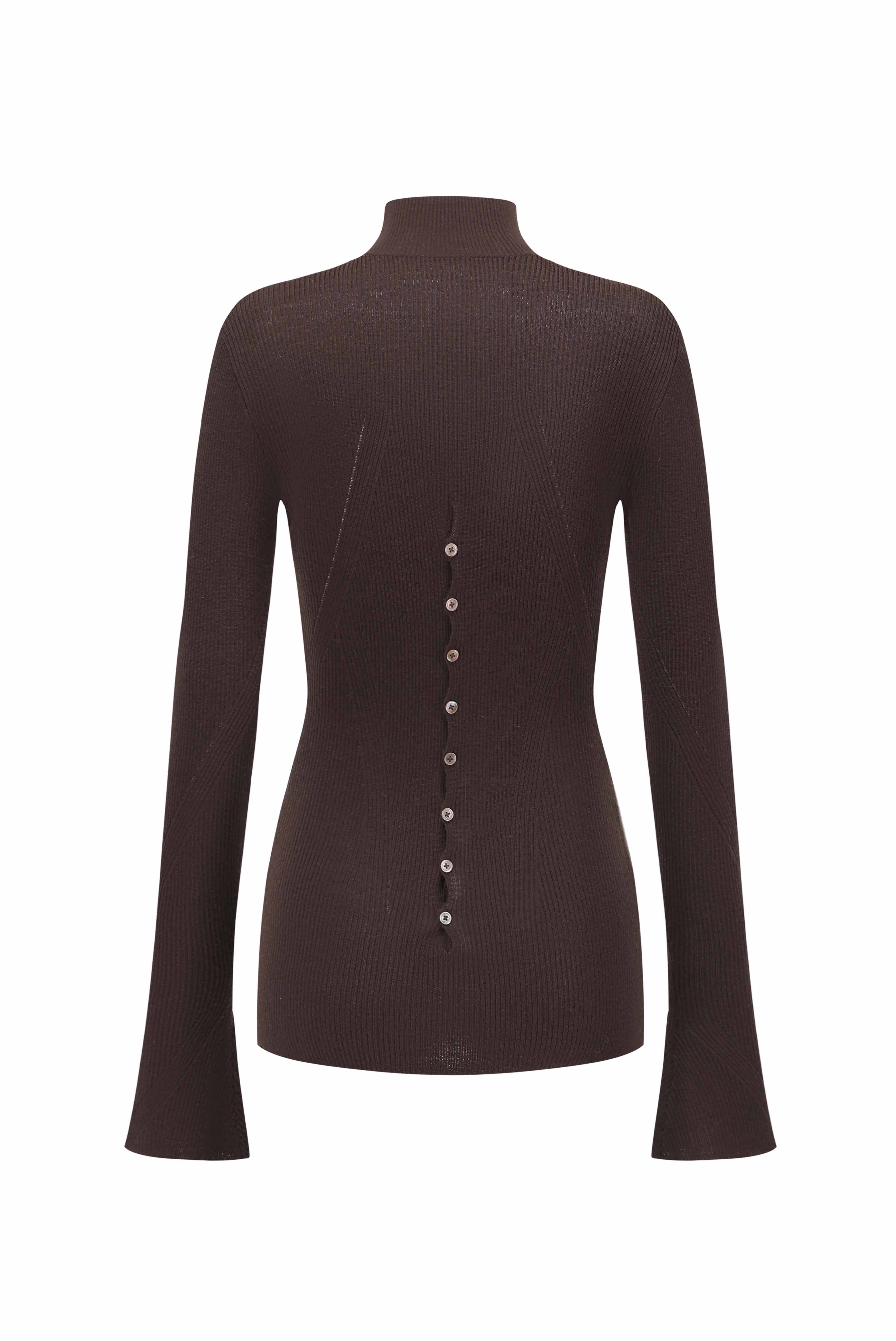 This top is spun from fine wool that feels dense, soft, and delicately smooth, with an elegant drape. It is designed in a slim fit with a flattering cinched waist and flared cuffs, creating a sleek, streamlined silhouette. Intricate ribbed textures contour the figure, balancing simplicity with sophistication. For added versatility, the back button can be undone for an open-back effect, adapting seamlessly to different looks.