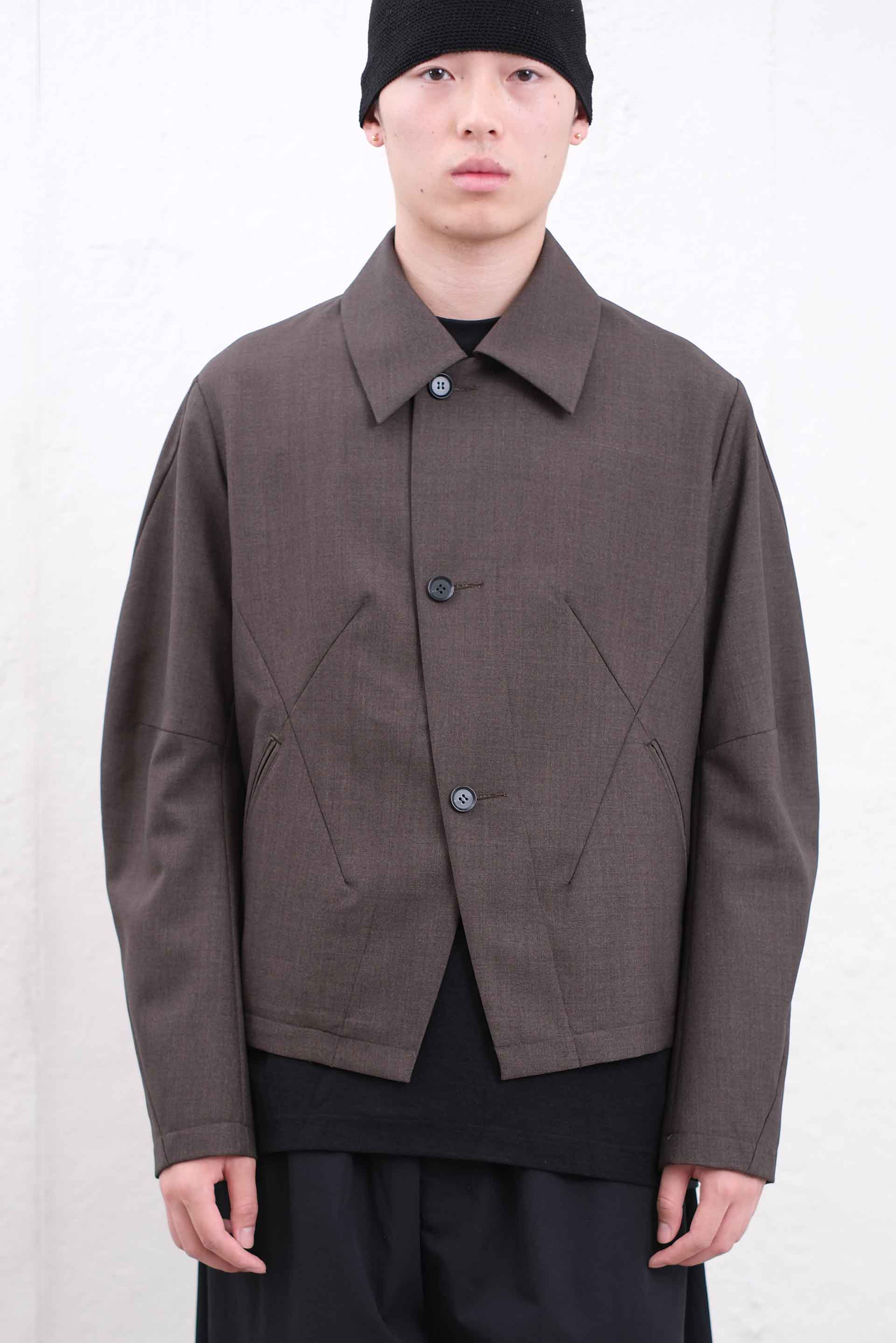 Attempt Project 11 Curved Sleeve Lapel Jacket Brown. Long sleeves. Button closure at front. Flat collar. Curved sleeves. Soft wool mixed fabric. Two side pockets.