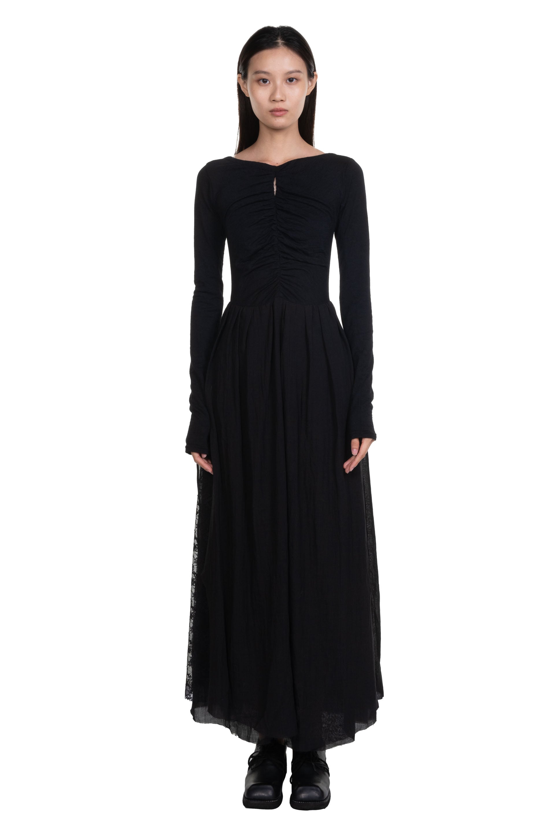 Black Cut-Out Dress from Professor e. Long sleeves. Pleated at front. Small open detail at front. Open at back with drawstring details. Soft and light textural fabric.