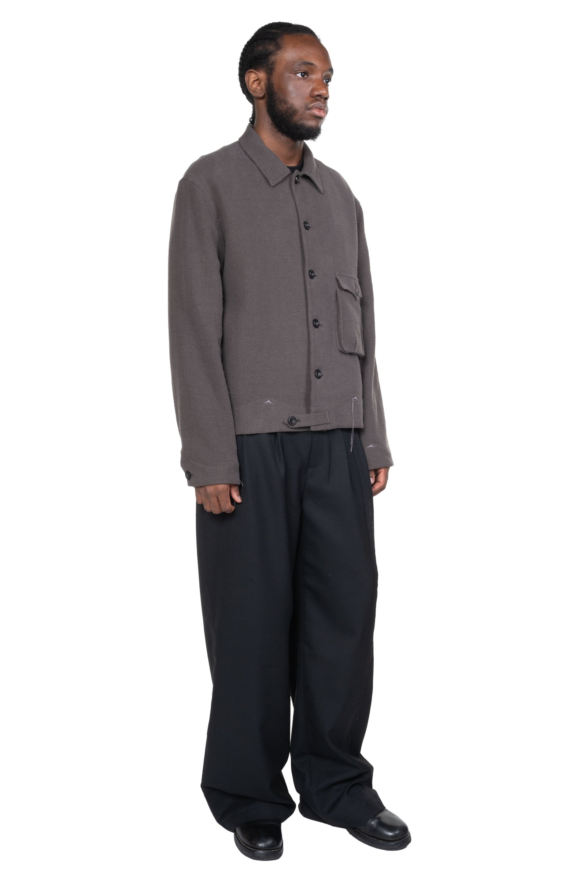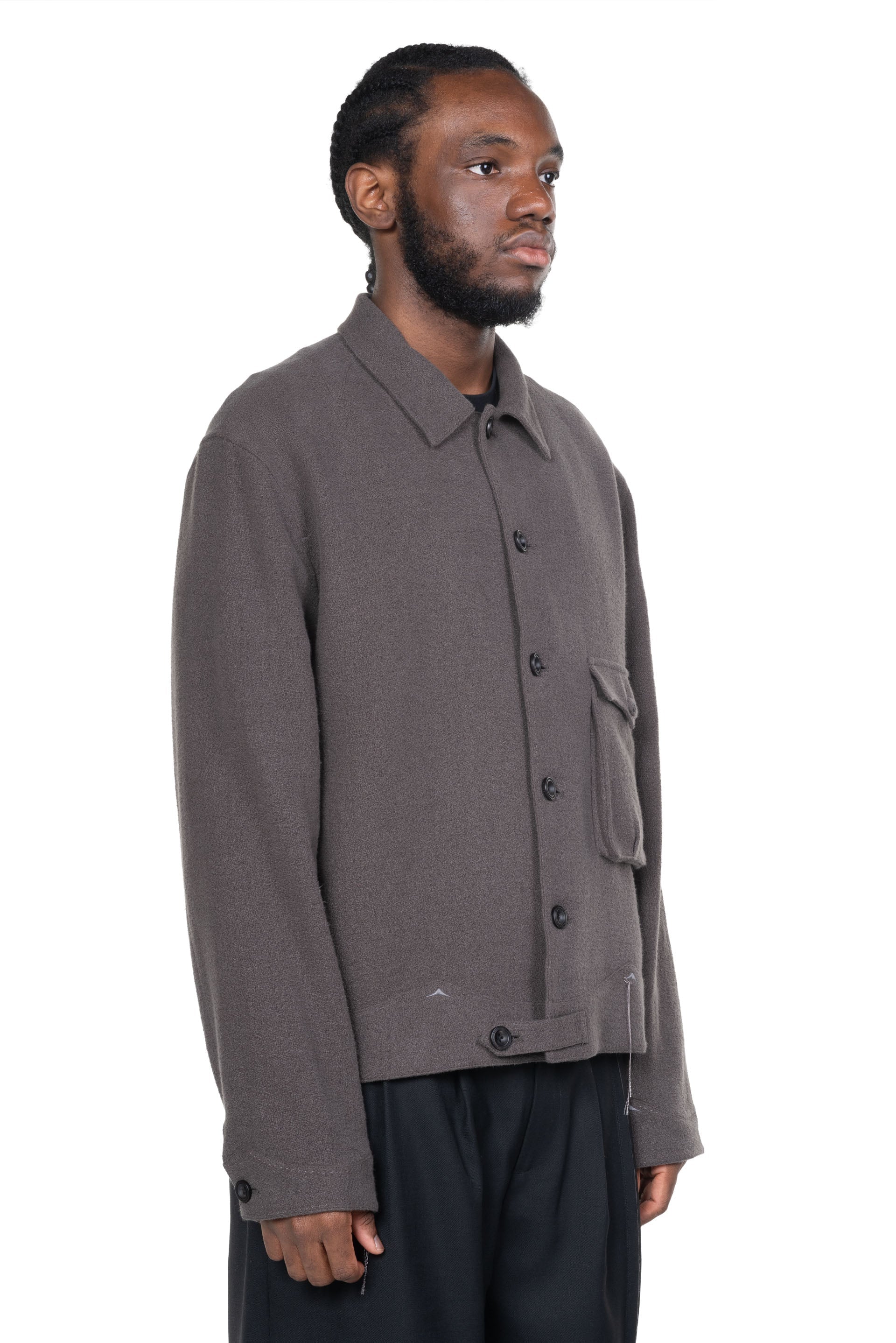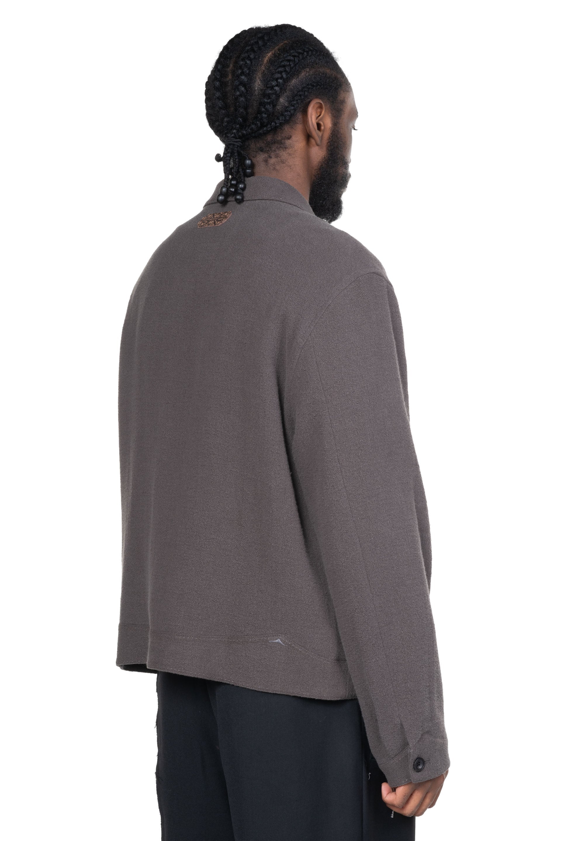 Professor. E understands the time of aesthetics from the use of cotton, hemp and wool. Fabric stitching, patching, designs without edge trimming, deconstruction, and reproduction are all Professor. E's signature elements creating classic immortal designs that can be viewed with the Cyclist Jacket Aged Grey