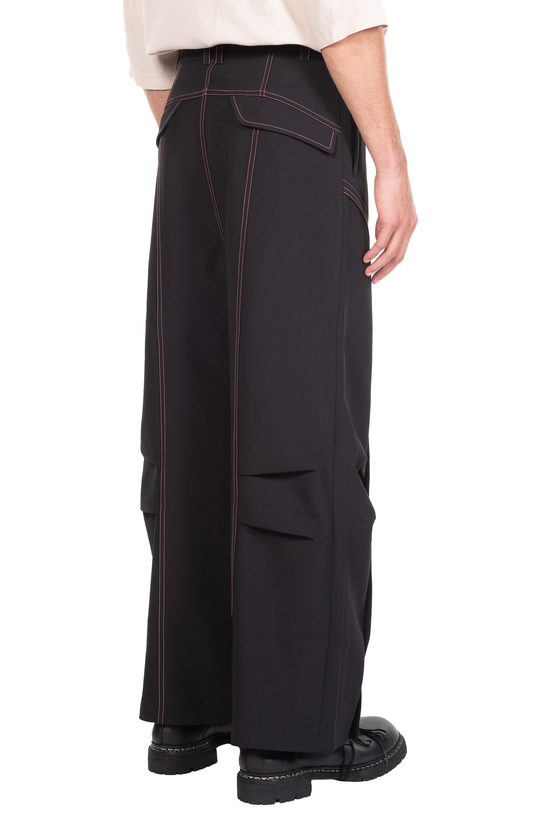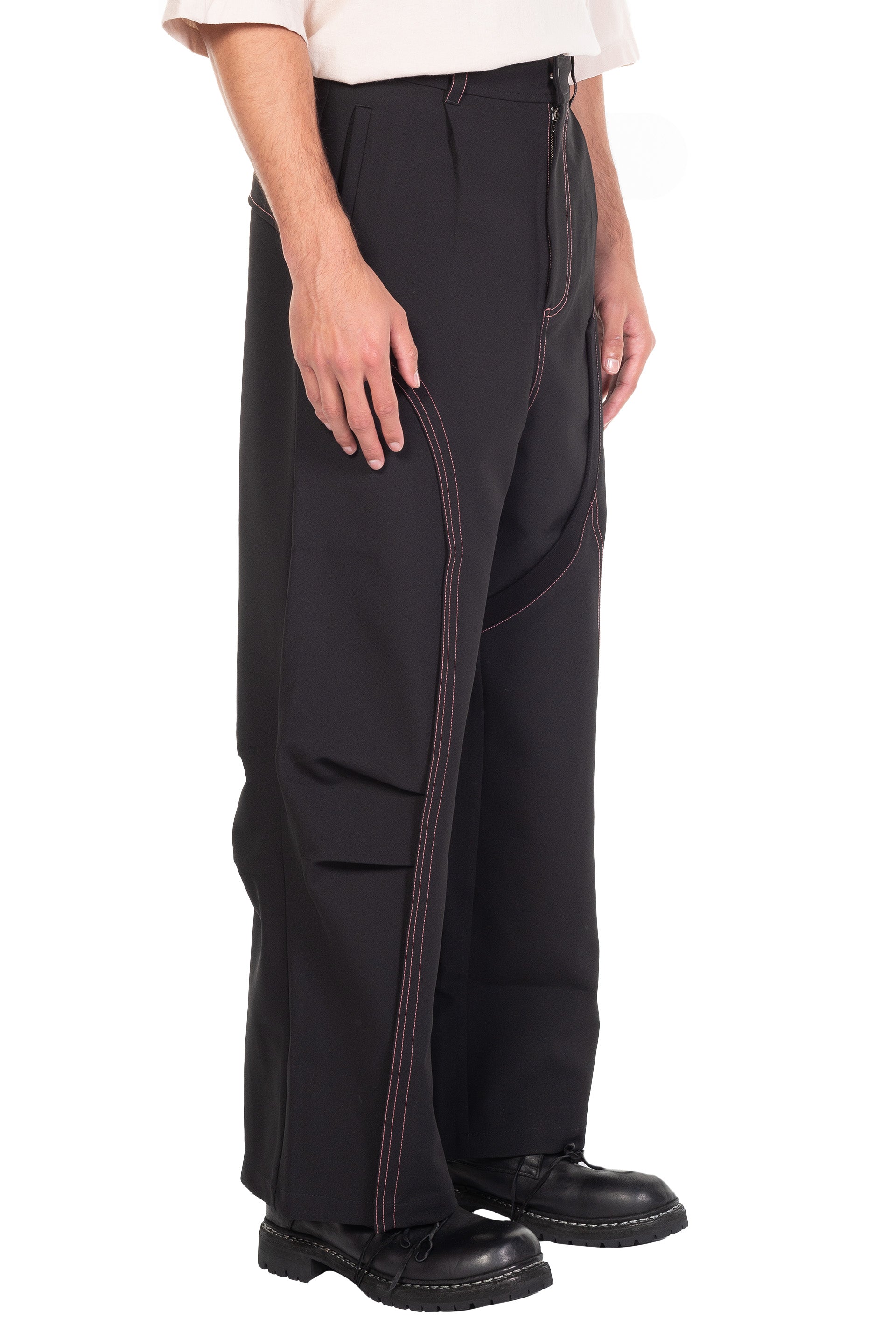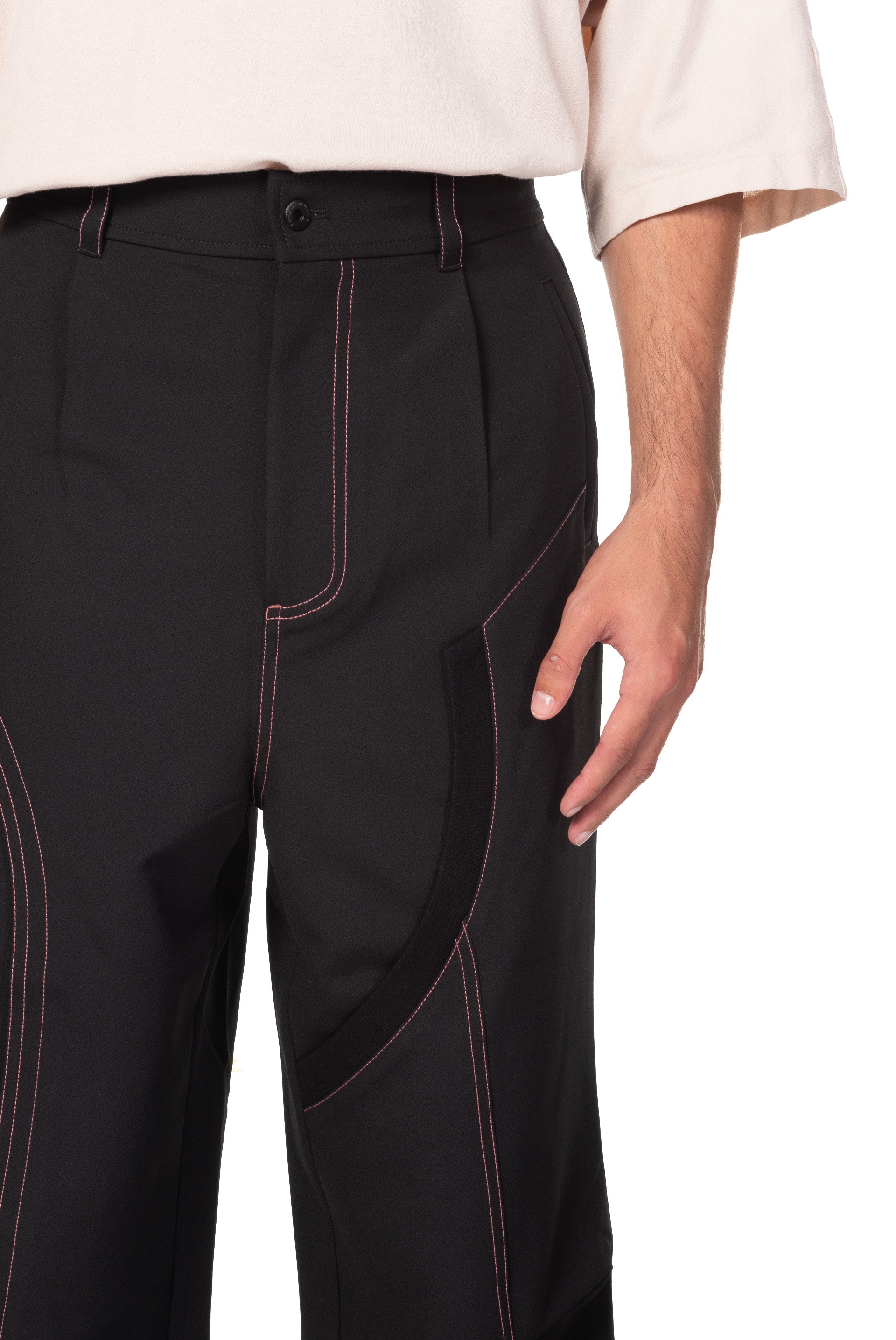 Button closure at waist. Zip fly closure. Two side pockets. Two back pockets. Deconstructed design throughout. Contrast stitching throughout. Pleats at knee.