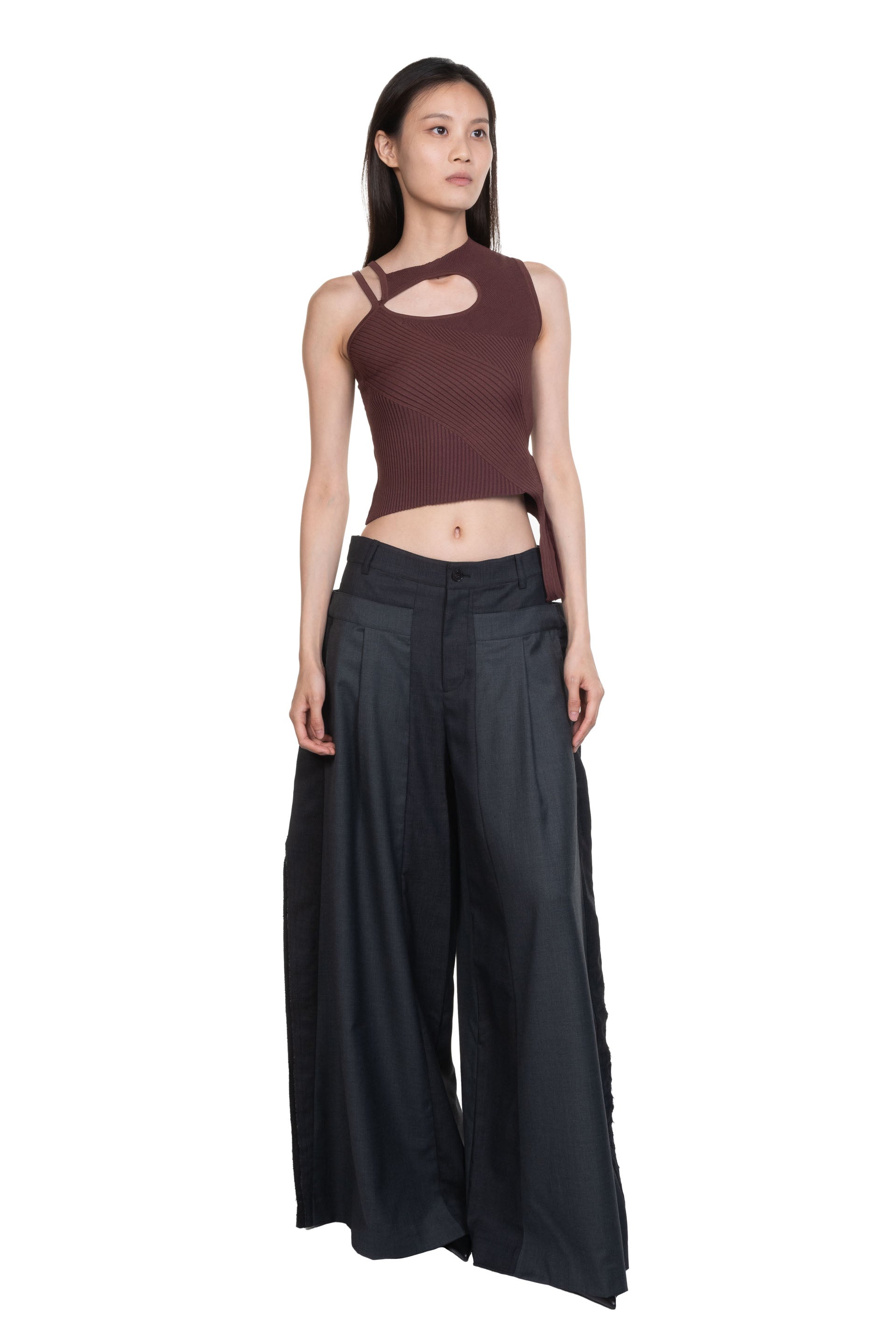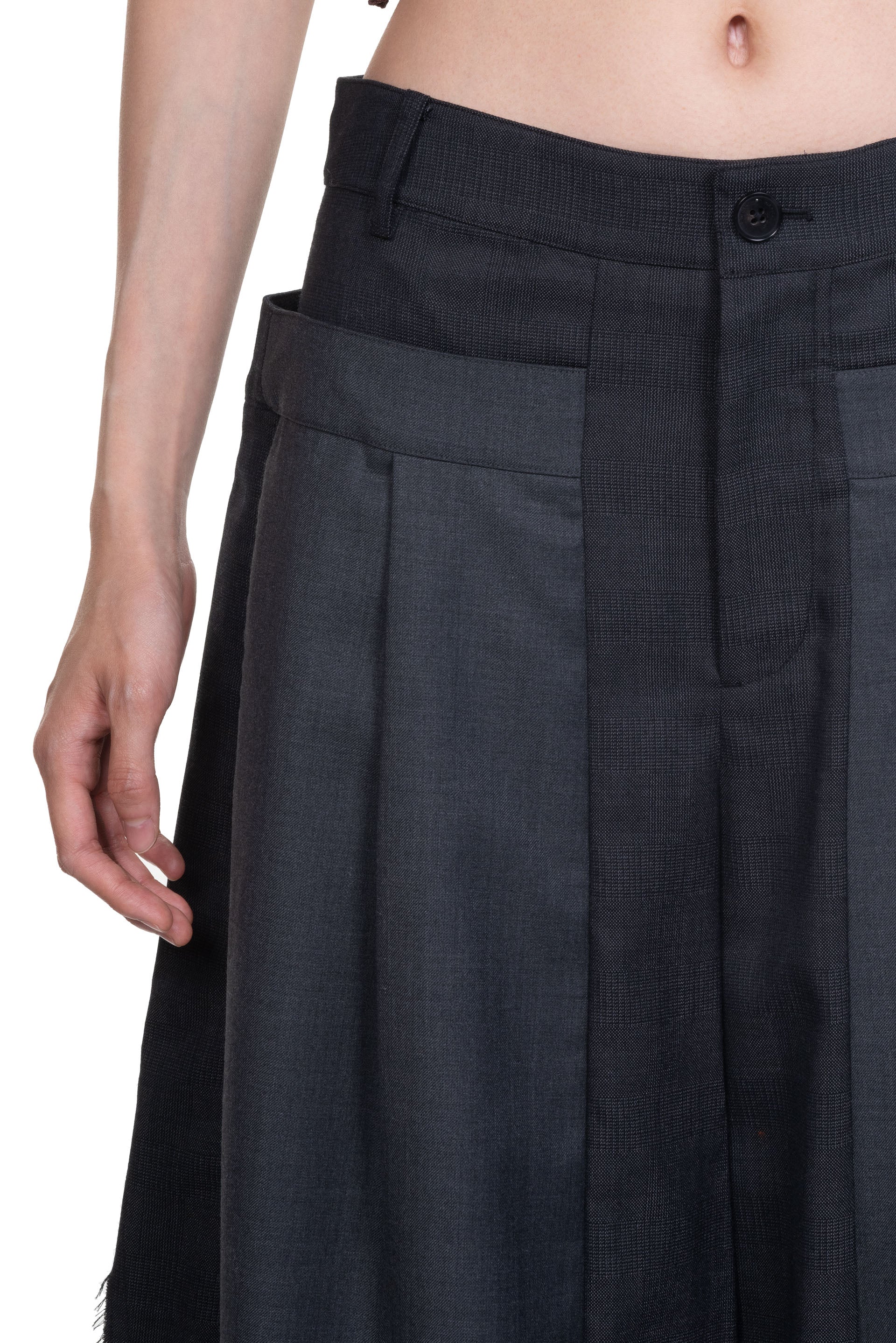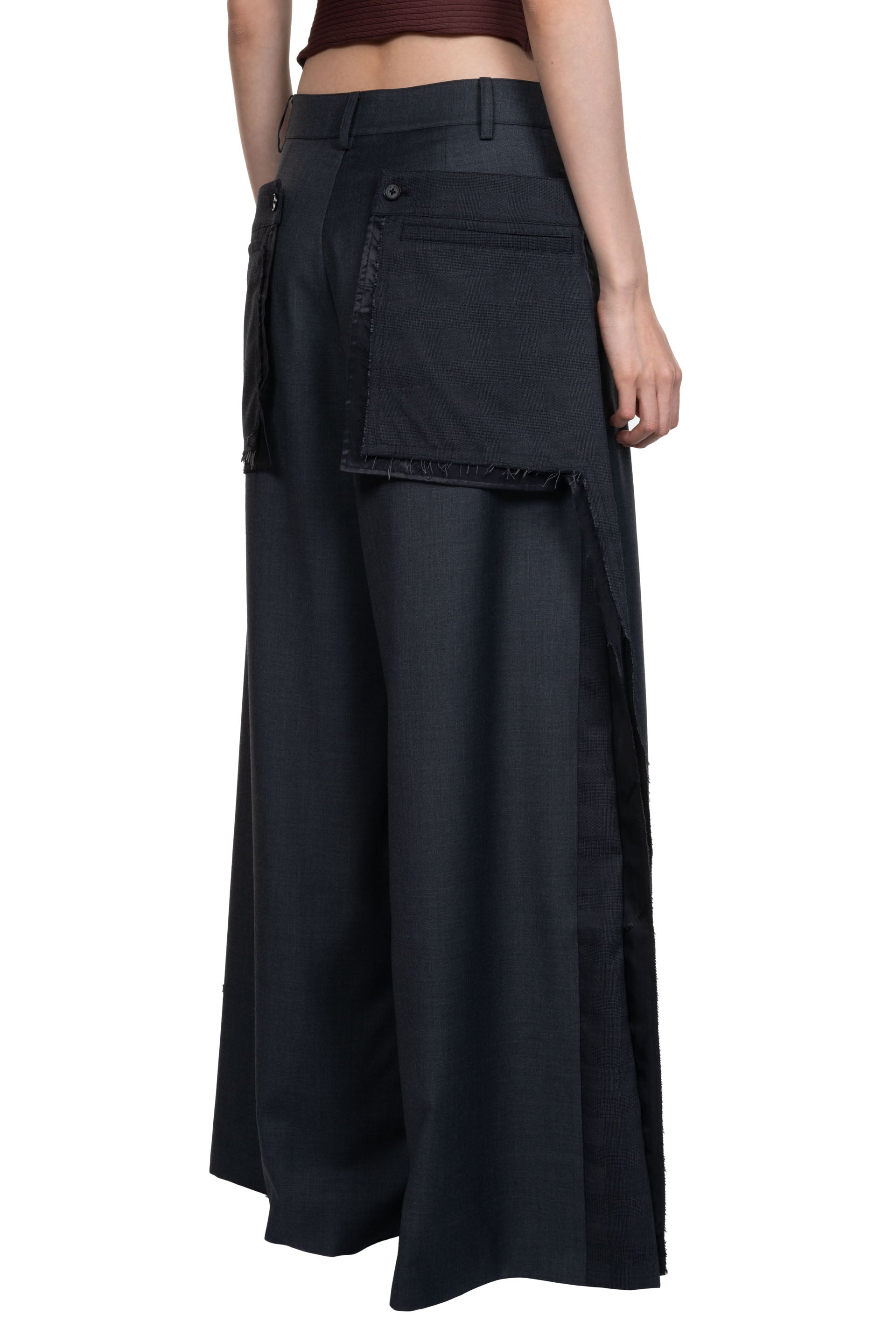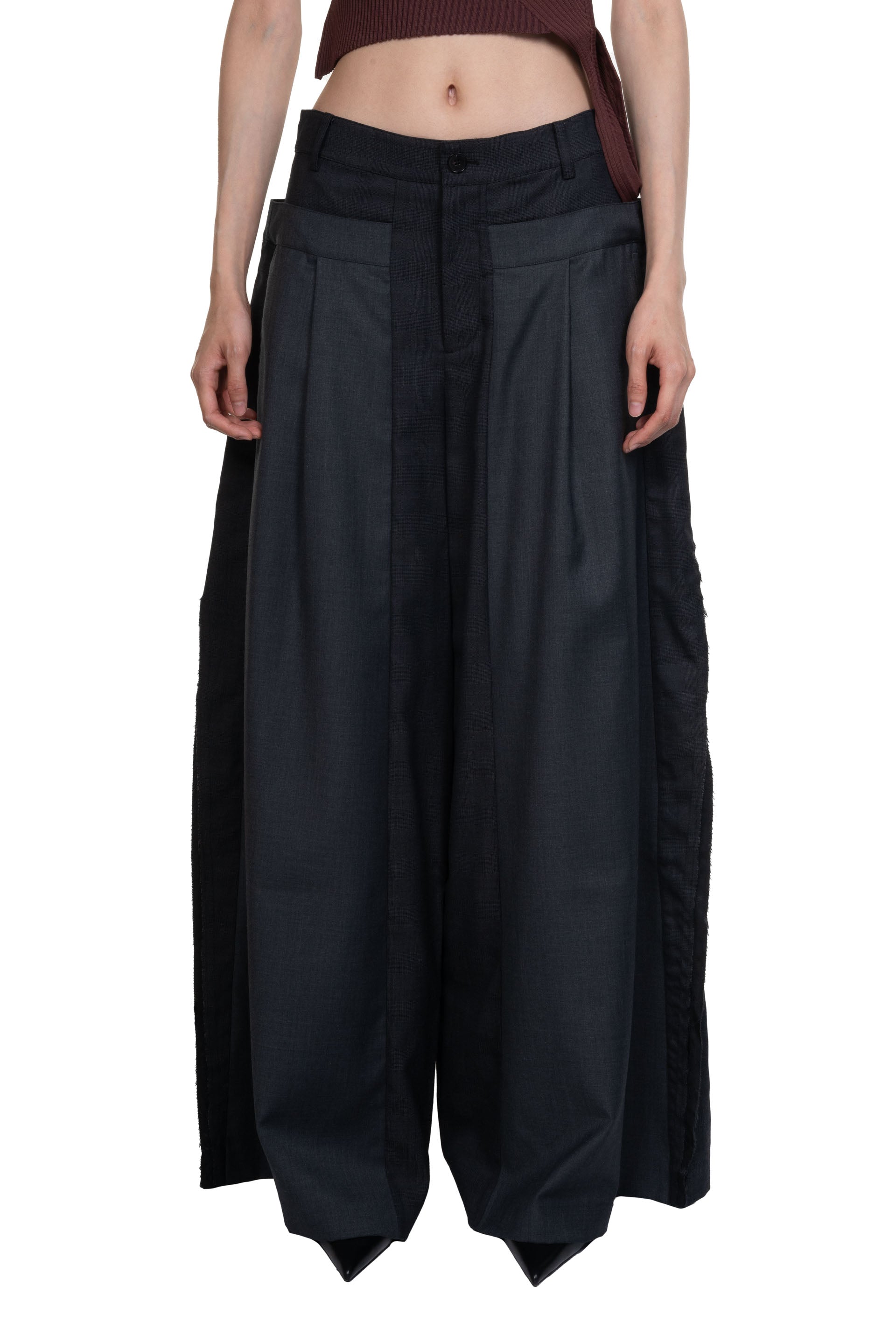 Button closure at waist. Two side pockets. Pleated at front. High waist. Wide leg. Deconstructed design. Patchwork throughout.