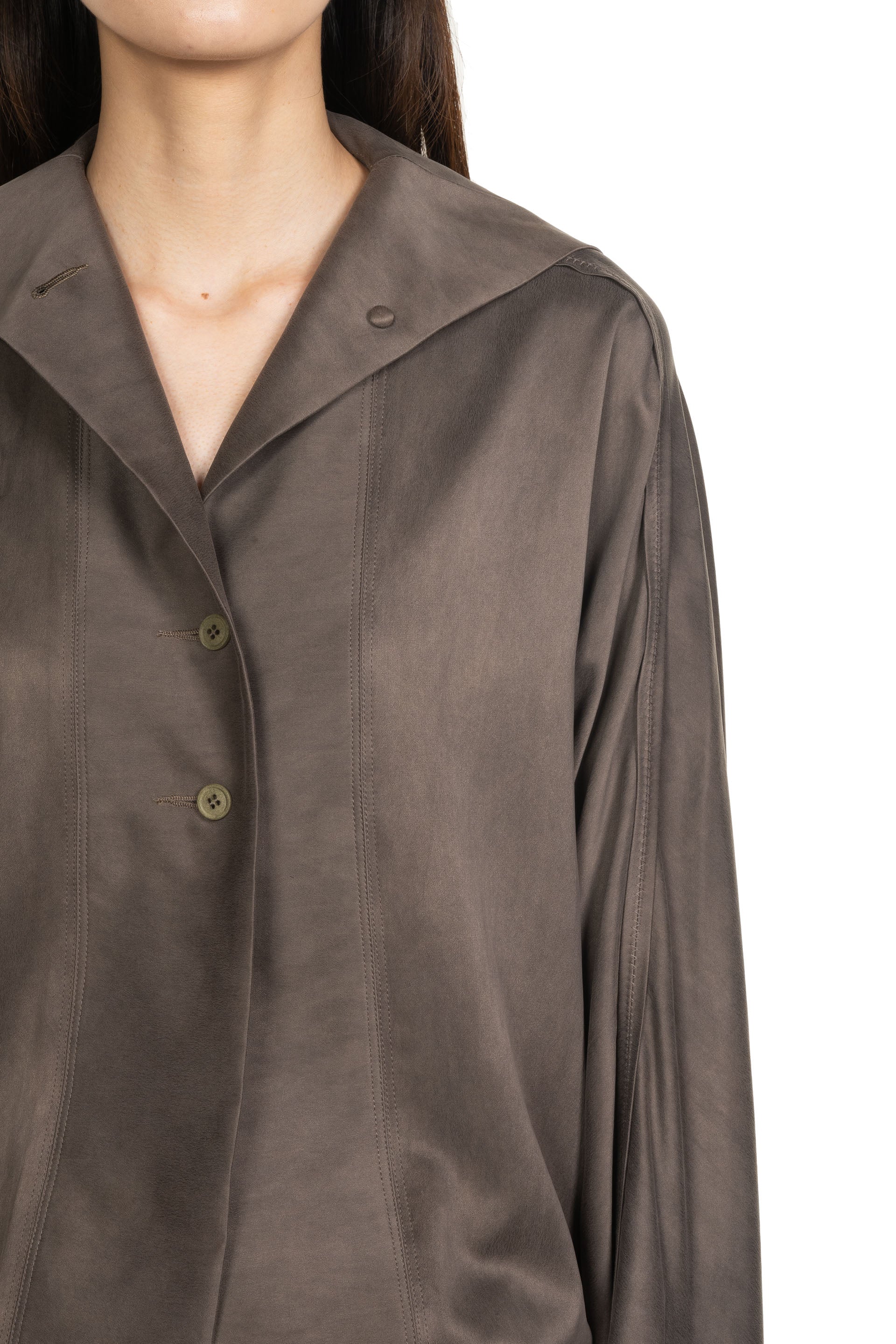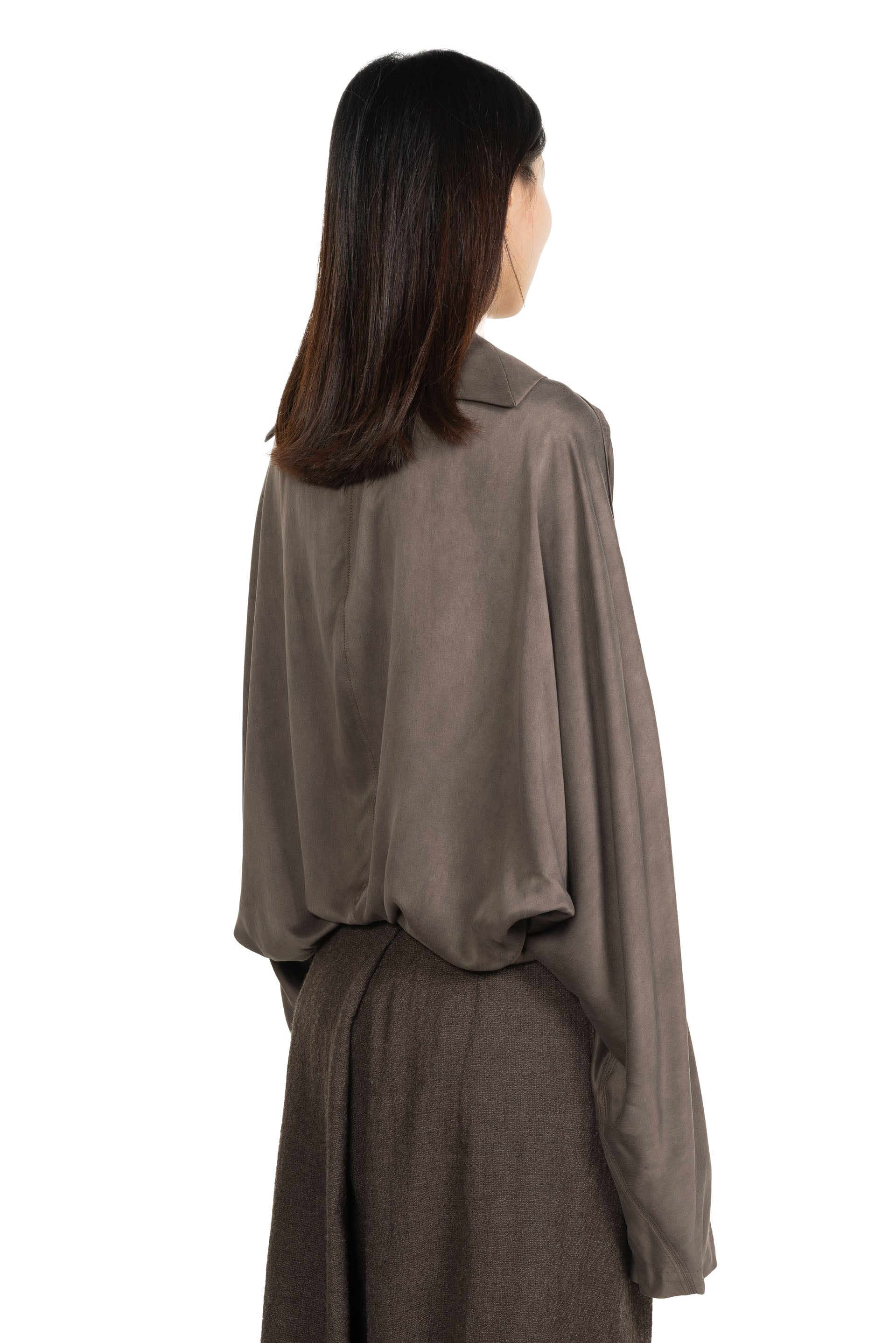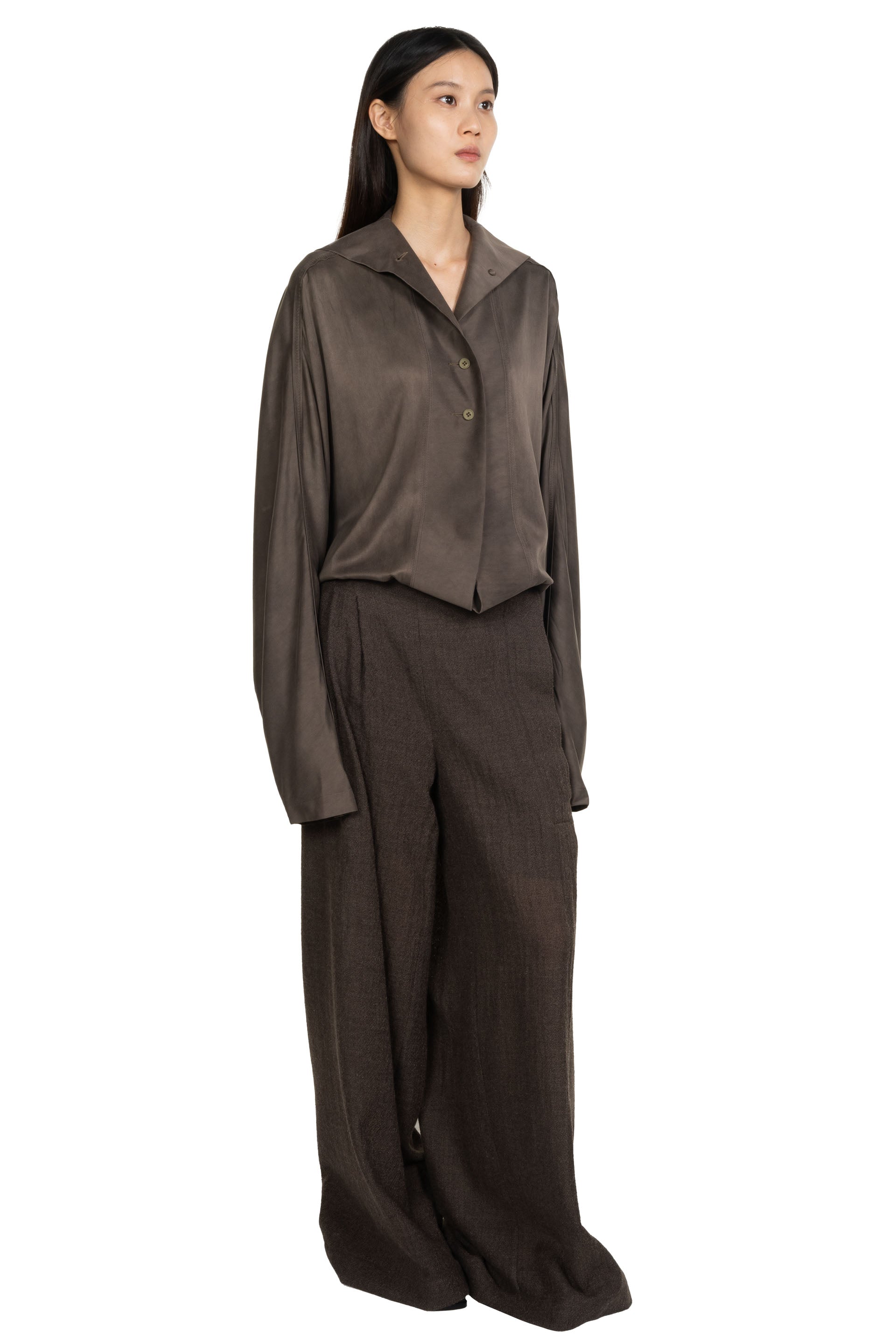 Yehuafan believes in feminine beauty with his own way to explain the smooth curve to compliment women’s body. He specialised in asymmetrical cutting and deconstructed silhouette as seen with the Deep Violet Shirt.