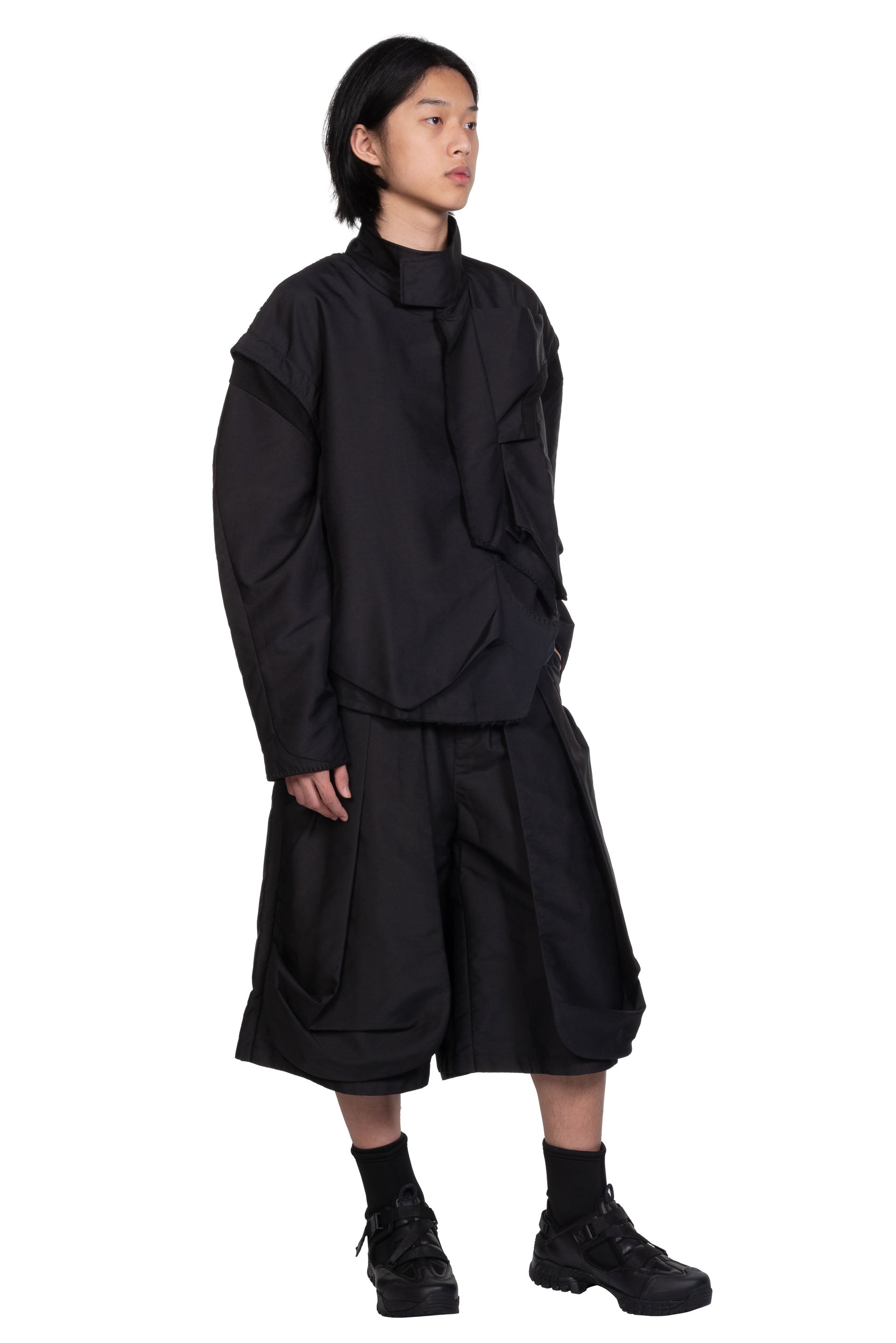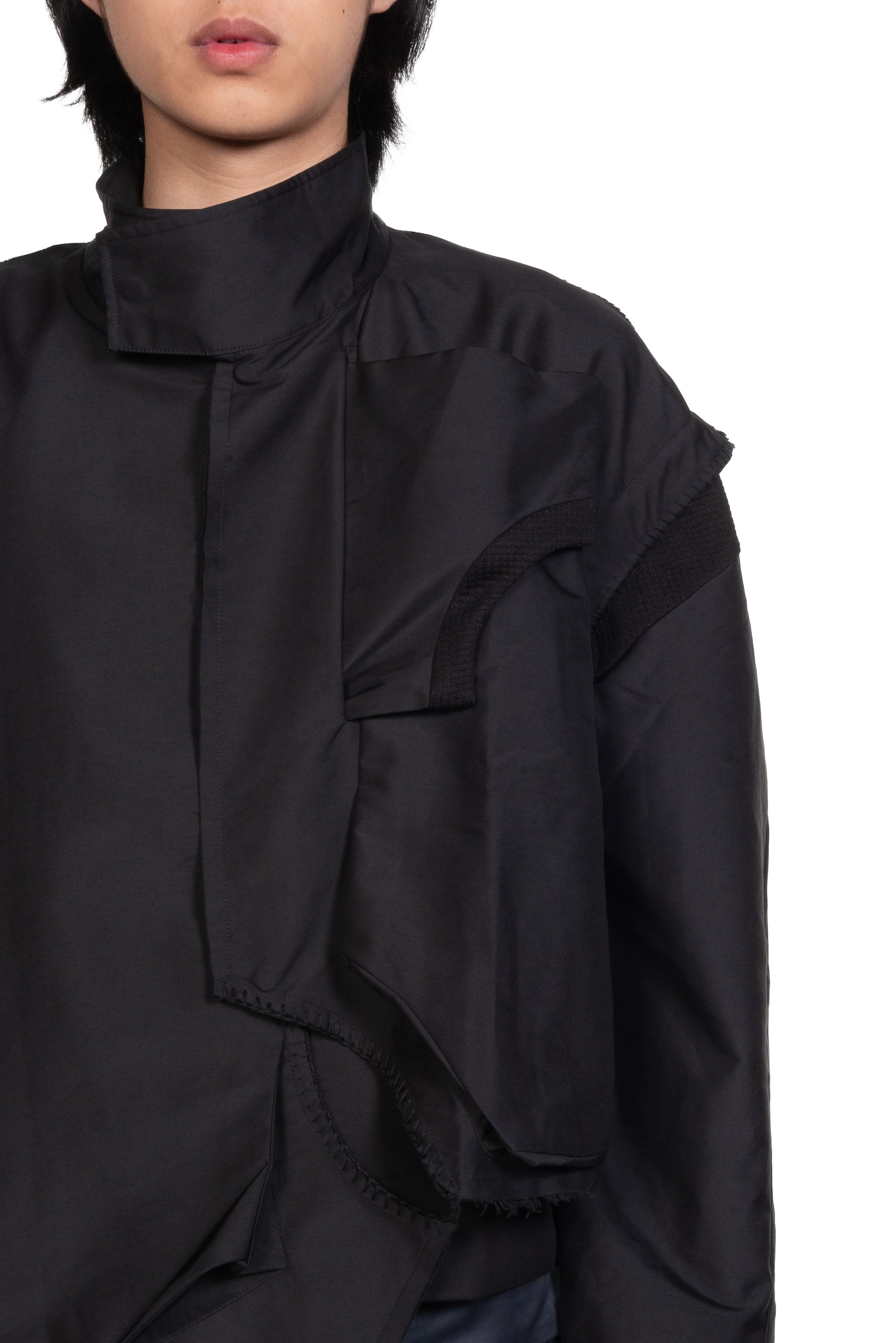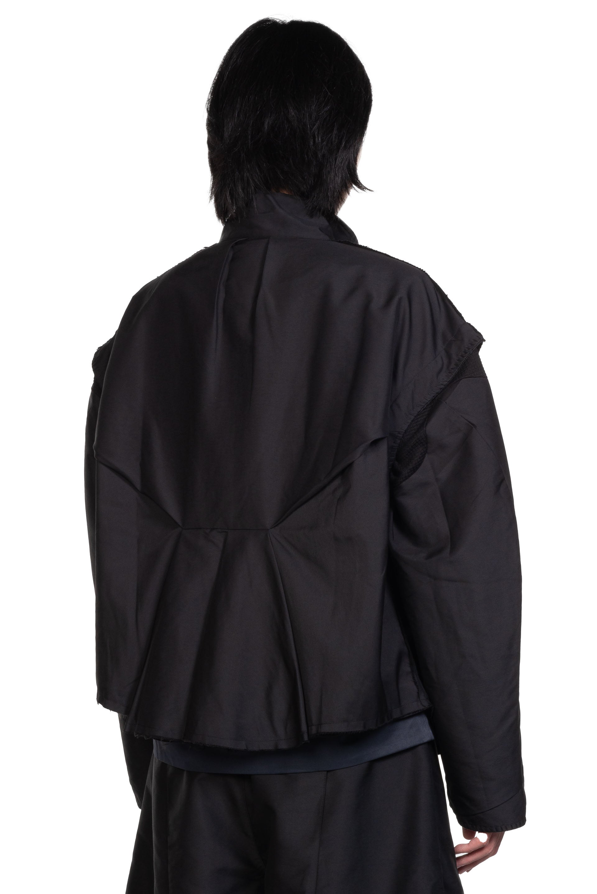 Nylon taffeta jacket. Waffle knit trim, blanket stitching, and raw edges throughout. Layered, panelled, and asymmetric construction. Press-stud closure. Seam pockets. Pleats at back hem. Full cupro satin lining. Logo-engraved black hardware