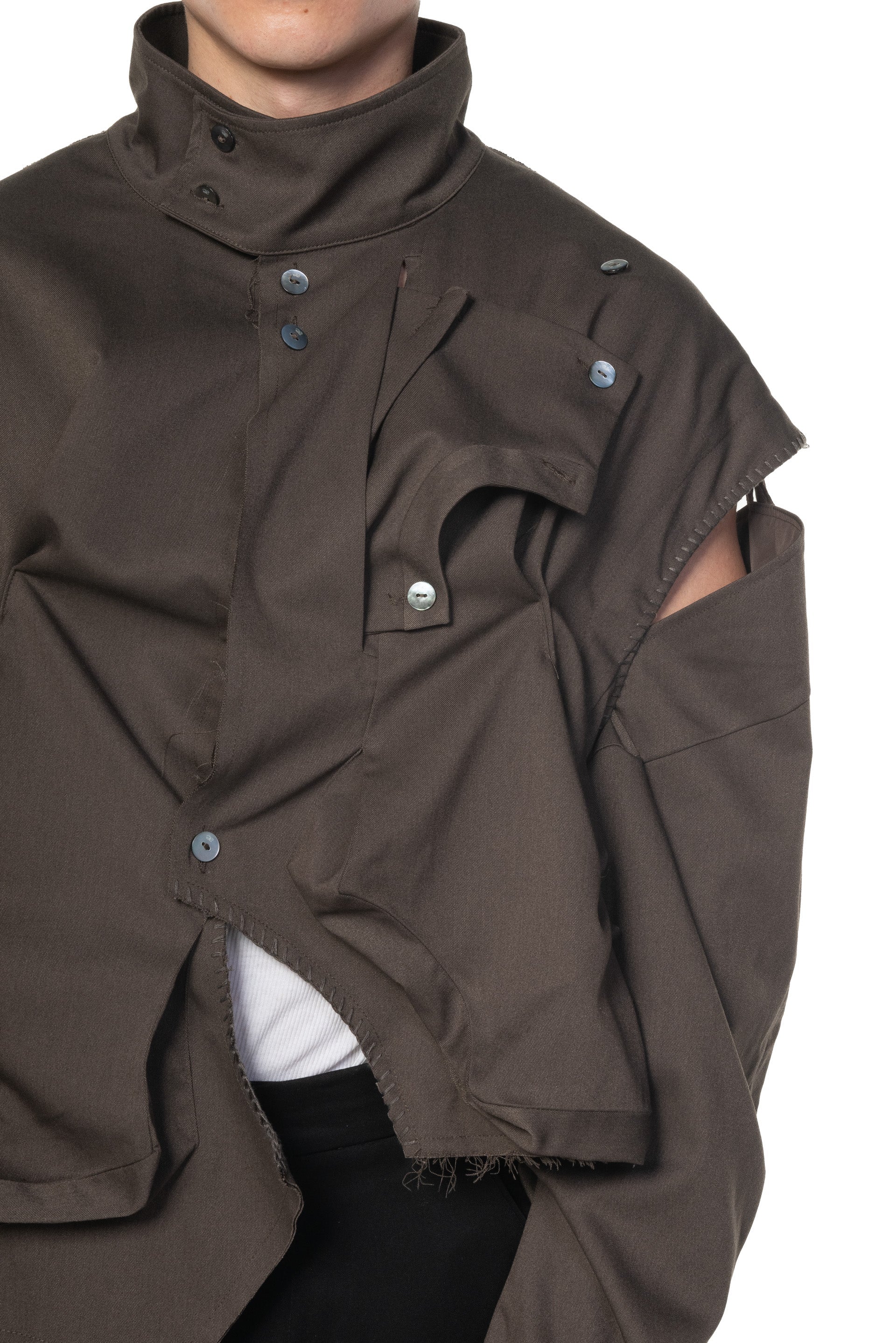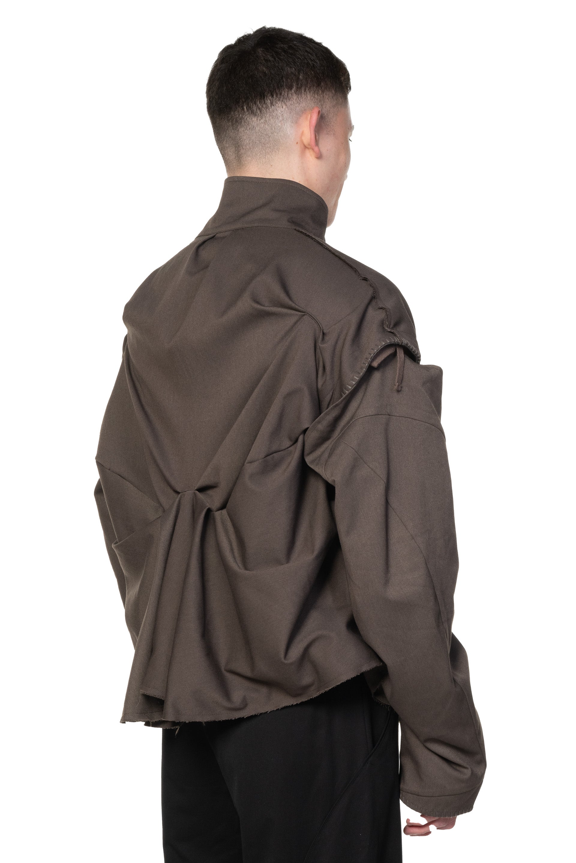 Stretch polyester-blend twill jacket. Gathering, draping, blanket stitching, and frayed edges throughout. Panelled and asymmetrical construction. Stand collar. Asymmetric button closure extends to collar. Welt pockets. Self-tie fastening at dropped shoulders. Ruching at dolman sleeves. Inverted box pleat at back collar. Full cupro satin lining. Logo-engraved mother-of-pearl hardware
