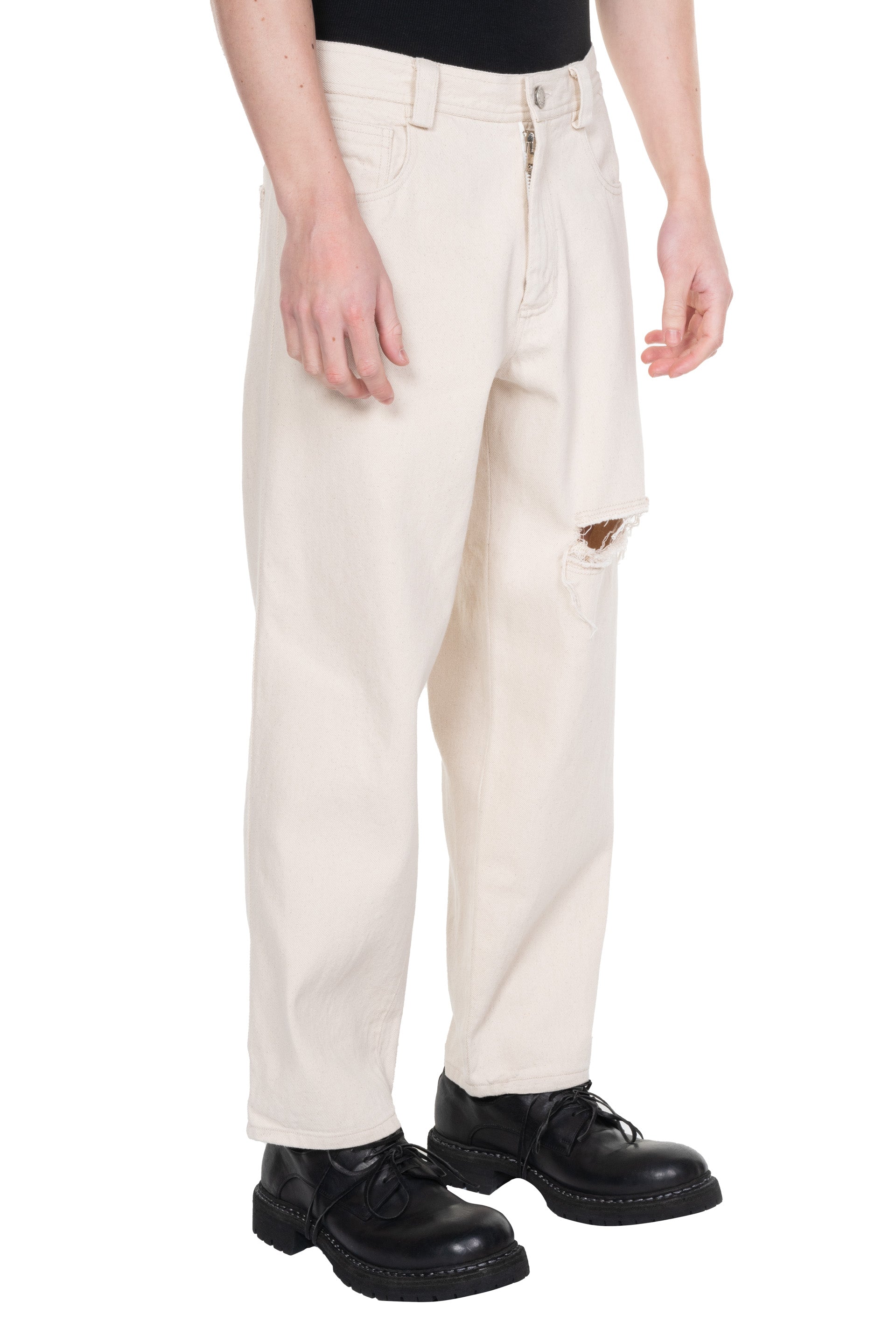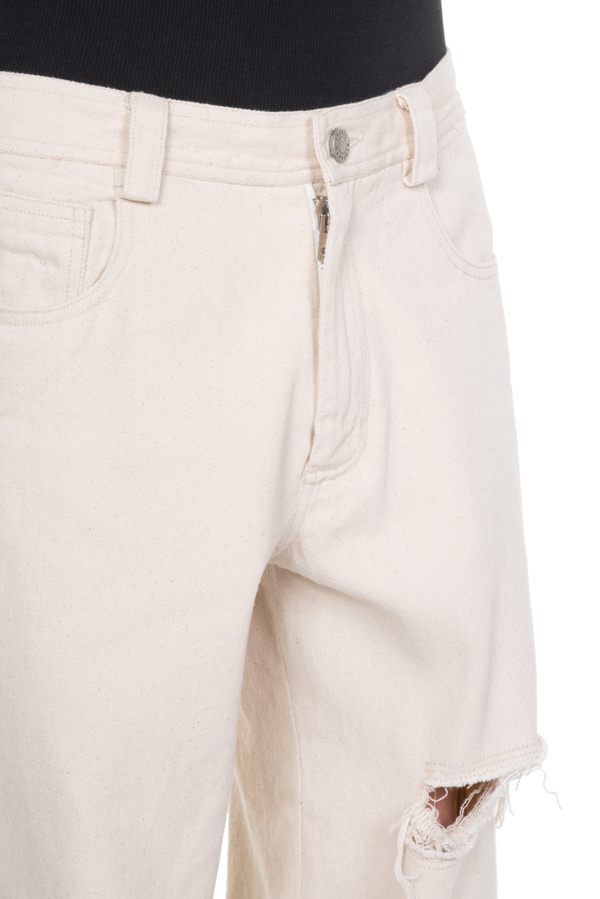 Button closure at waist. Zip fly closure. Two side pockets. Two back pockets. Wide leg. Distressed details.