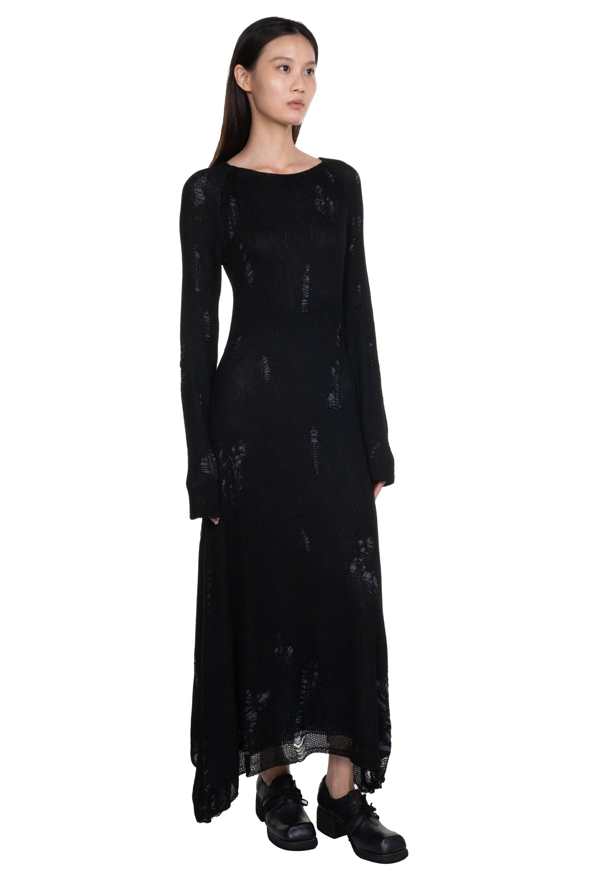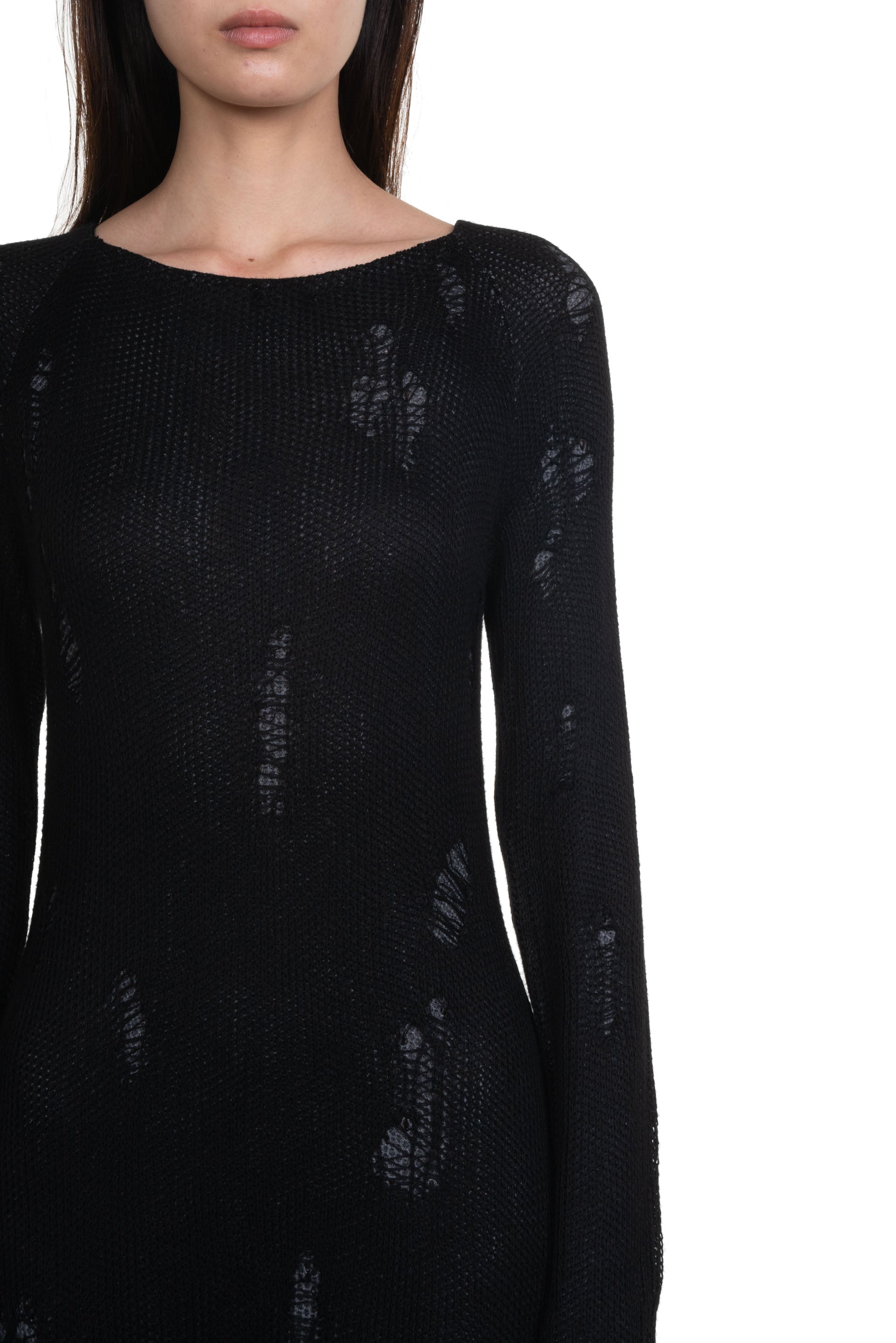 Black Destroyed Knit Dress from Professor e. Long sleeves. Distressed details throughout. Soft and light knitted fabric. Layered.