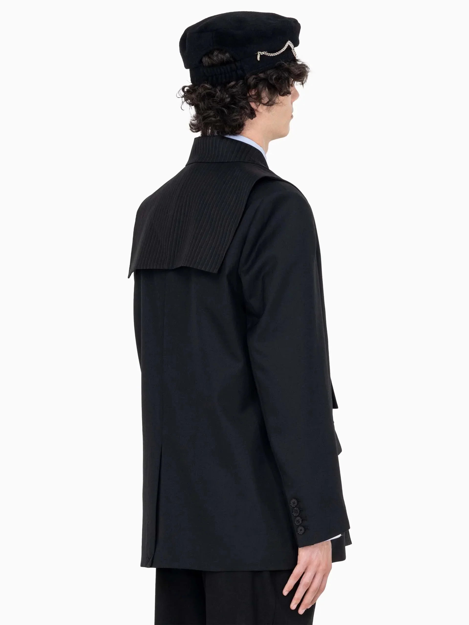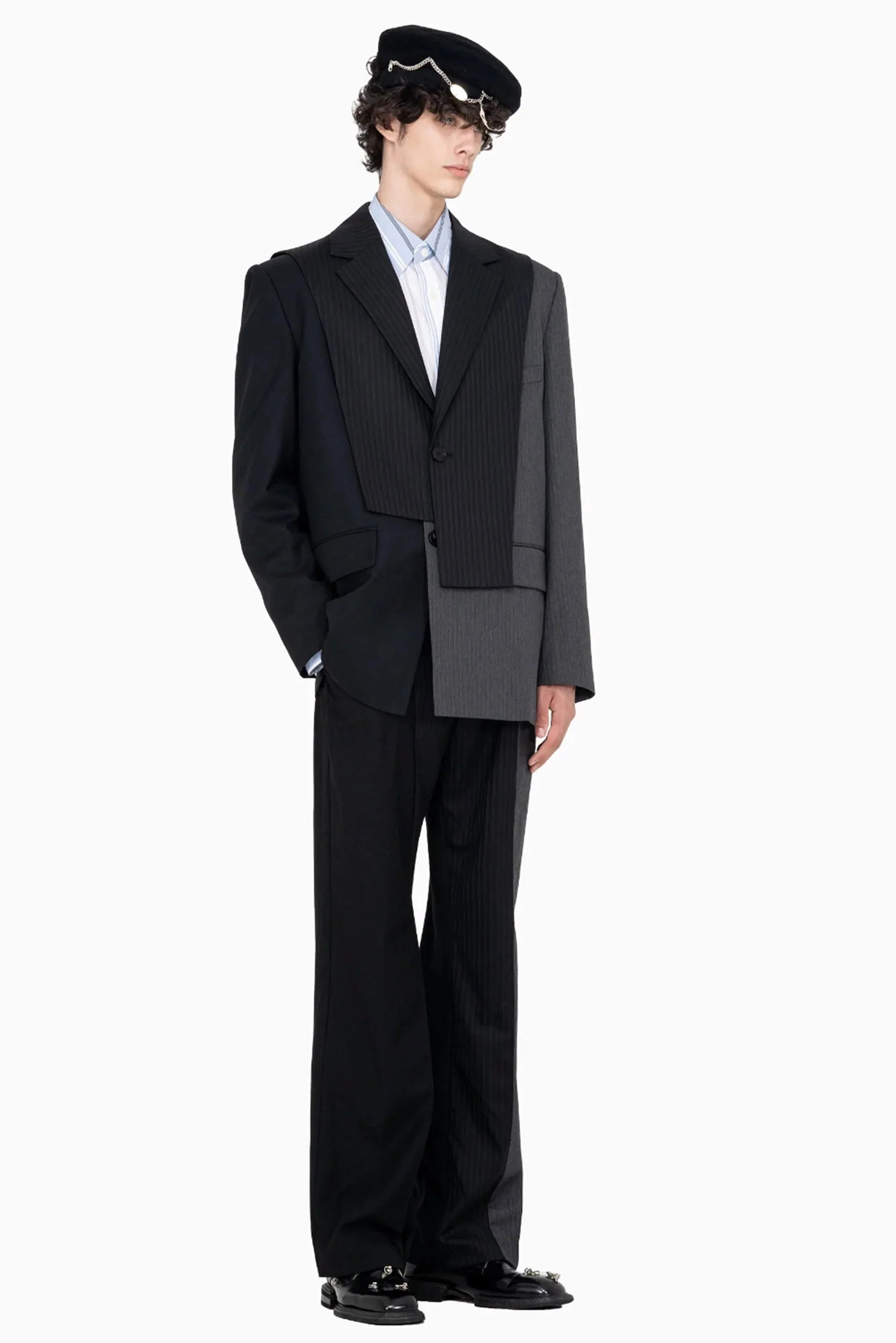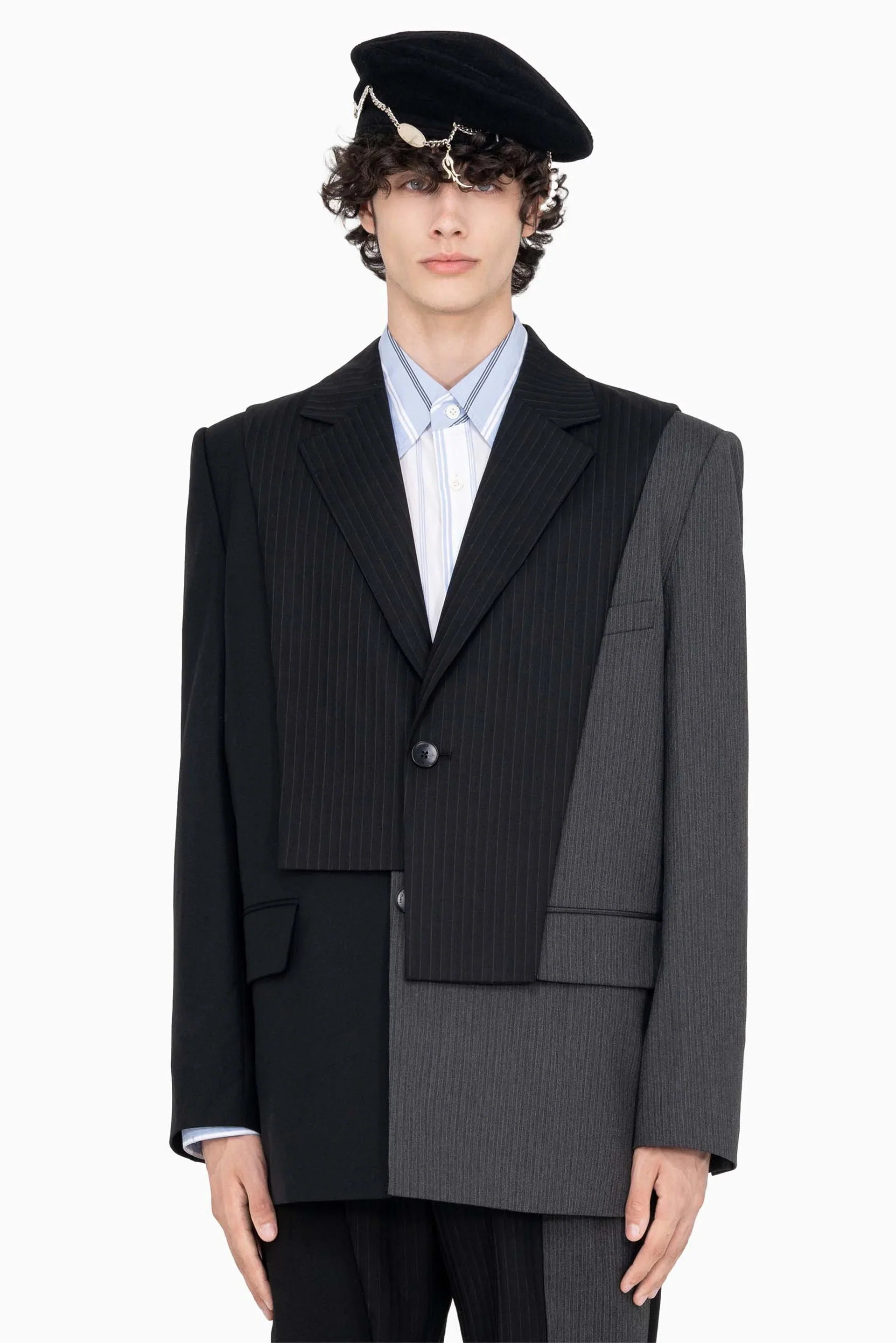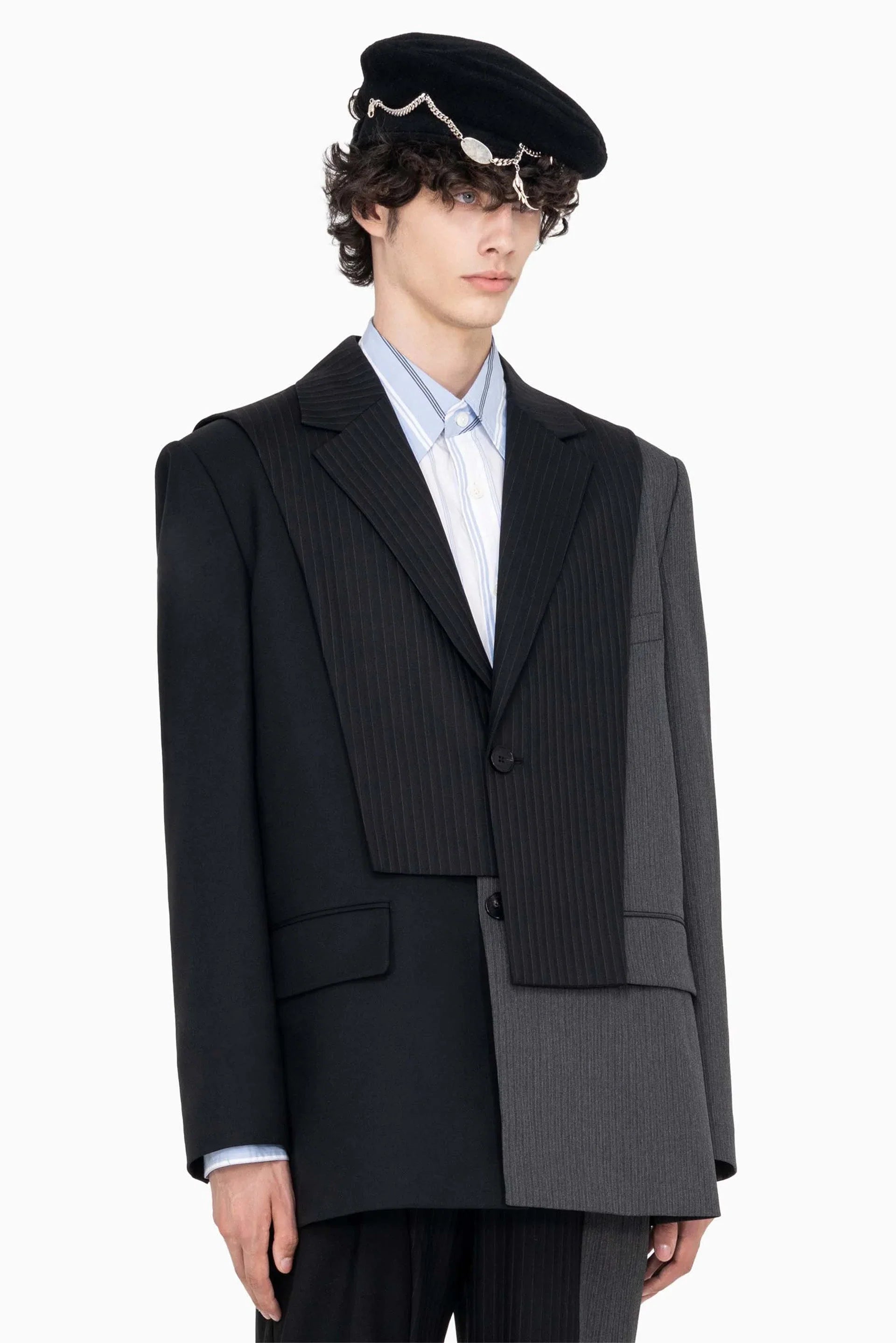 Two-in-one black and grey wool blazer is inspired by the Feng Chen Wang classic suit. Detachable pinstripe lapel layer creating a separate piece. Can be worn in multiple ways. Button Closure at front. Long sleeves.