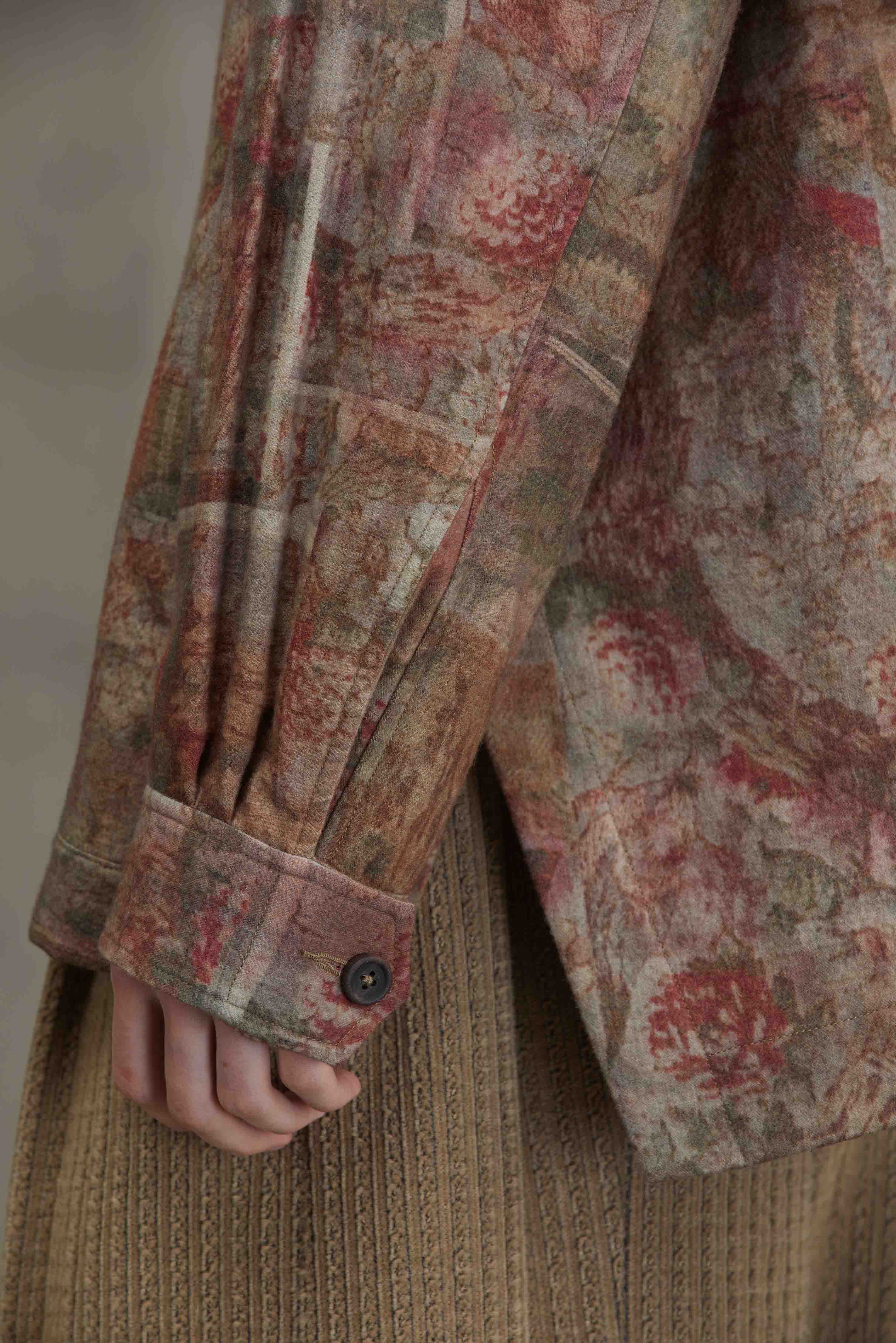 Ziggy Chen worker shirt with digital seasonal print. Long sleeves. Button closure at front. Button closure at cuffs. Two front pockets. Classic collar. Slit at sides. Seasonal print throughout.