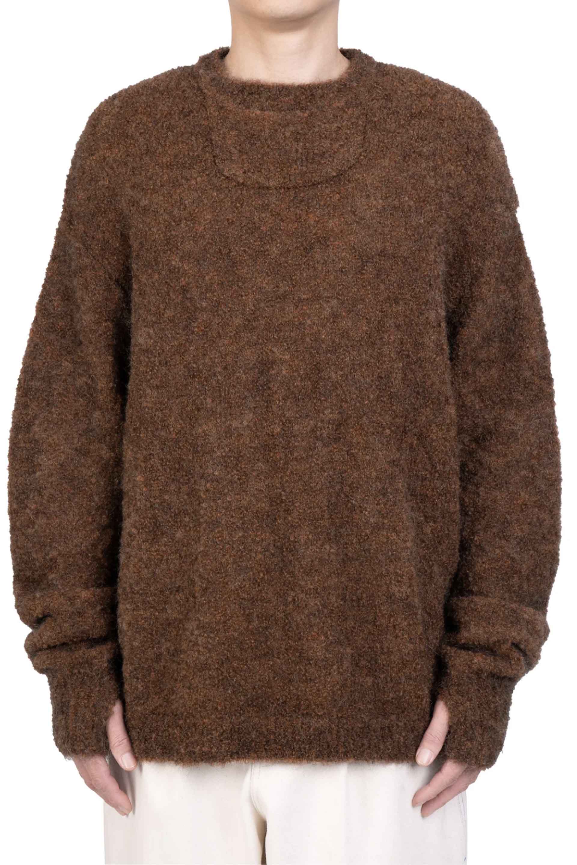 Knitted sweater from Joe Chia. Knitted crew neck sweater with rib knit collar and cuffs. Featuring a slot collar along front neckline. Thumbhole at cuffs. Oversized fit.