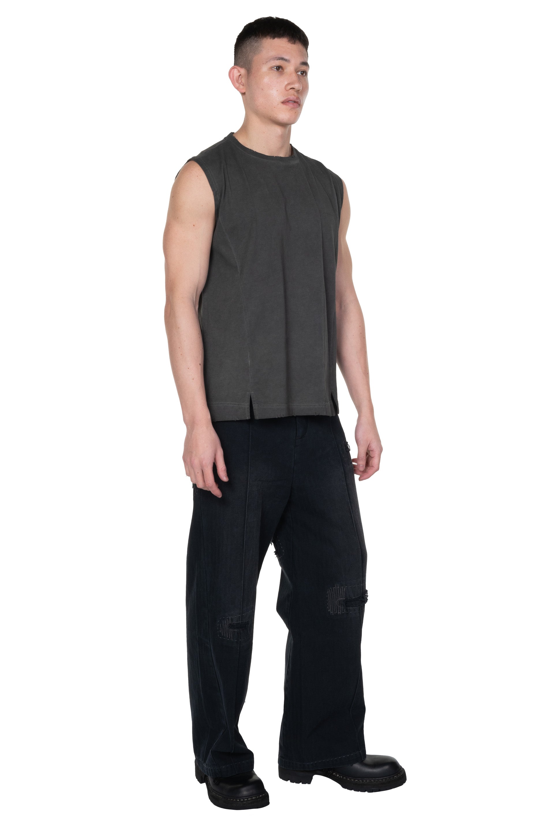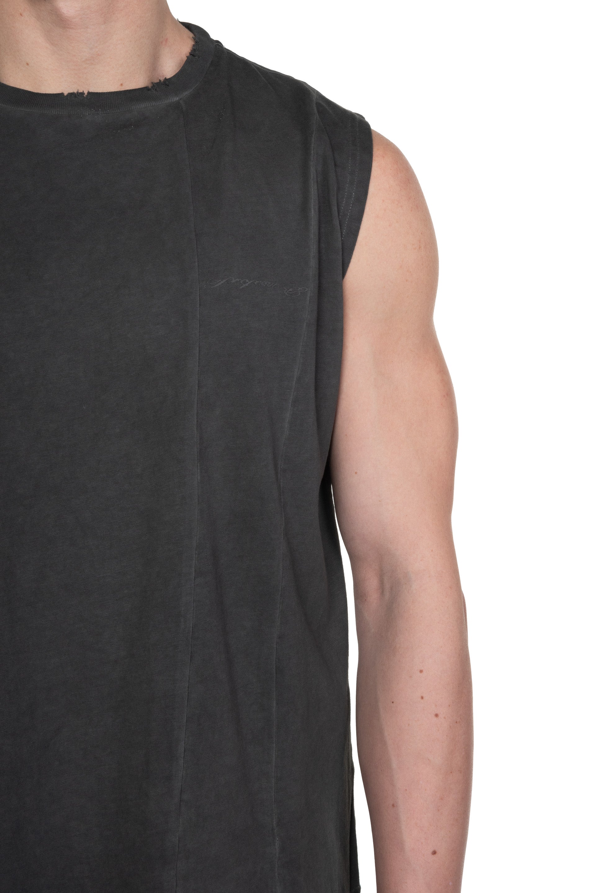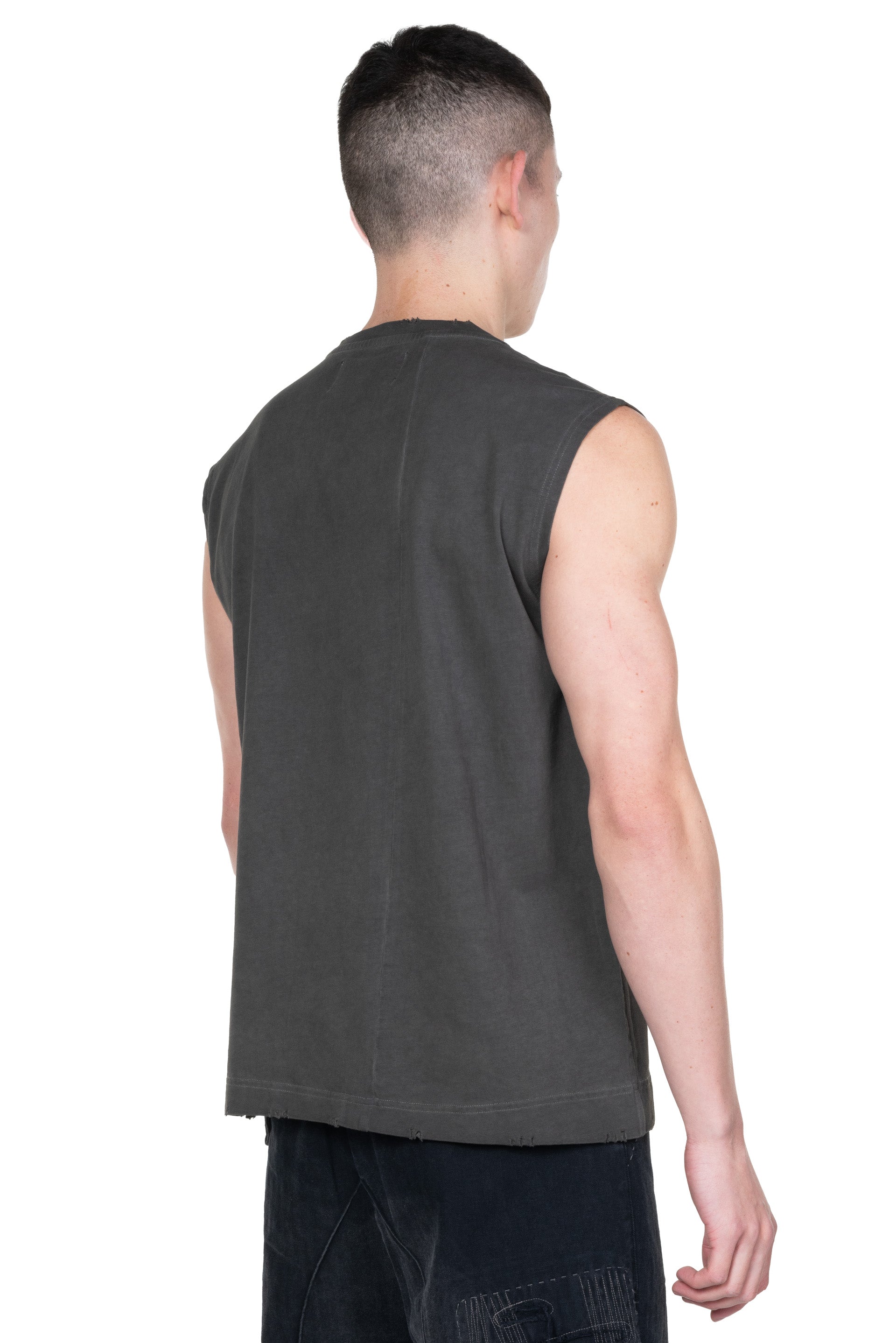 Professor. E "Dirt" Vest 2.0 Cold Dyed Grey. Sleeveless. Round neck. Grey dye colour. Slit at bottom. Regular fit. Distressed details throughout. Logo embroidery at chest
