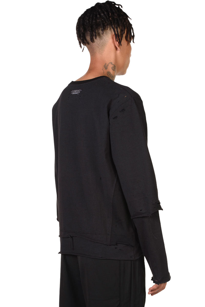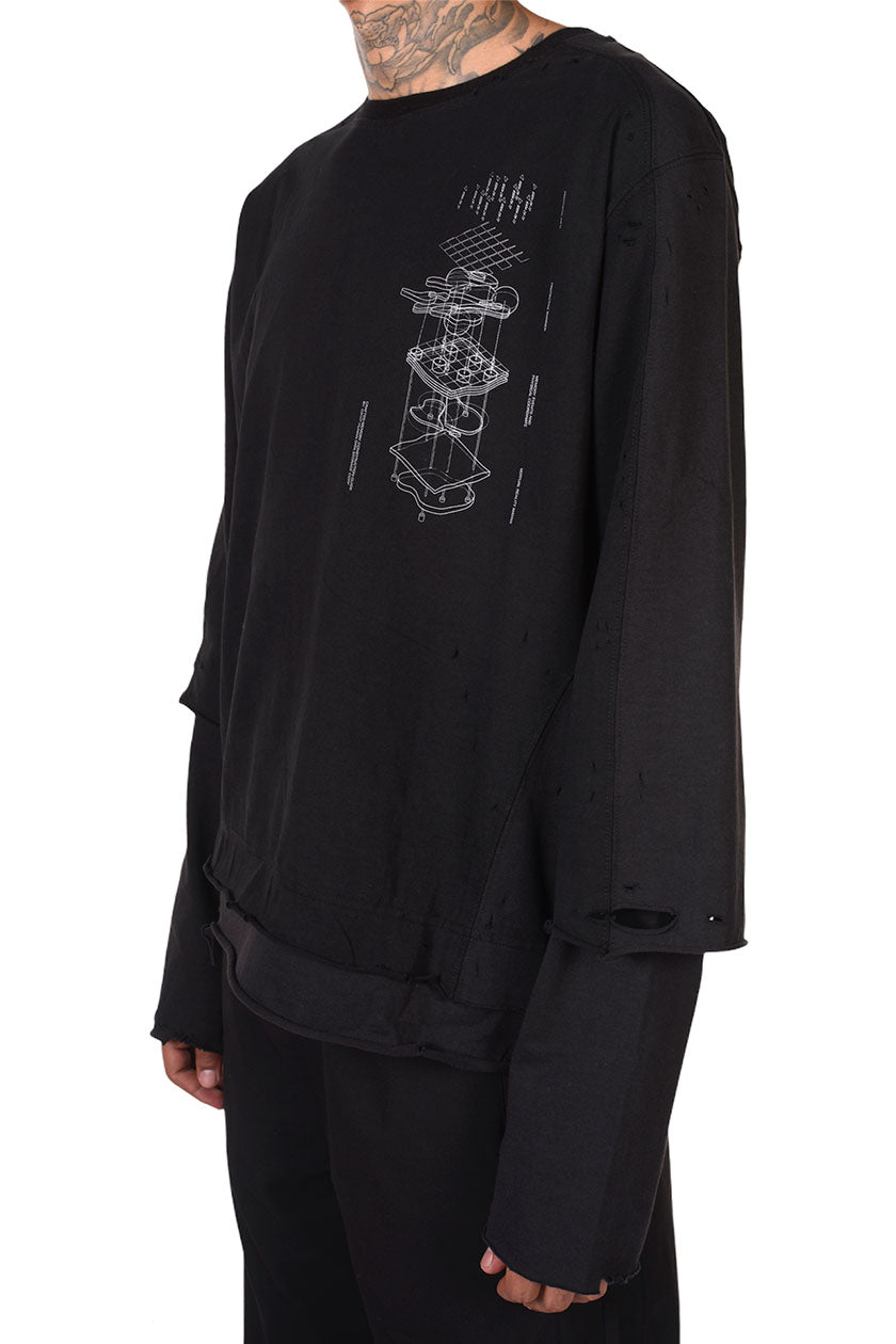 C2H4 concept ranges from hypothetical space scientists producing sport and streetwear-inspired designs creating an intergalactic underground culture. Using her studio as a laboratory, Chen’s meticulously elevates wardrobe cornerstones as seen with the Distressed Double Layer T-shirt.