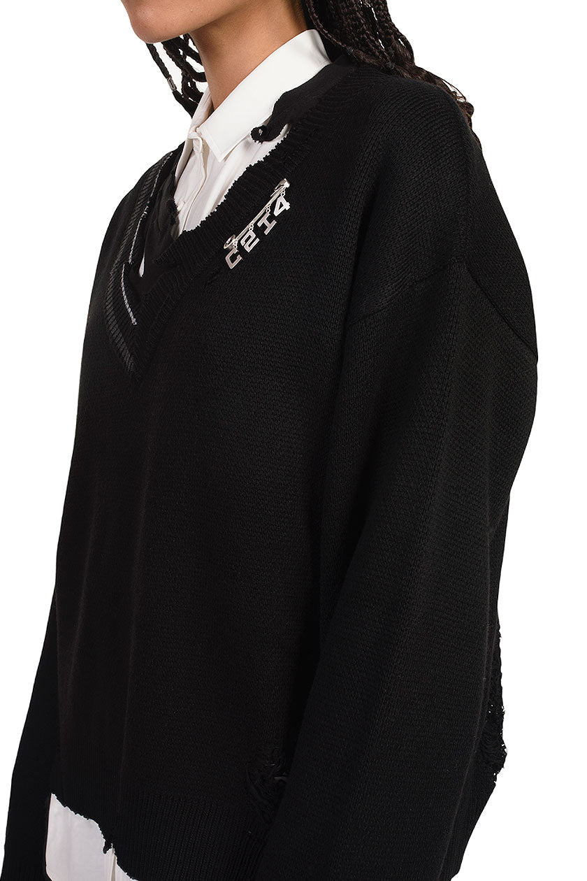 Layering V-neck Collar. Rib Knit Cuffs And Hem. Comes With White Gold Coated. Brass Safety Pin Set. Distressing Throughout.