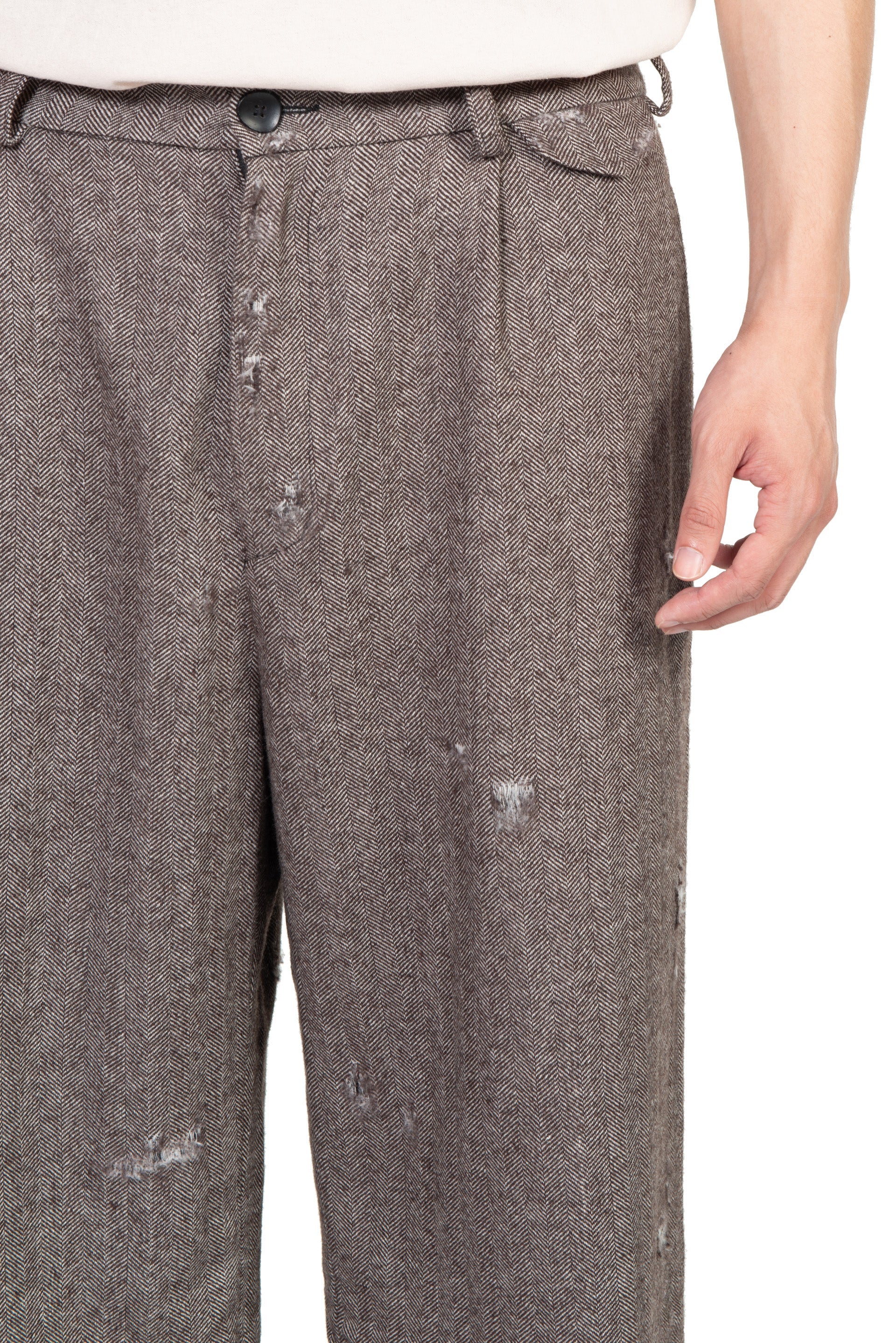 Peng Tai creates modern silhouette with traditional chinese philosophy. Inspired by how Chinese herbal medicine regulates the body from the inside out, Peng Tai aims to research and develop a way to boil Chinese herbal medicine with fabrics, to create clothes that feel like a second skin as seen with the Distressed SL Trousers.