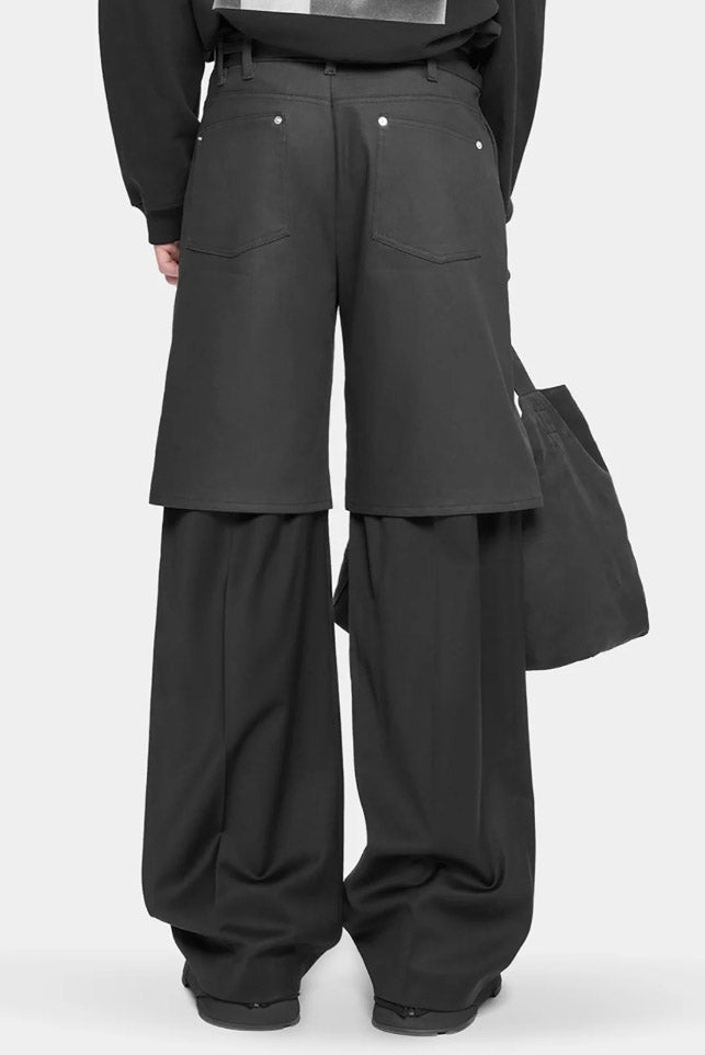 HE trousers featuring a mixed-material design, with denim shorts layered over cool wool trousers. The front includes slant pockets, while the back has patch pockets and a classic yoke for added detail.