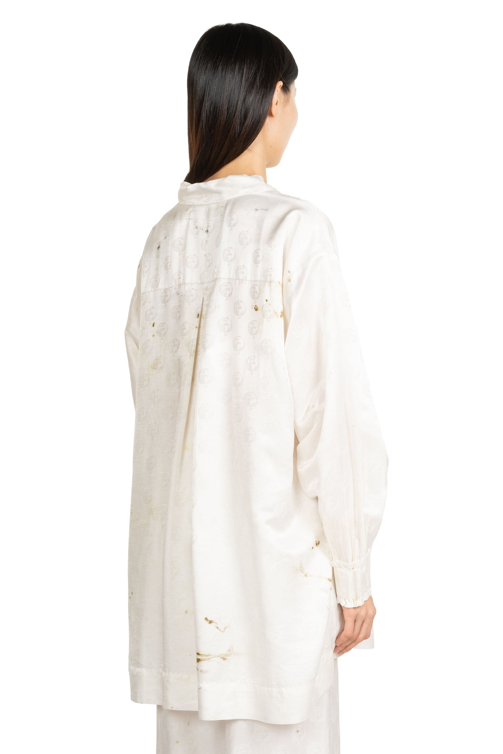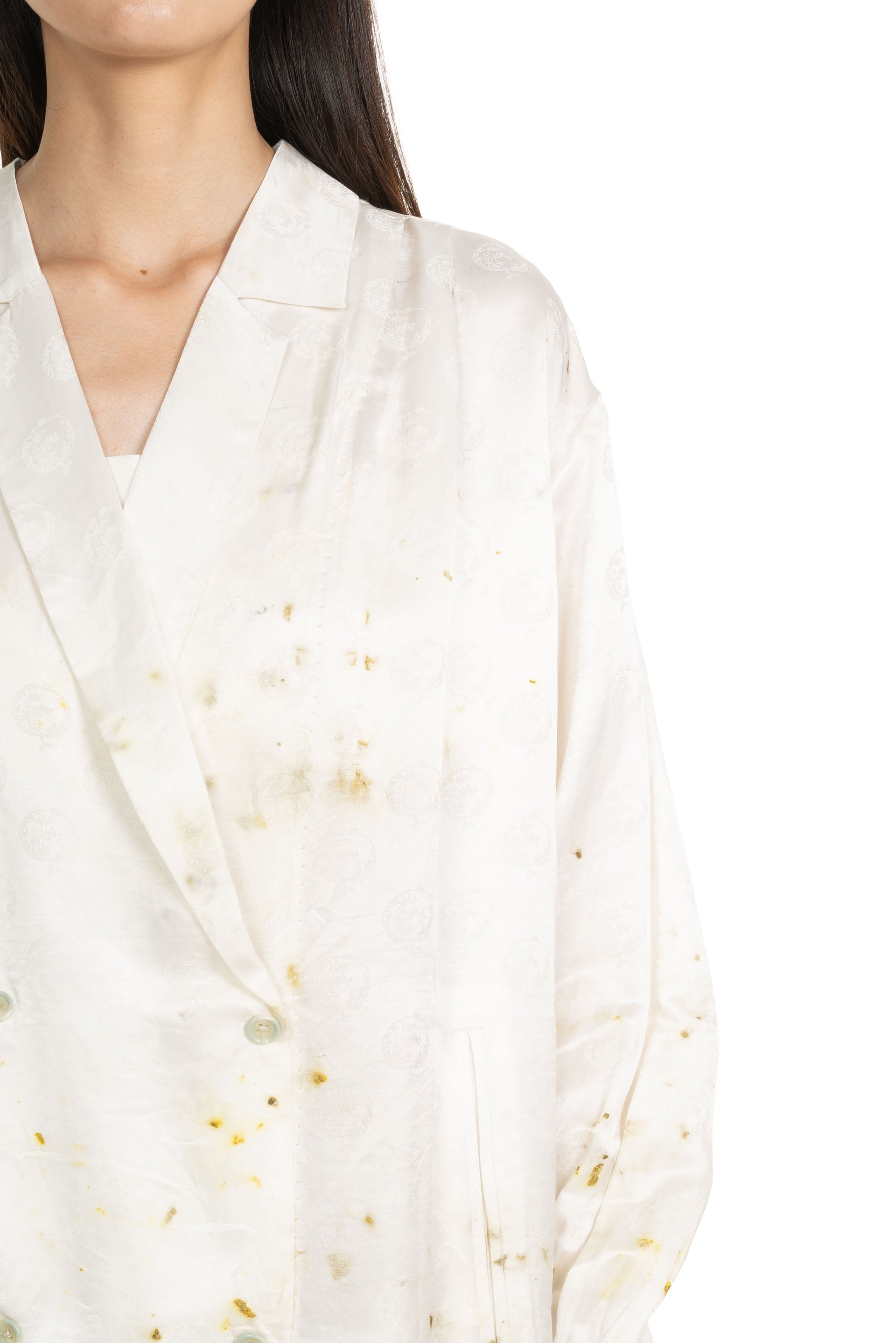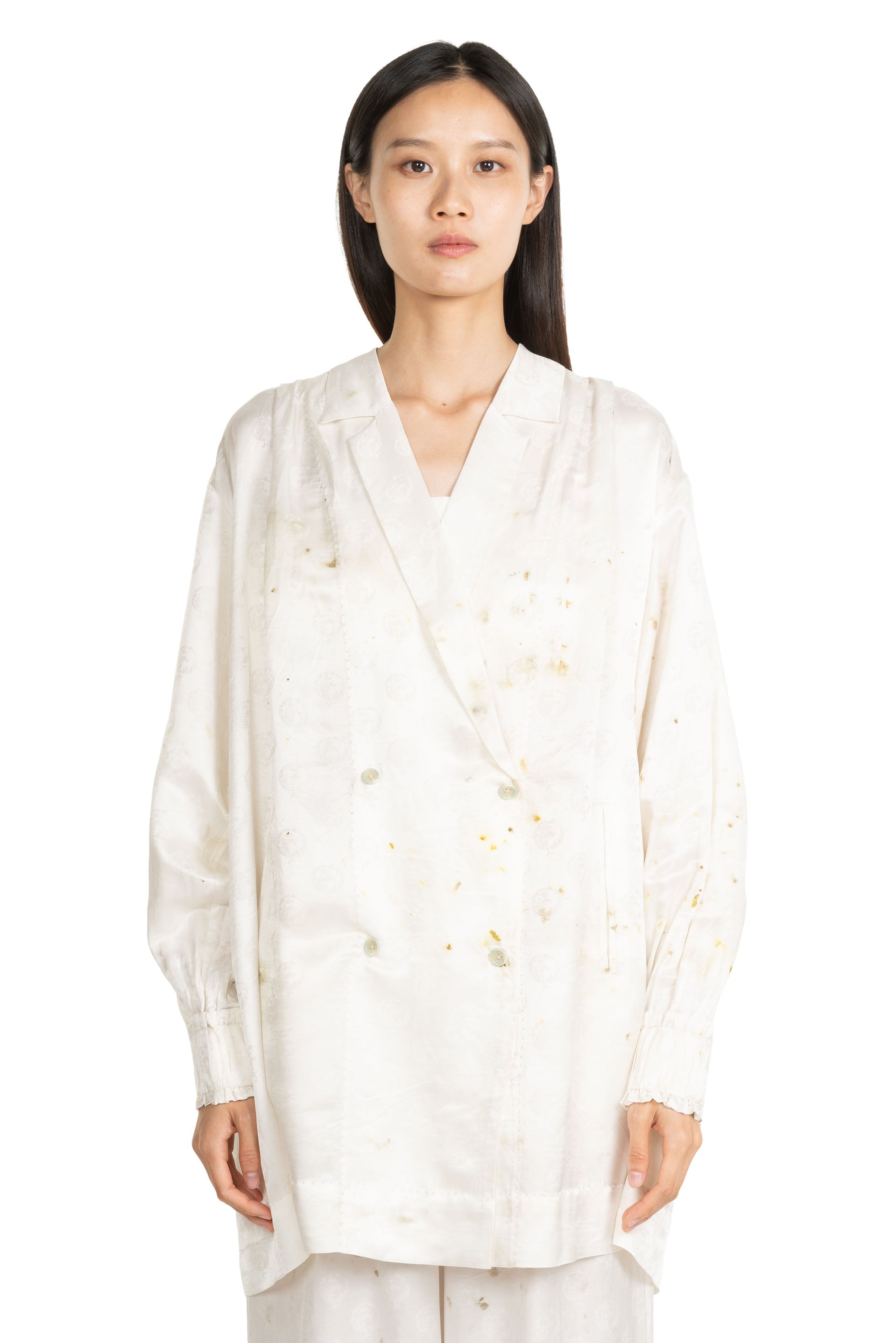 Yu Qun believes that everyone's character is multi-faceted and expressing spiritual independence. Fine hand-stitched threads, old mottled colours and patterns, and unconventional cuts are what Mute Dance has been exploring. The leaves and stems of fresh plants and berries, dried medicinal materials, old metals and so on are combined with the ancient and traditional dyeing technology to dye fabrics and paper as seen with the Double Breast Hoary Jacket.