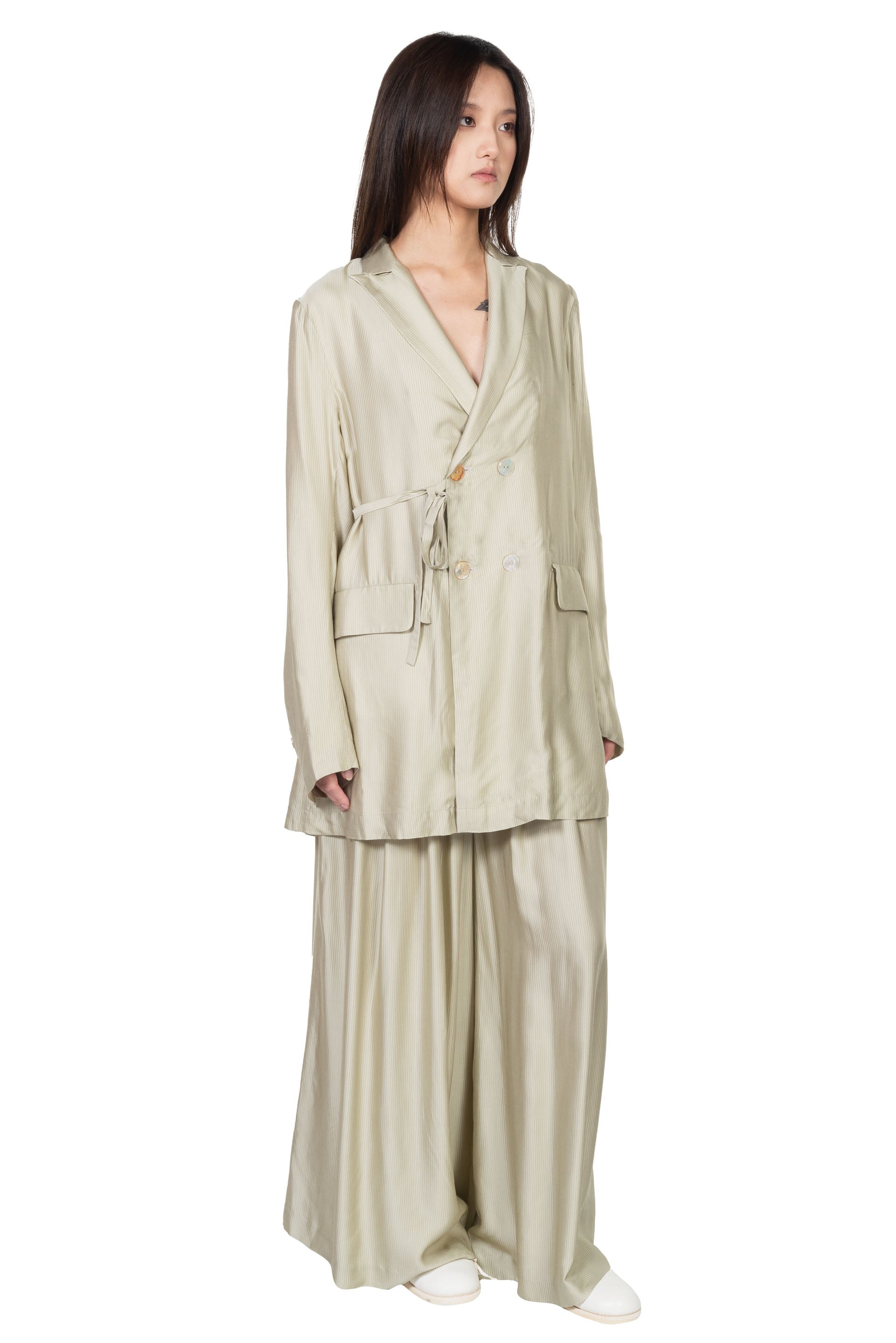 A Tentative Atelier aims to explore artistic handicraft elements and innovative forms and silhouettes on garments combining with neo-vintage effect. The label does not only focus on fashion, it is a platform to encourage and sustain the spirit and tradition in craftsmanship to create new form as seen with the Double Breasted Drape Stripe Jacket.