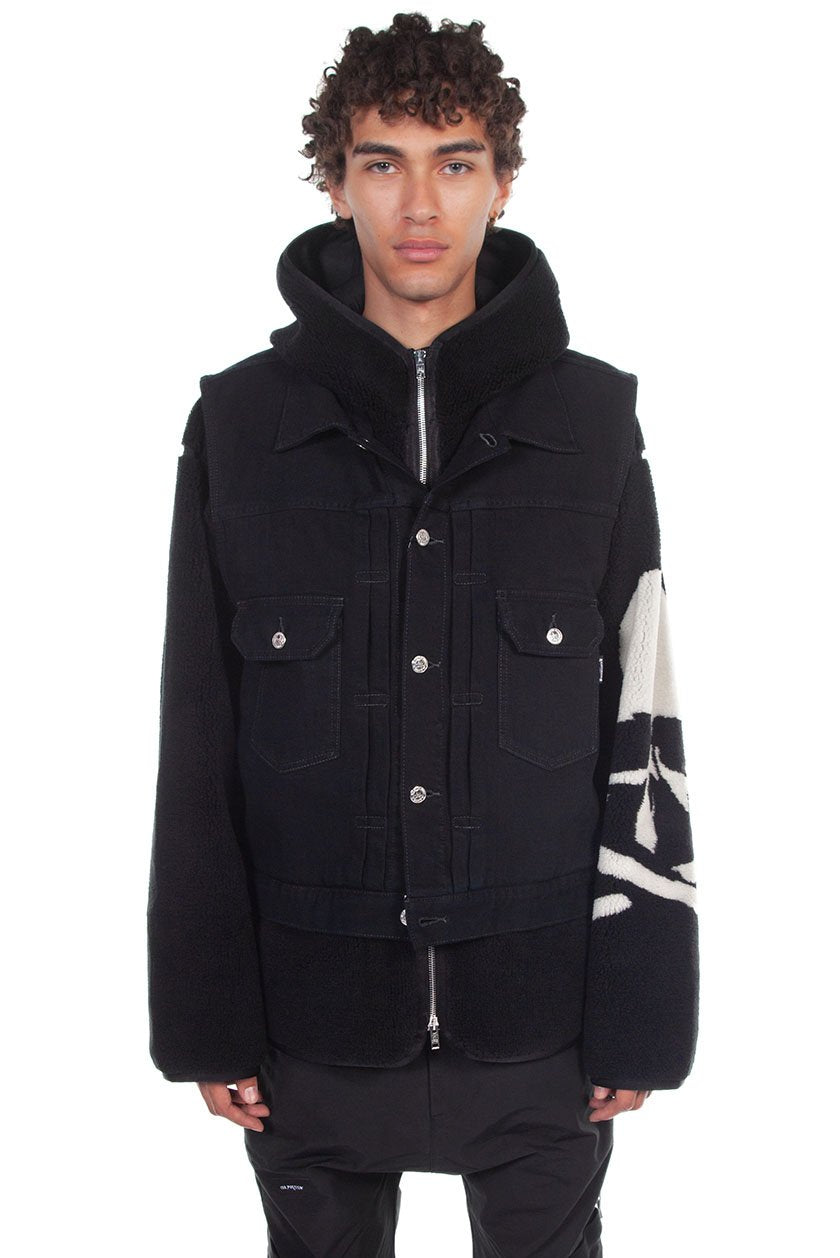 Denim vest. Pointed collar. Relaxed fit. Front button closure. Button cuffs. Curved hem. Contrast stitching. Front zip fastening. Side zip pockets Colour: Black Composition: Cotton/Fleece. Made in Japan