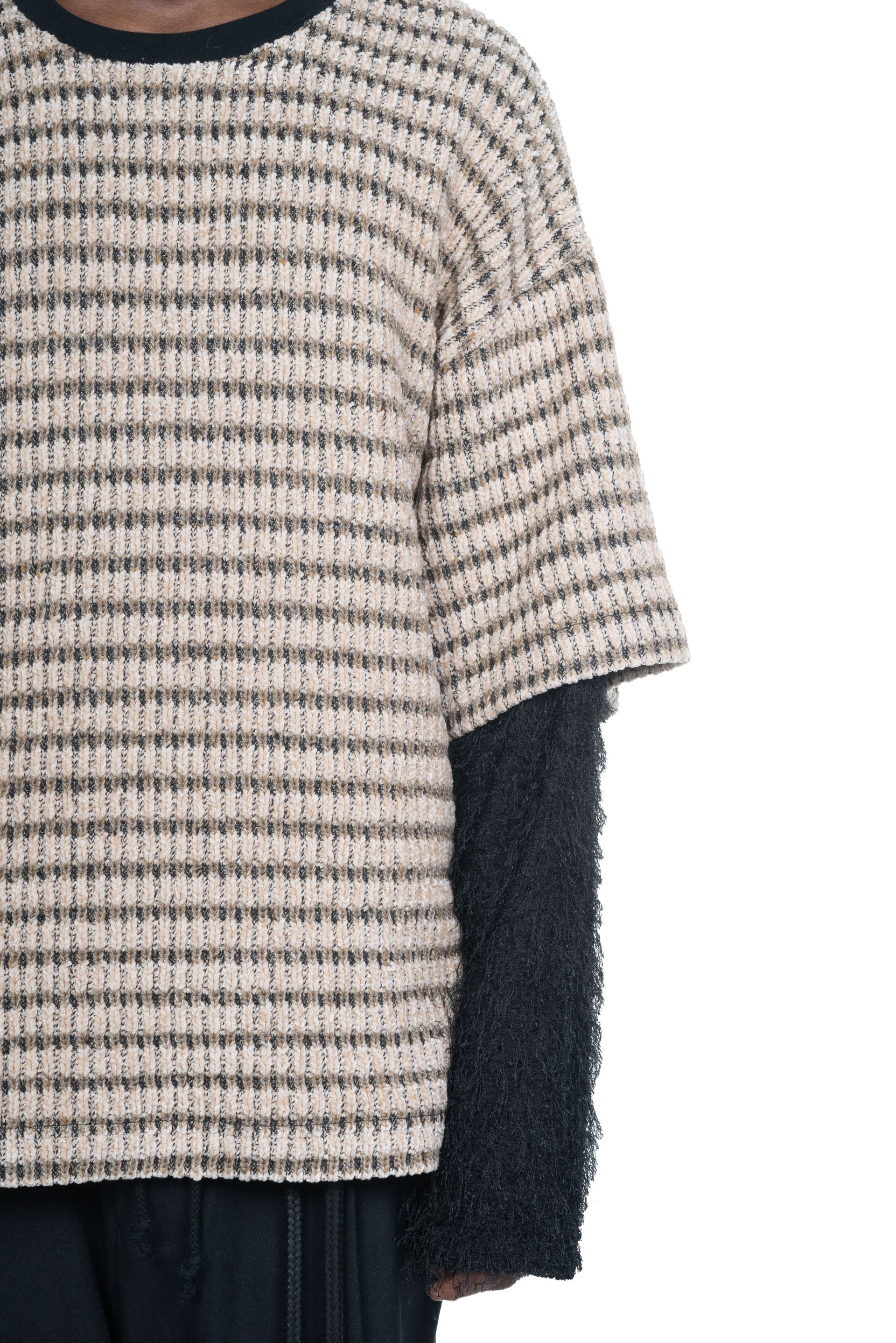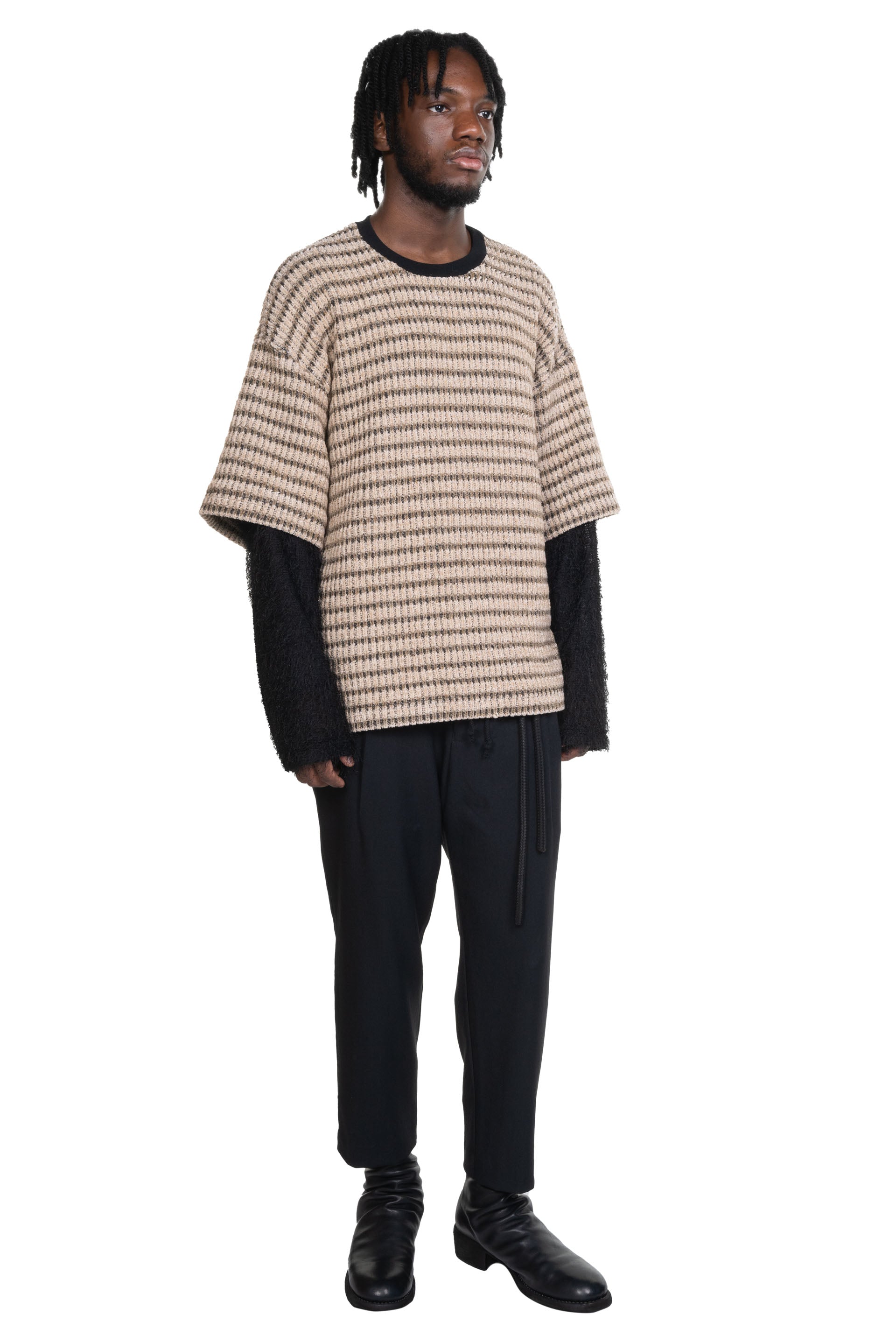 Double layered oversized pullover in a ribbed poly acrylic blend. Featuring dropped shoulders, cotton ribbing and double-layer effect sheer shaggy sleeves.