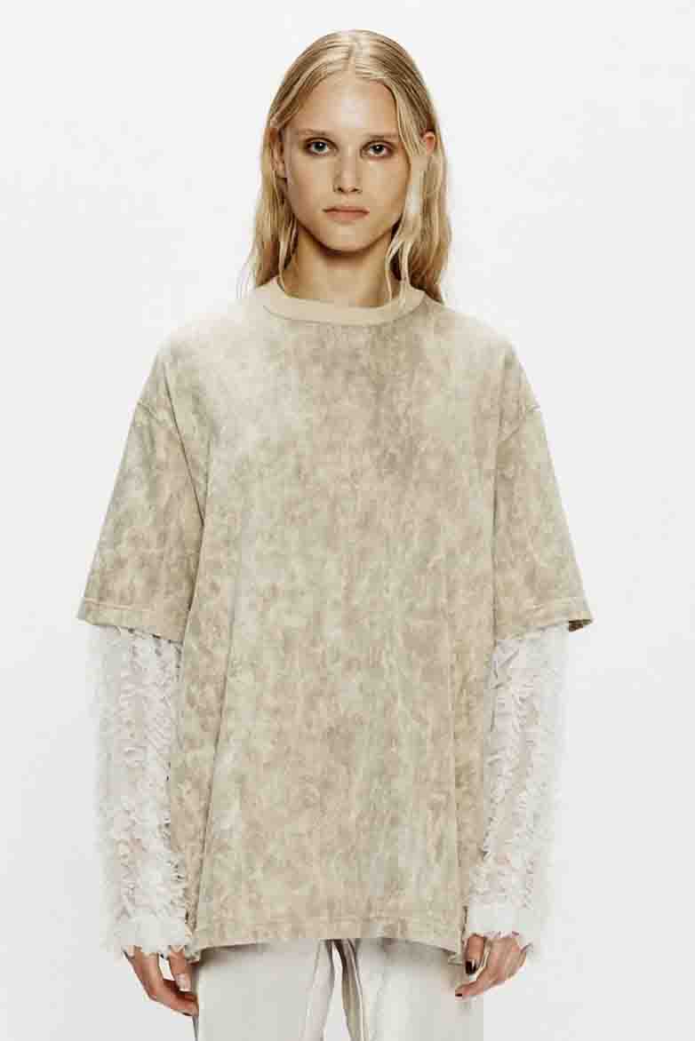 Founded in 2010 by childhood friends Melvin Tanaya and Lyna Ty, Song for the Mute is all about choosing materials carefully. The duo meticulously develops, samples, and selects fabrics in collaboration with artisanal Italian and Japanese mills before patterning their intimate, story-driven collections as seen with the Double Layered Tee Tie Dye Jersey Beige.