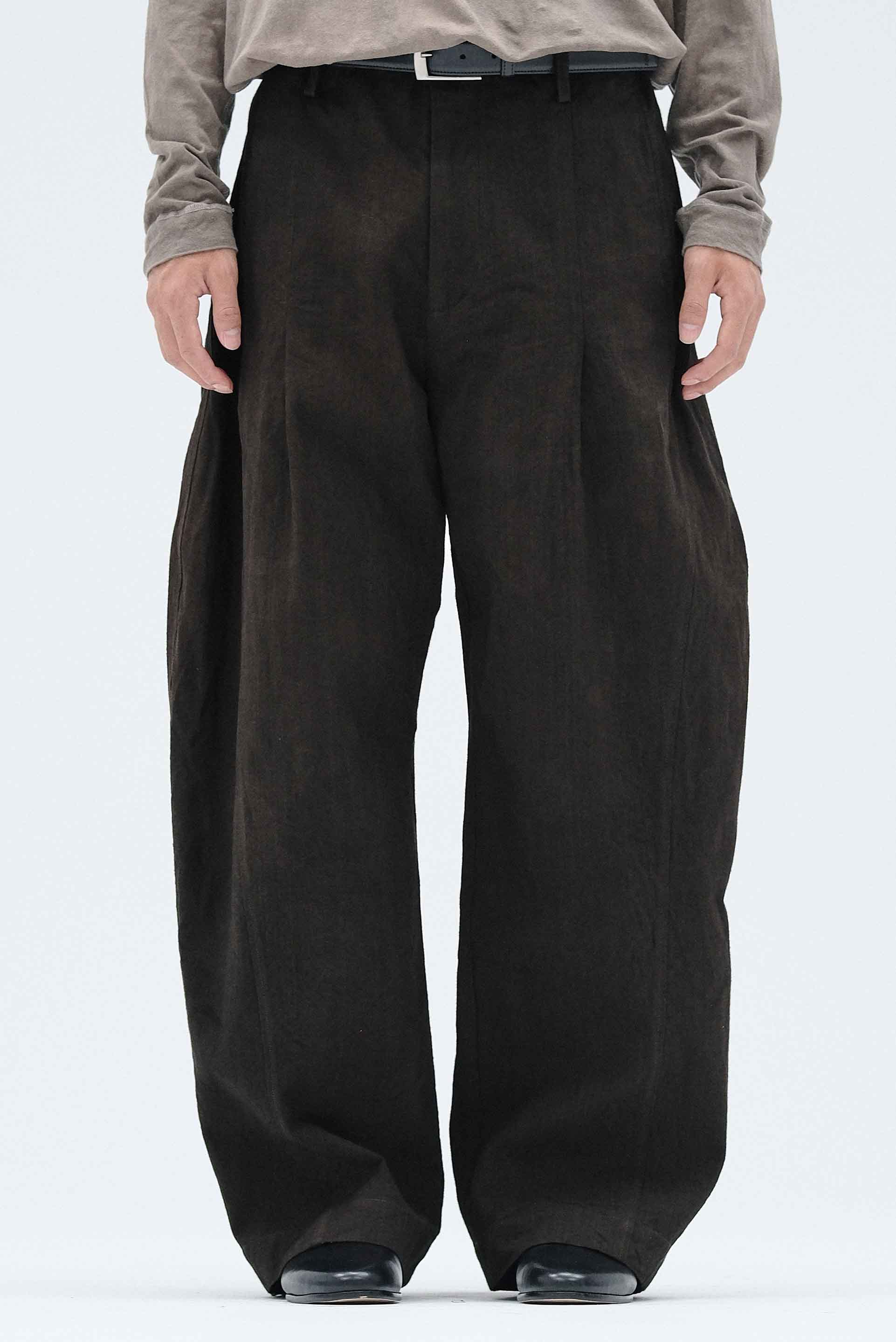 ATTEMPT reconstructs different styles and elements to create a new aesthetic system. By taking a more experimental approach to creation and production, which involves an understanding of the past and the current form of society, Attempt is creating an aesthetic form that is anchored in the present but different from it. It must ultimately be a product that cannot be defined as seen with the Double Pleated Vase Pants Black.