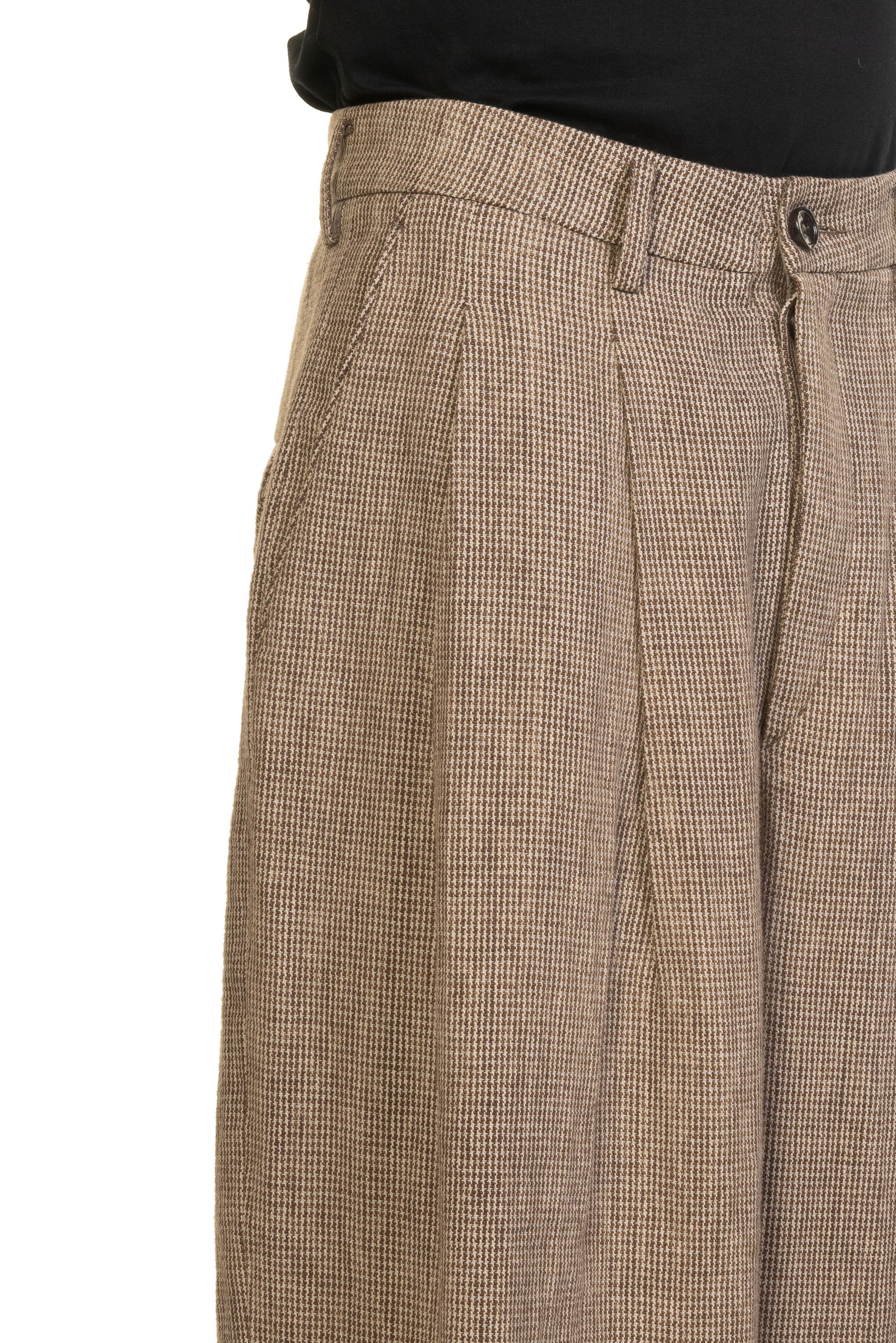 Pants with Multiple Pleats. Button closure at waist. Drawstring with signature fabric. Fully lined. Double pleats. Loose fitting. Two side pockets. Two back pocket. Soft textural Houndstooth fabric.