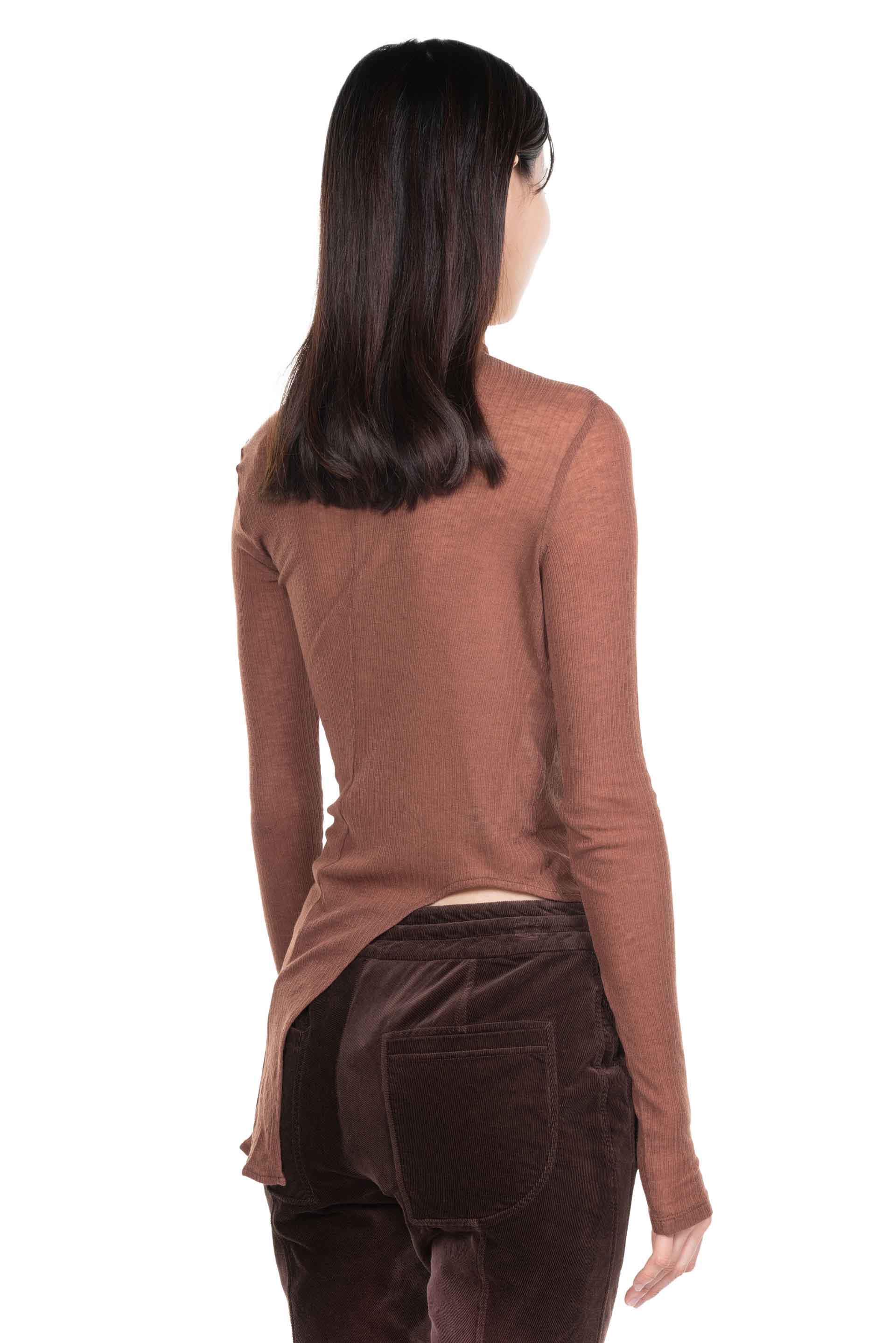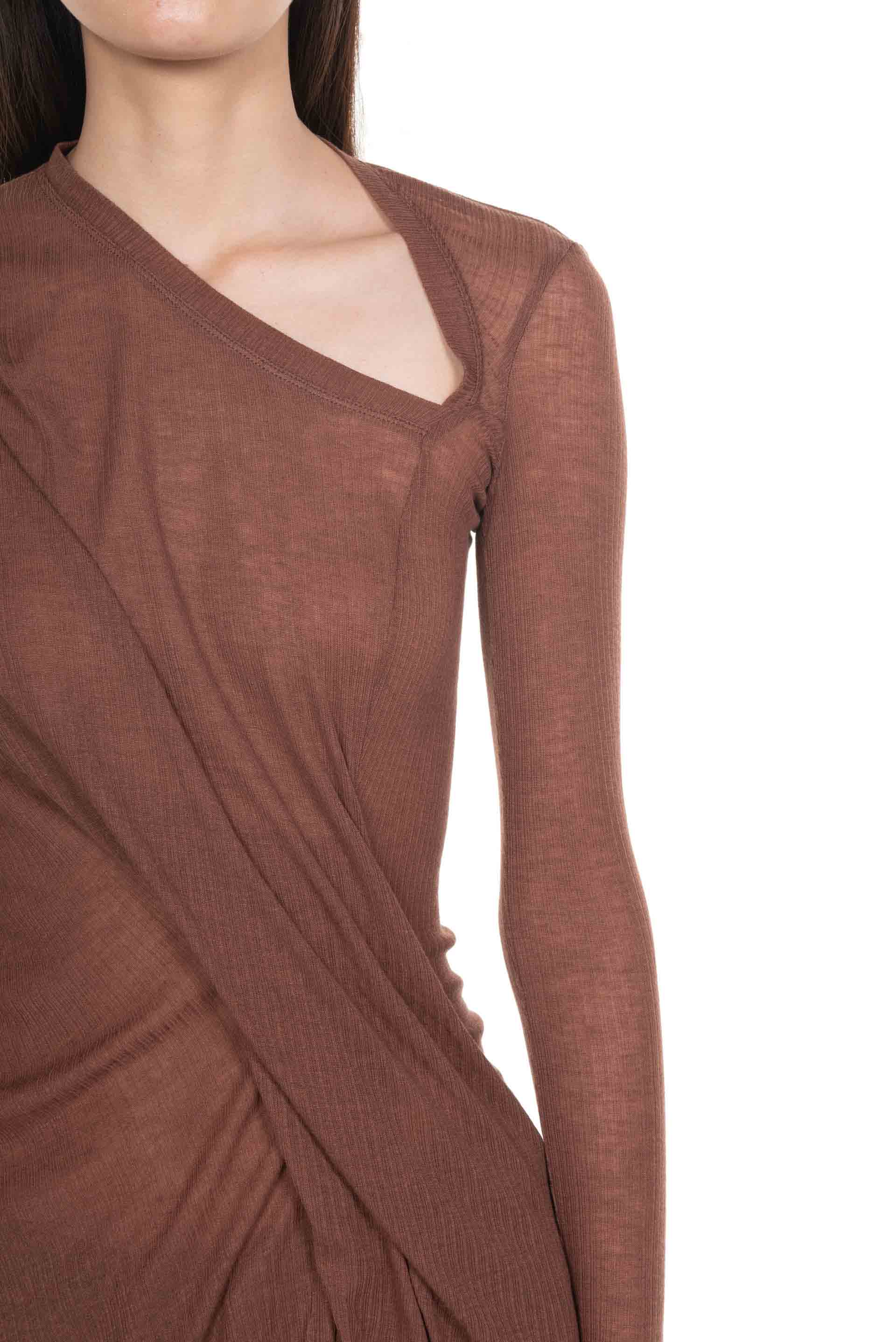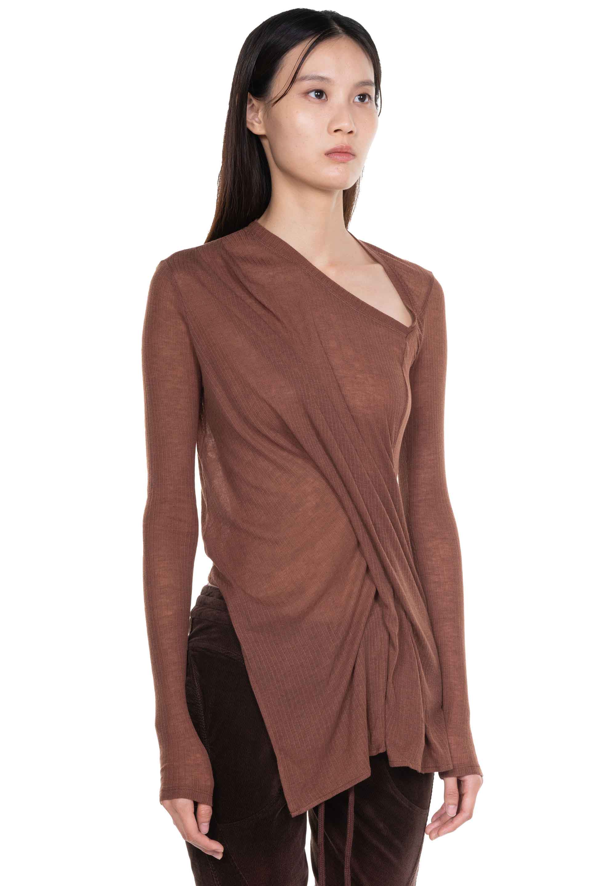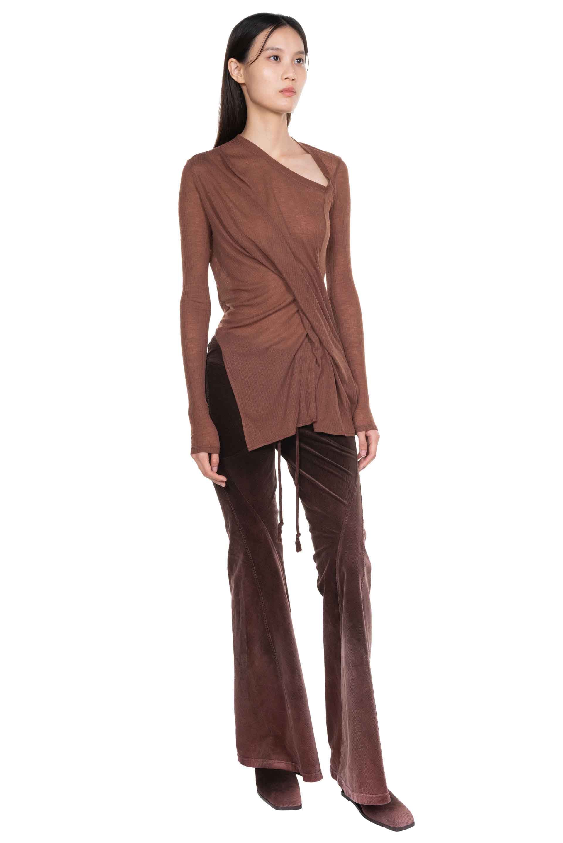 This draped asymmetric top is made from ribbed wool-Tencel blend, offering a soft and comfortable handle with rich colour. The asymmetrical neckline cleverly frames the décolletage and visually elongates the neck. The draping technique creates a natural cascading effect at the front, exuding relaxed elegance while defining your waist.