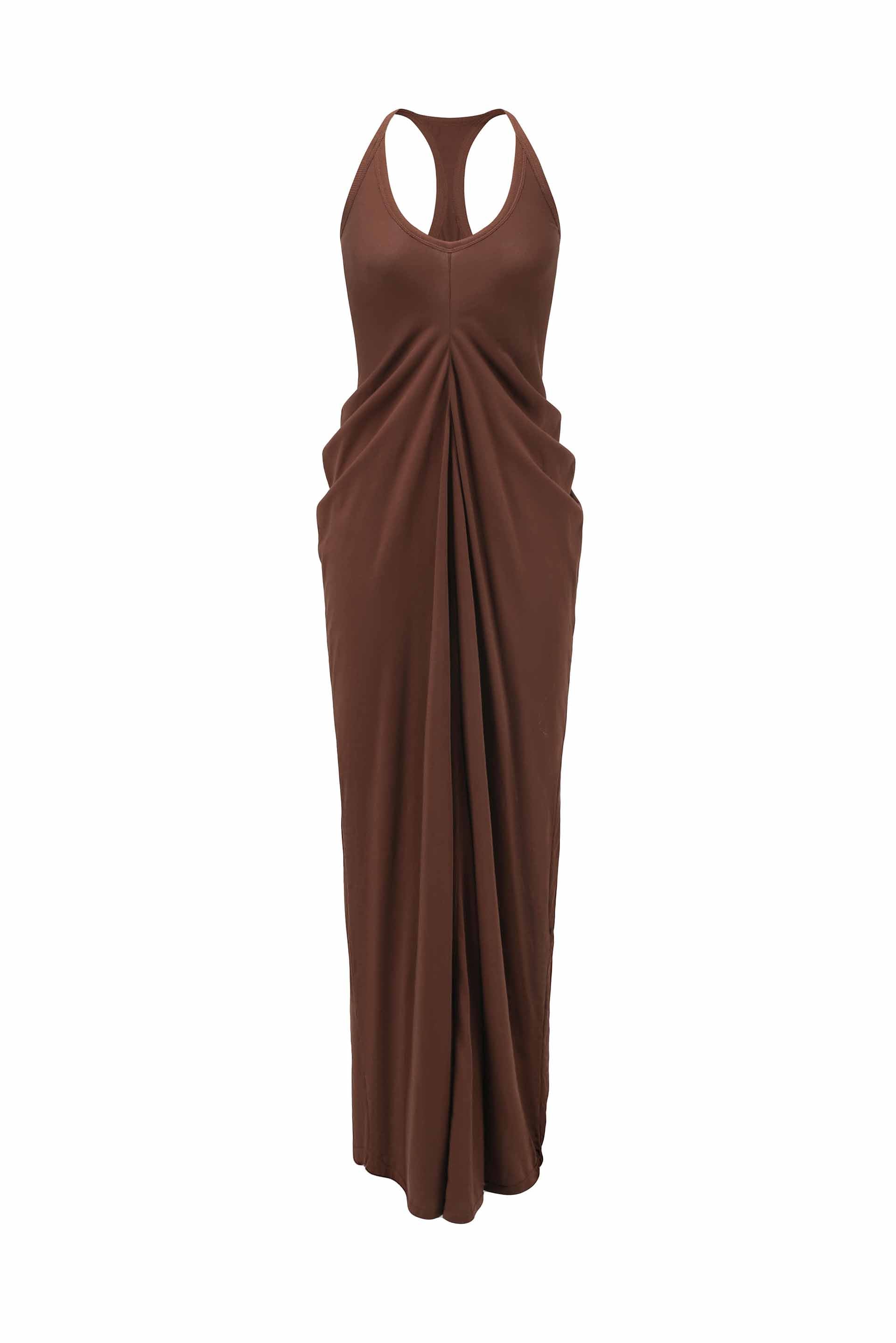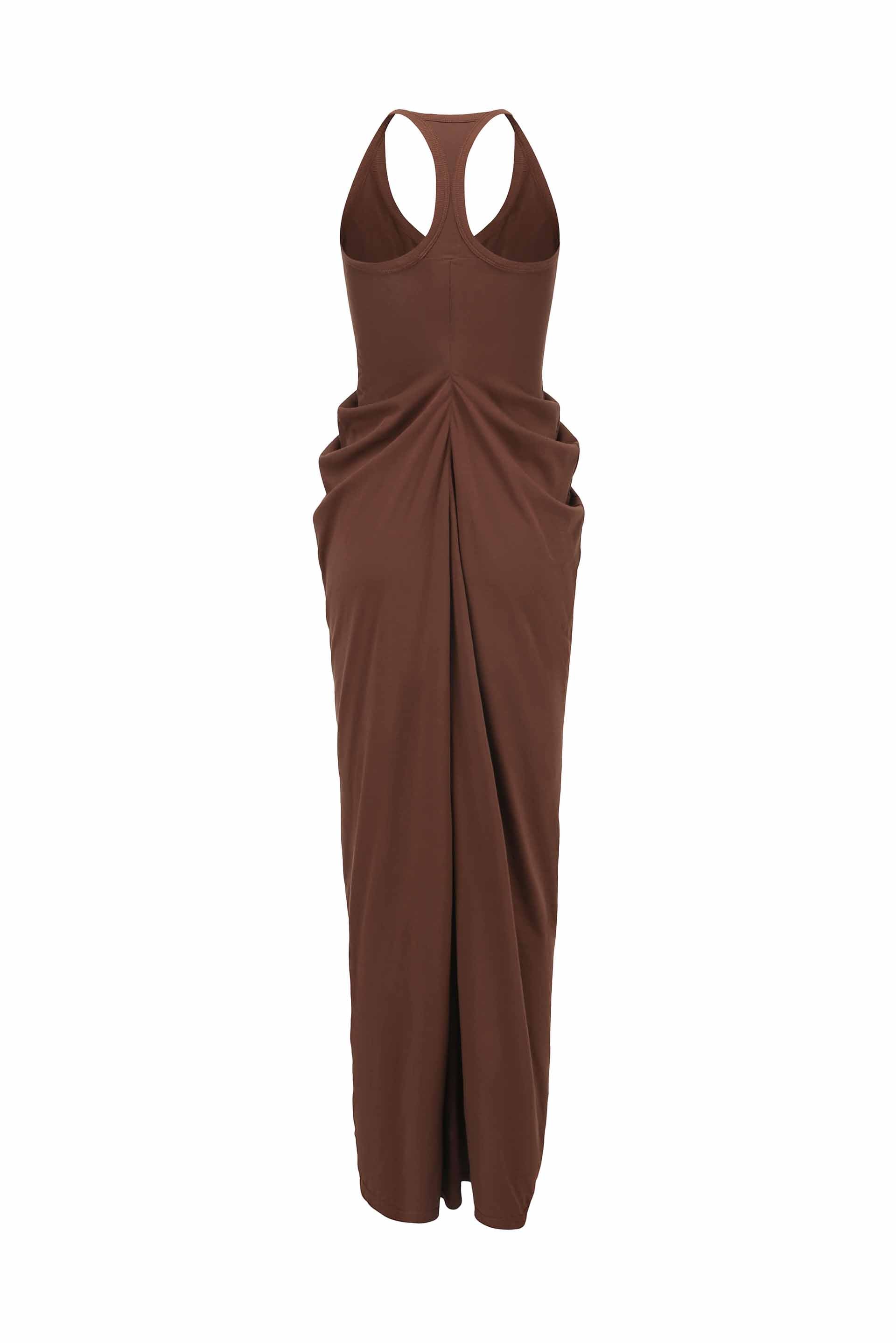 OUDE WAAG strikes a balance between Asian aesthetics and Western cutting. It is at the heart of designer’s philosophy: celebrating the power of women, yet simultaneously critiquing the ongoing objectification and idealisation of the body as you can see in the Oude Waag "Paramount Soul" collection with the Draped Jersey Tanks Dress Reddish Brown.