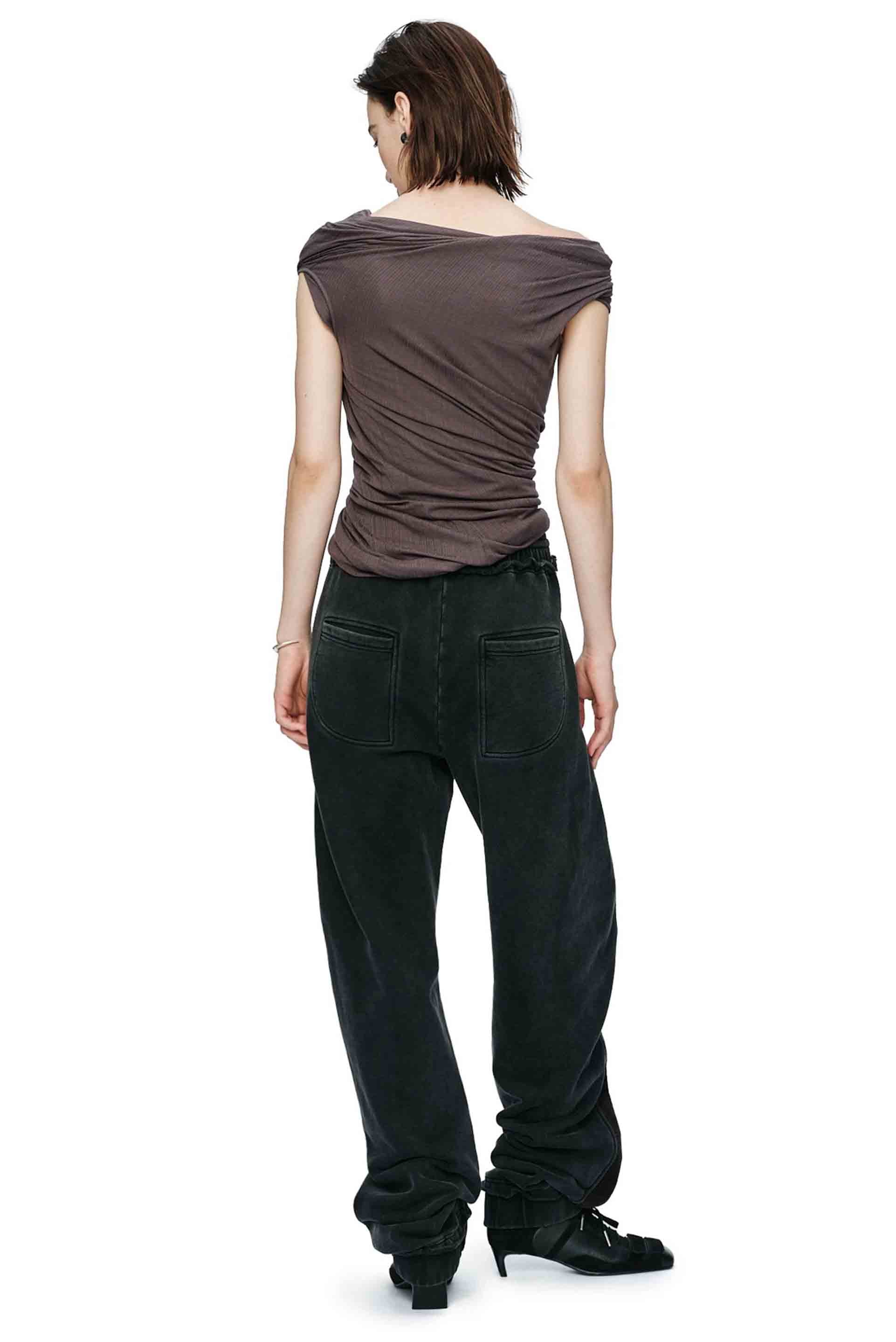 Draped One Shoulder Stretch Ribbed Top Dark Grey