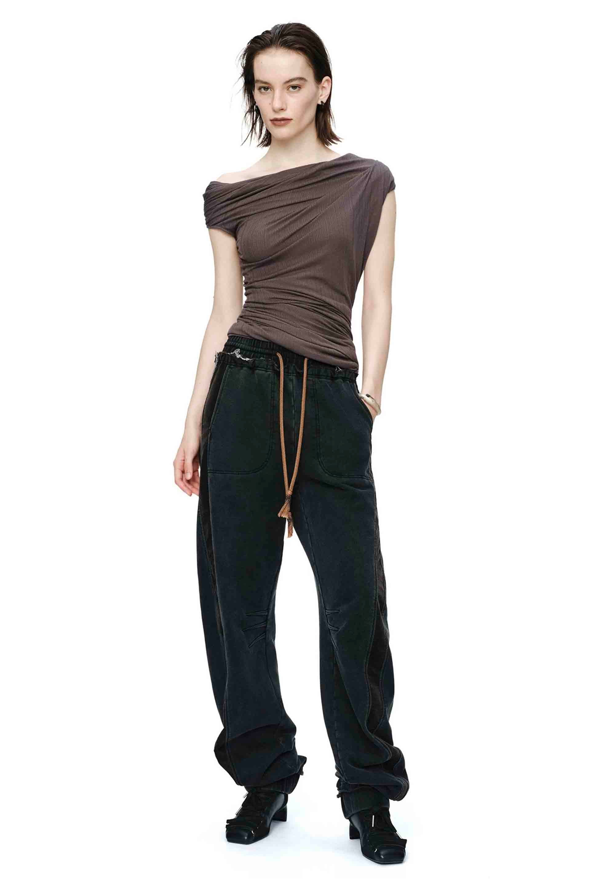 OUDE WAAG strikes a balance between Asian aesthetics and Western cutting. It is at the heart of designer’s philosophy: celebrating the power of women, yet simultaneously critiquing the ongoing objectification and idealisation of the body as you can see in the Oude Waag 26 resort collection with the Draped One Shoulder Stretch Ribbed Top Dark Grey.