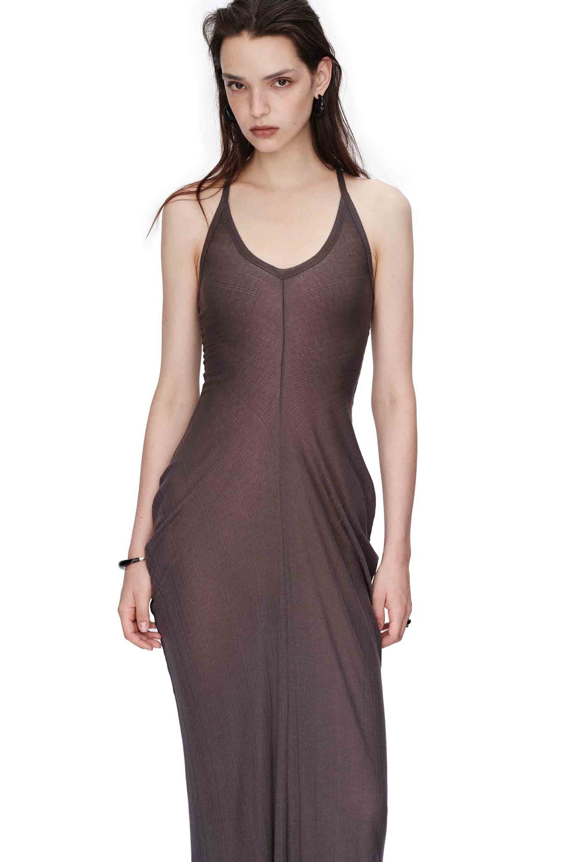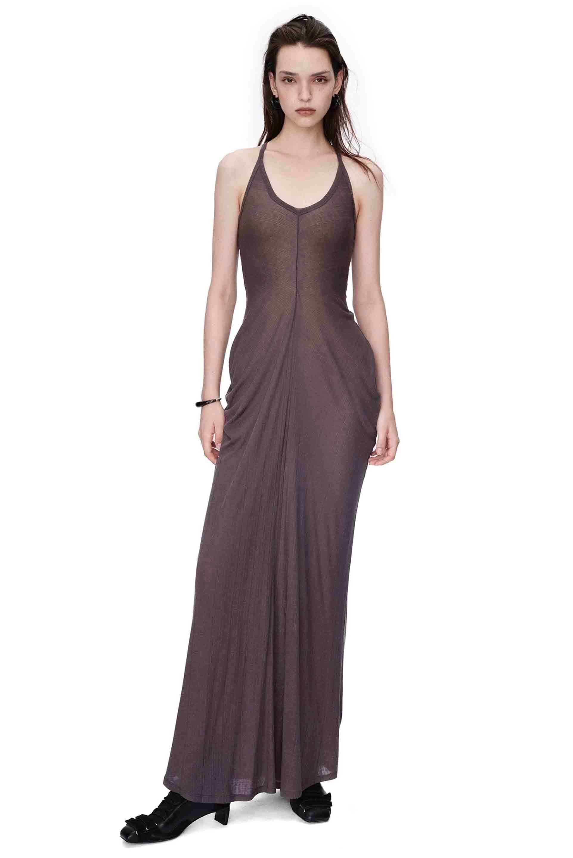 This ribbed dress is knitted from a lightweight and stretchy Tencel-wool blend that feels gentle against the skin. A wide scoop neckline transitions into an open-back, highlighting the graceful shoulder and neckline. It falls and cascades naturally along the sides, creating rushing that flatters different sizes for an effortlessly elegant look.