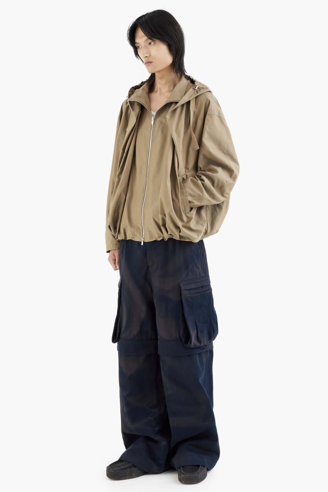 JiyongKim’s signature sun-faded effect is developed over months of natural exposure to sunlight, rain, and wind—creating one-of-a-kind patterns without chemical dyes or water waste. Vintage textiles and hardware are reimagined into relaxed, draped silhouettes in earthy tones, reflecting the brand’s commitment to sustainability and innovation. Rooted in slow fashion, JiyongKim celebrates nature with dynamic, eco-conscious designs that elevate the beauty of mindful craftsmanship as seen with the Draped Volume Hood Jacket.