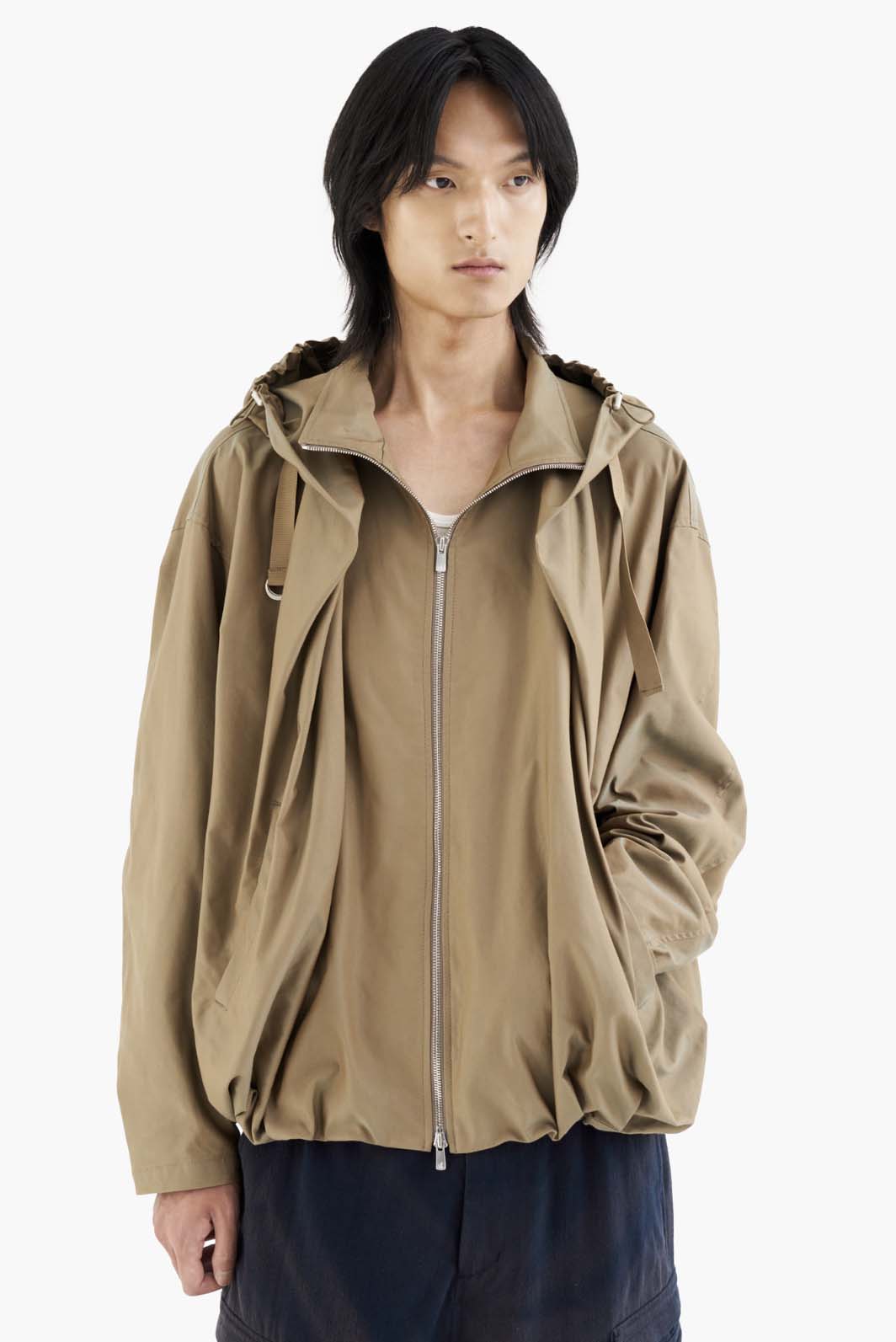 Oversized fit. Front YKK Excella® two-way zipper. Horn buttons on cuffs. Elastic drawstring at hem and hood edge. Cape-style hood detail. Hem pleat detail.