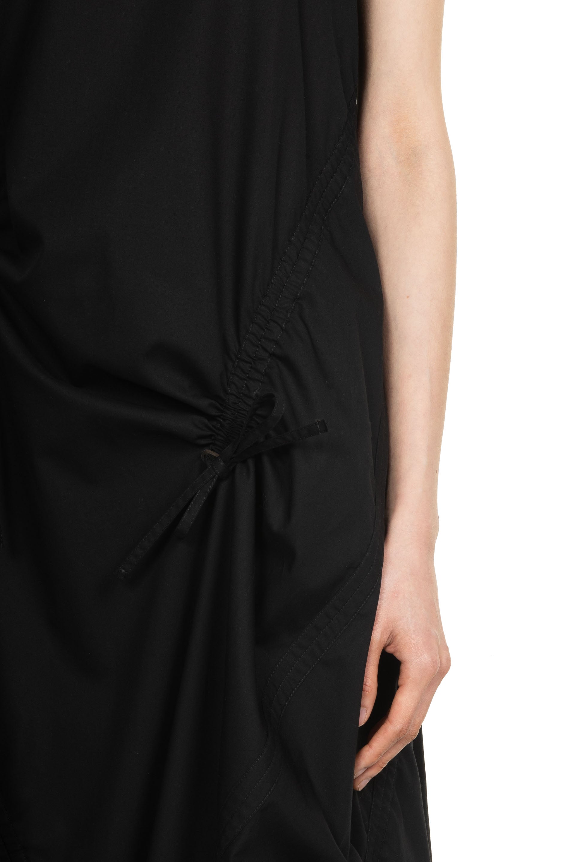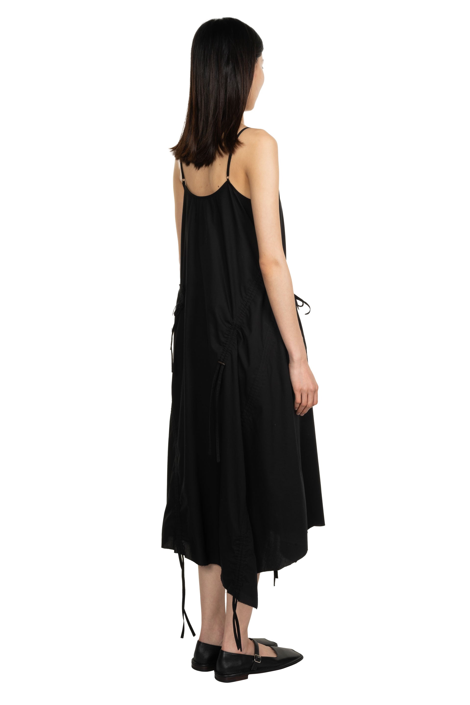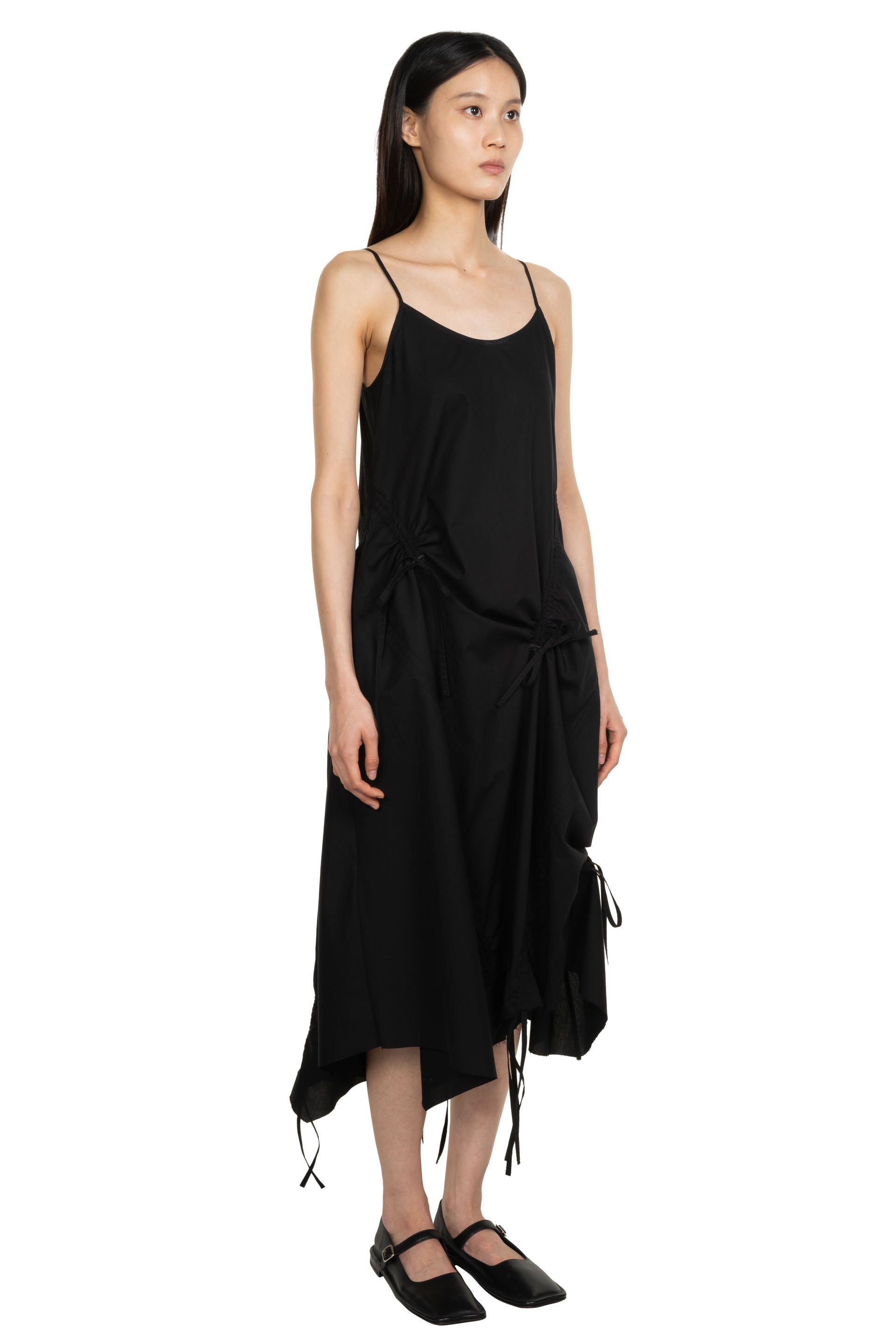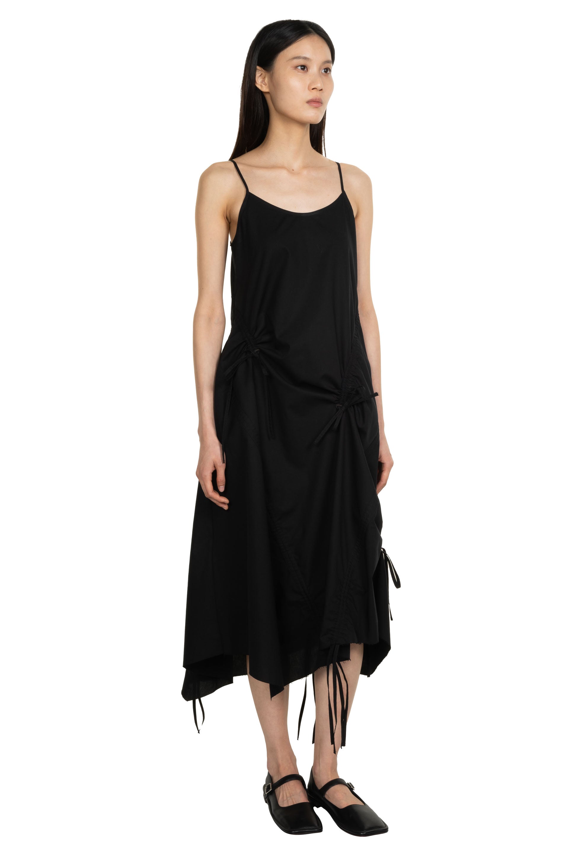 Professor e Drawstring Dress in Black. Sleeveless. Spaghetti adjustable shoulder strap. Drawstring details throughout for styling. Layered.