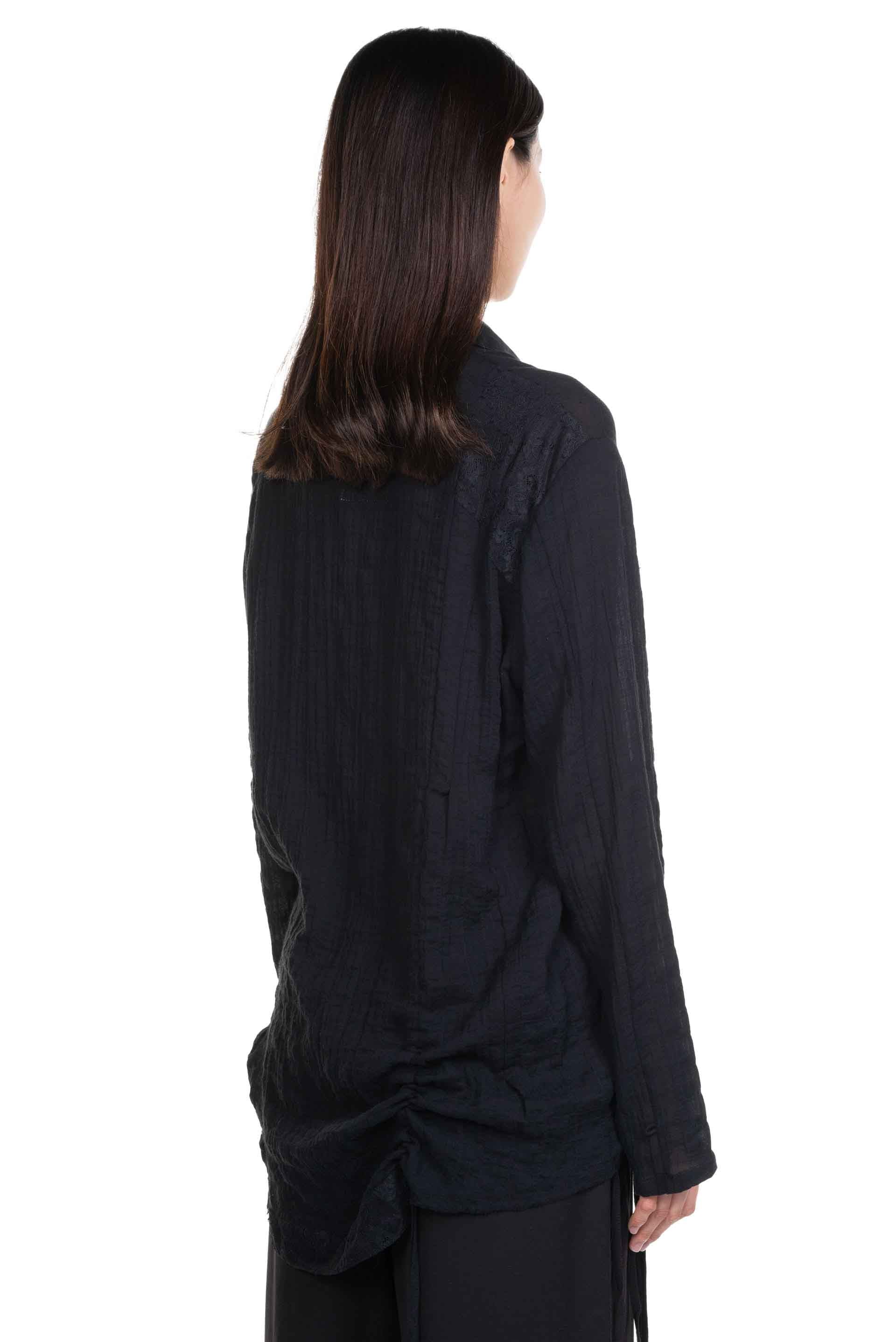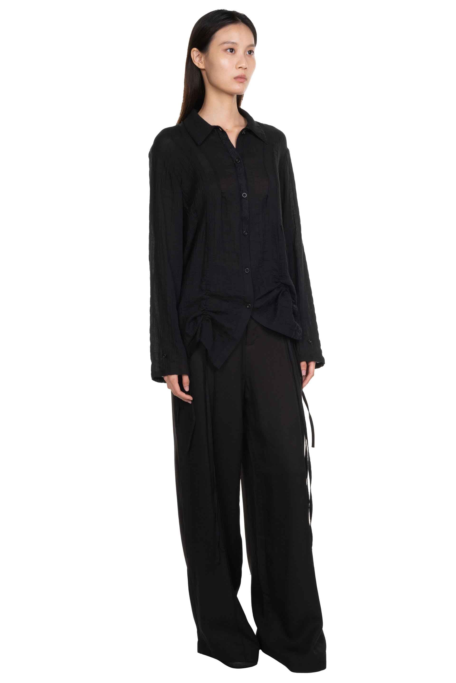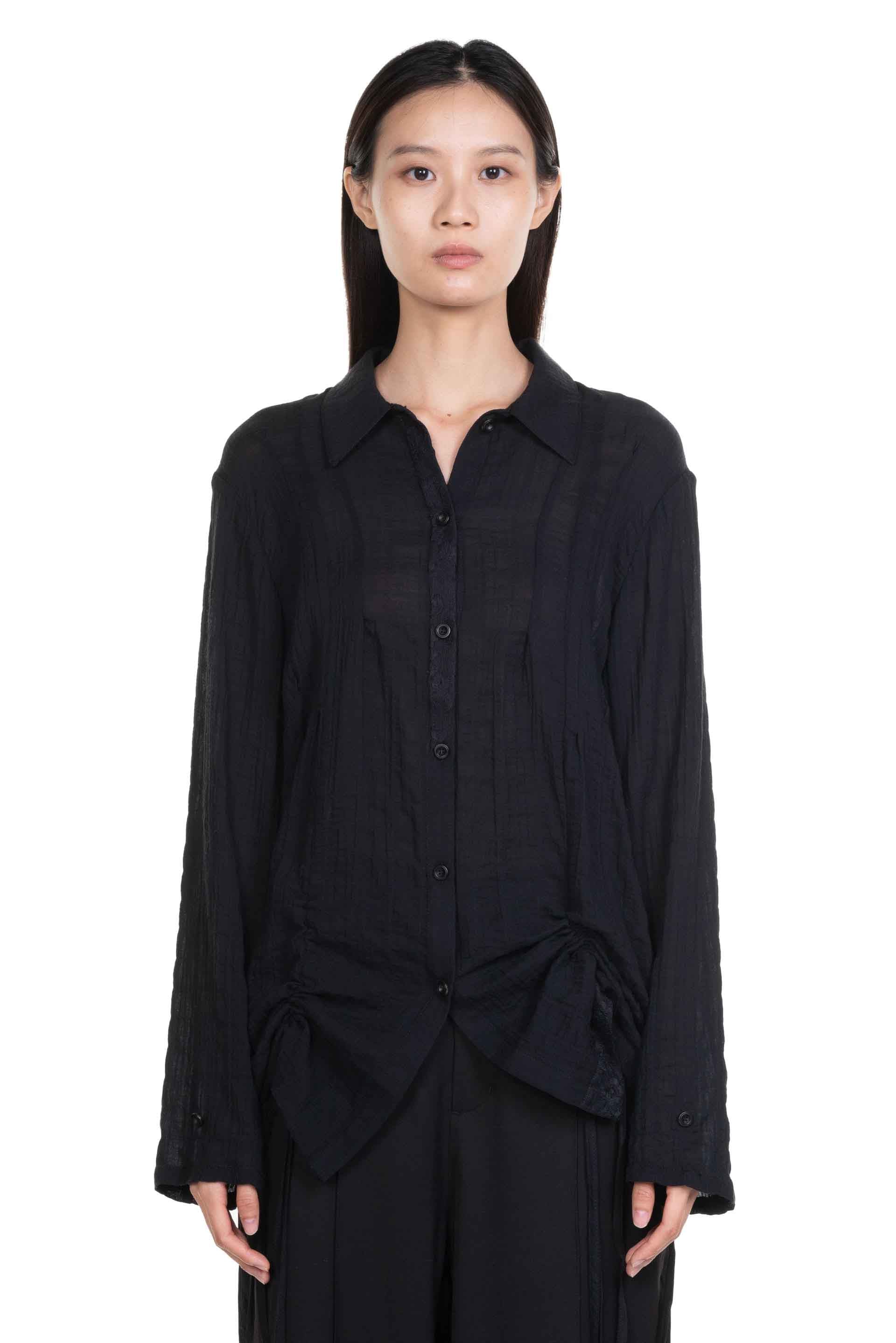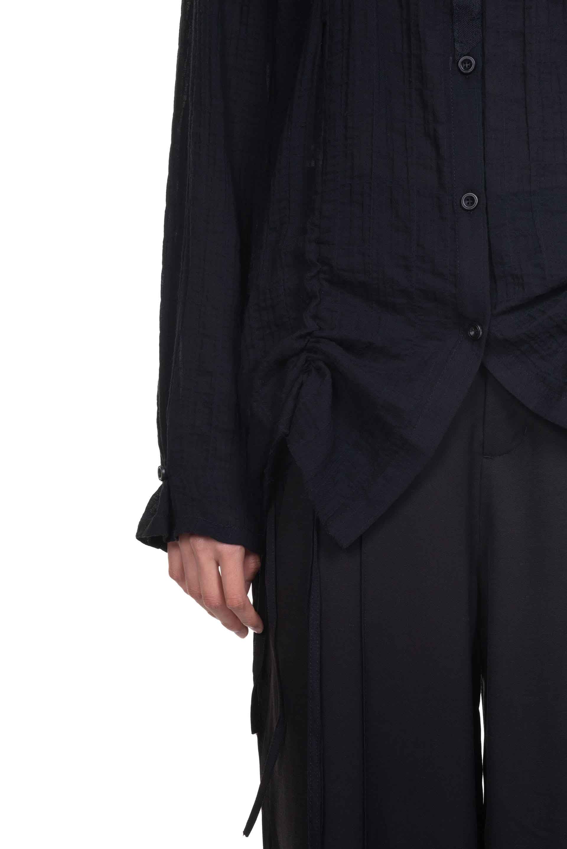 Black Drawstring Shirt from Professor e. Long sleeves. Button closure at front. Pleated at front and back. Button at cuffs. Panelled construction. Drawstring details at back at front.