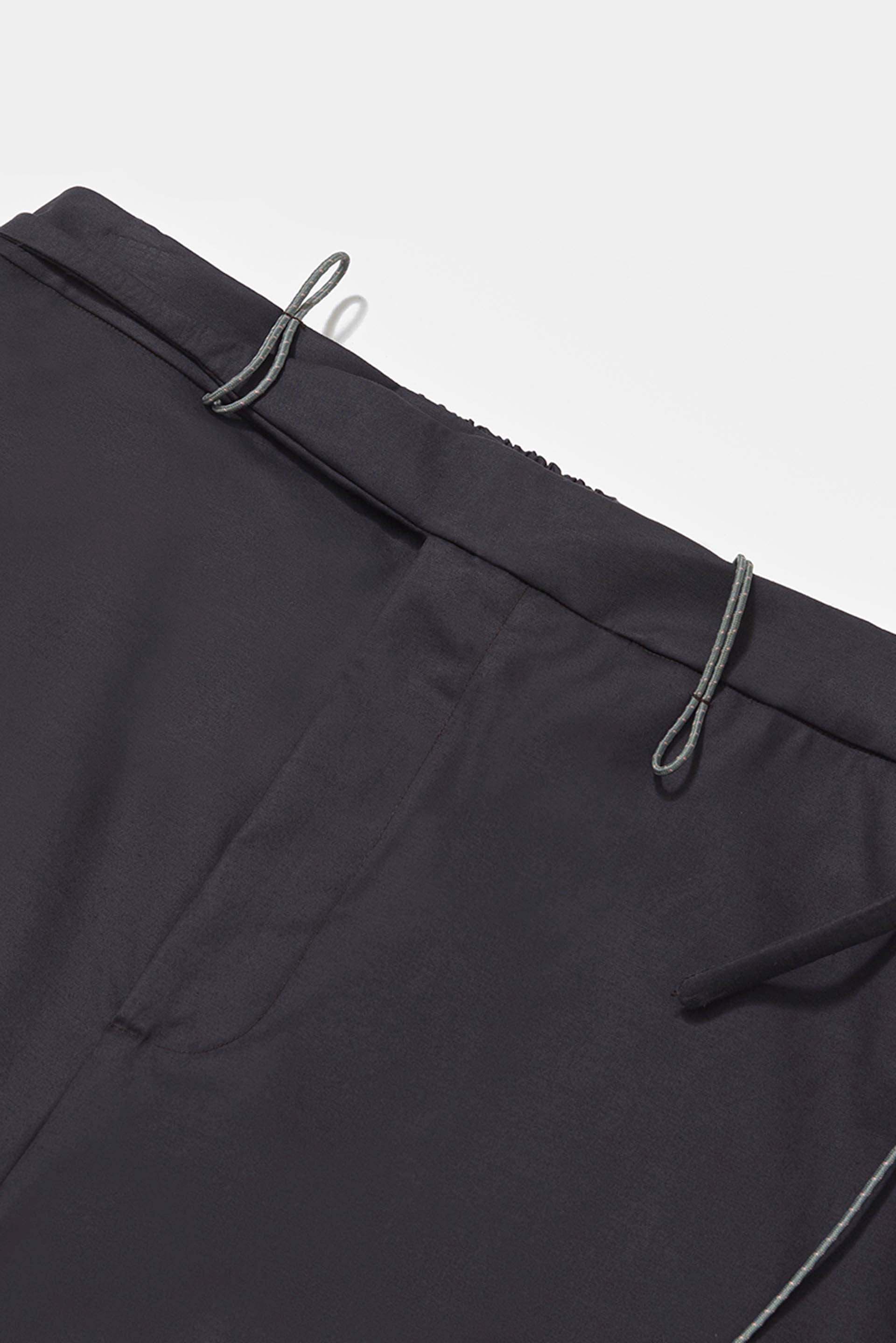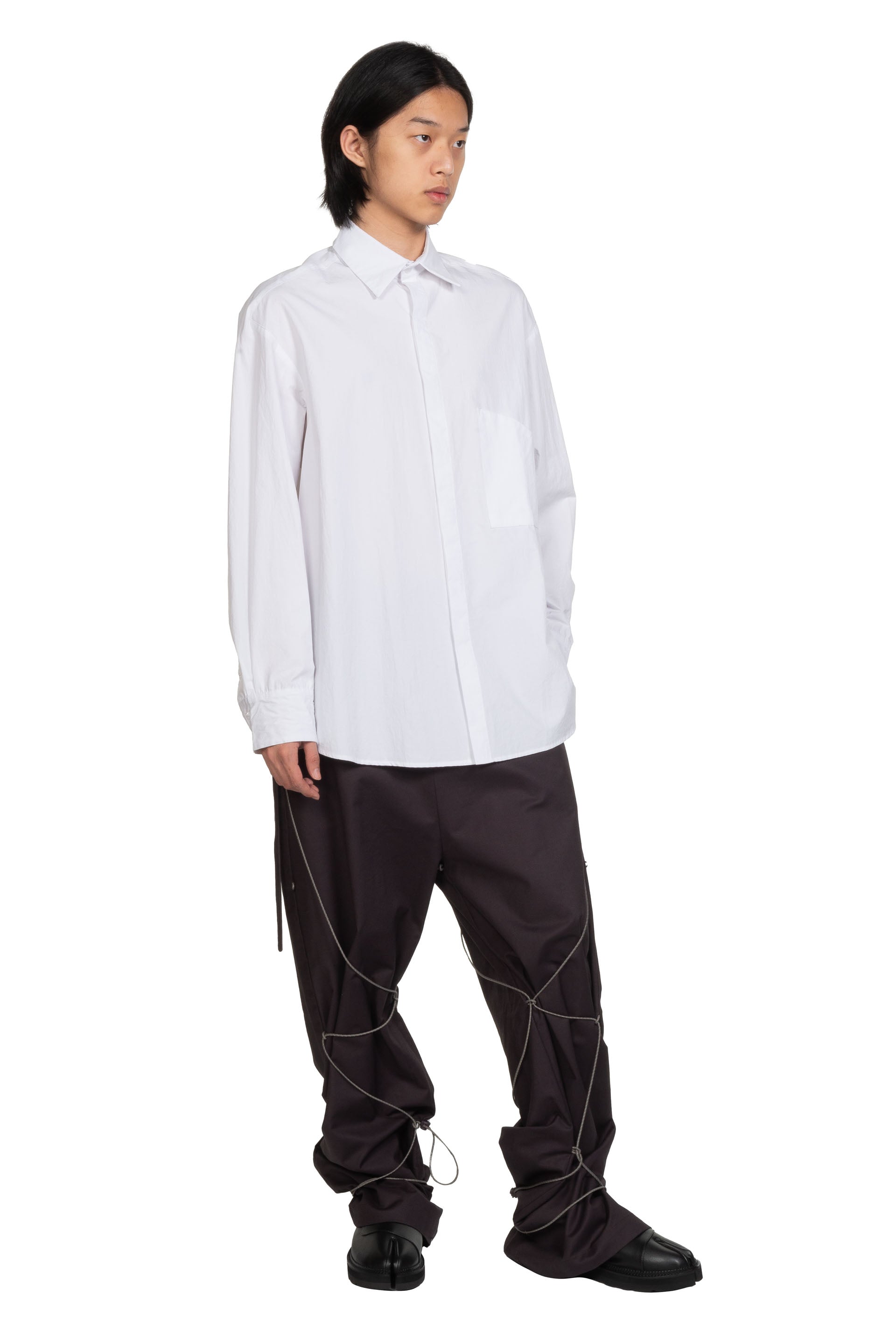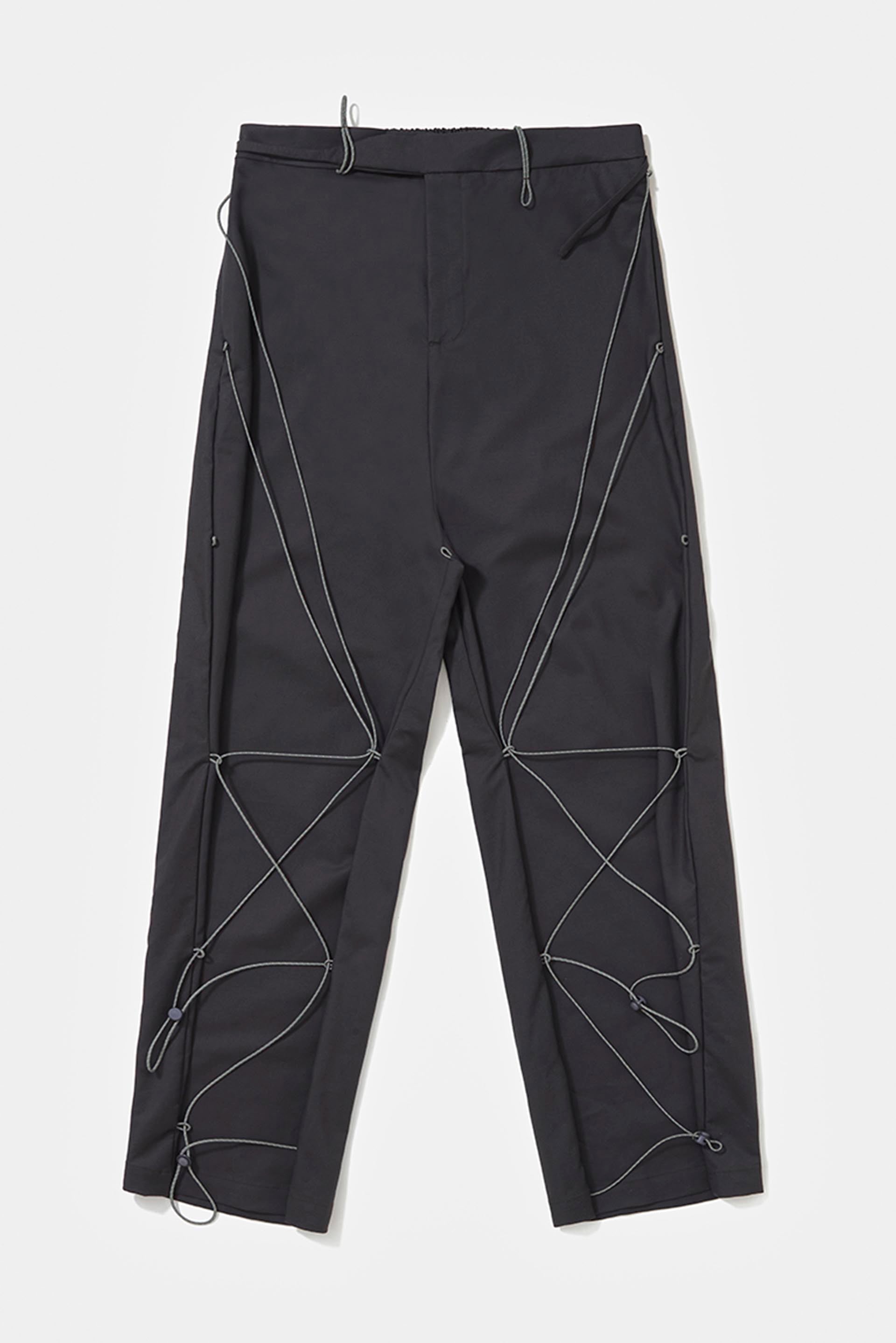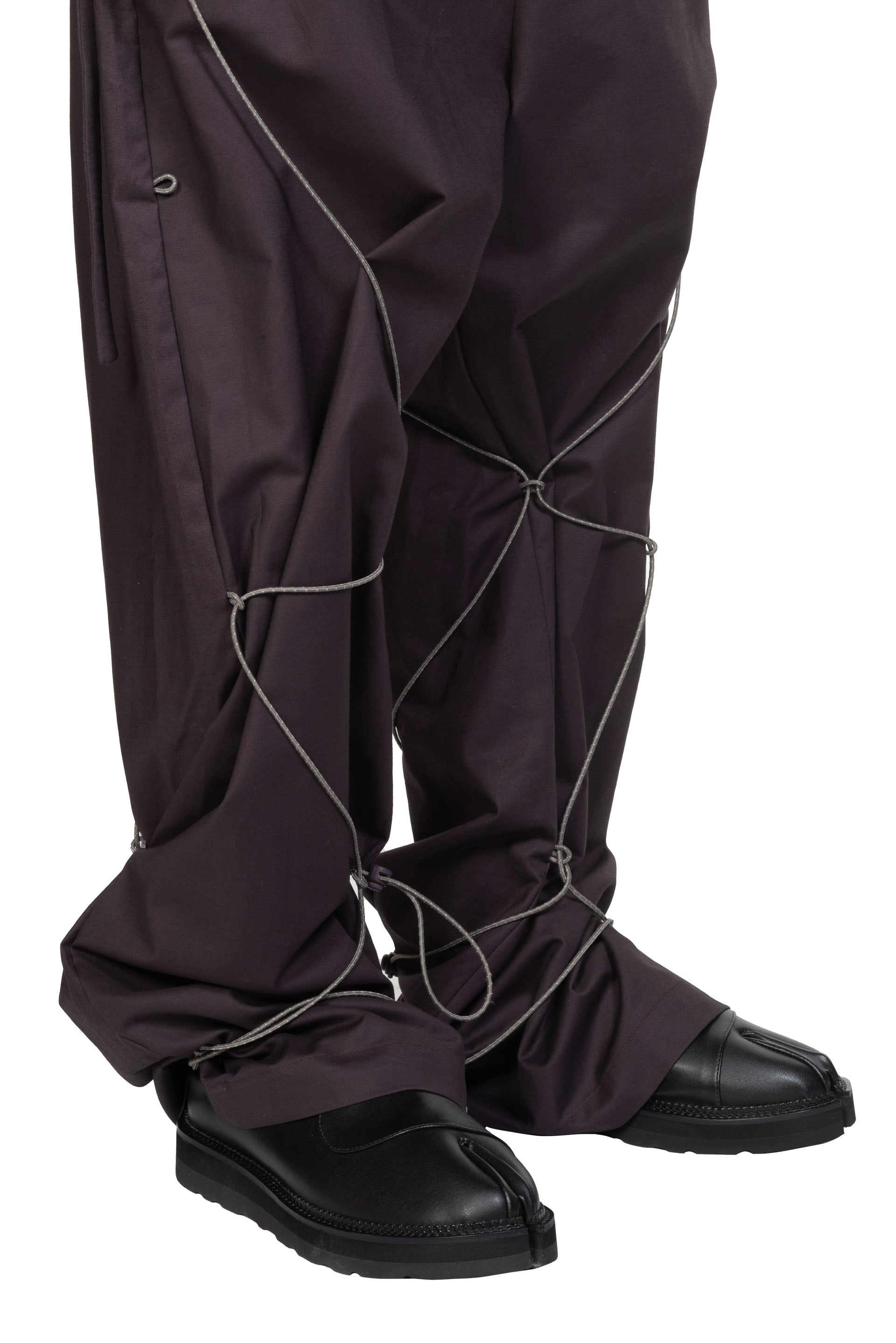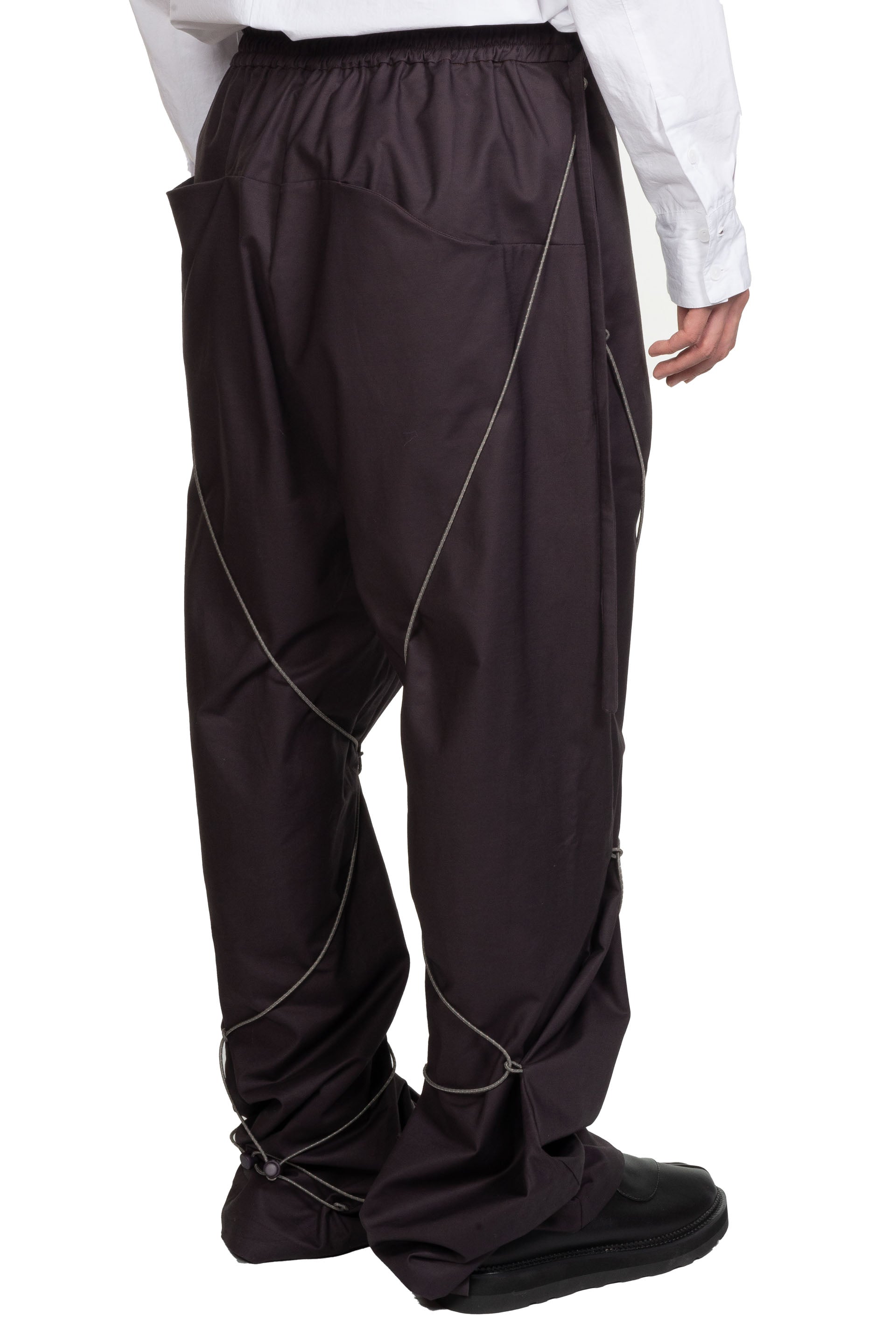 P. Andrade presents a Japanese avant-garde style combined with looks that are fit for rainforest excursions, tinged with tailoring cues and contrasted with technical touches as seen with the Drawstrings Wide Leg trousers.