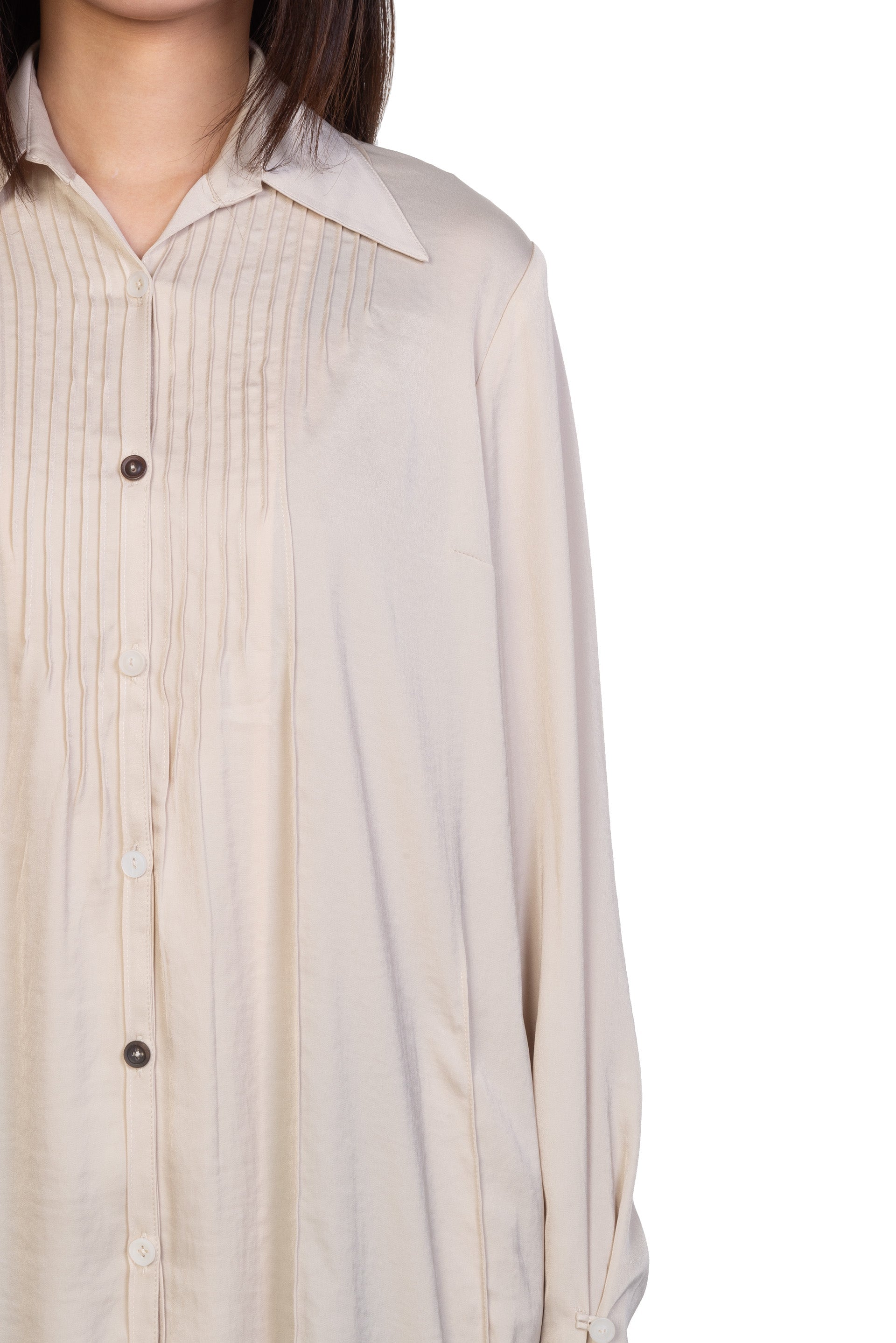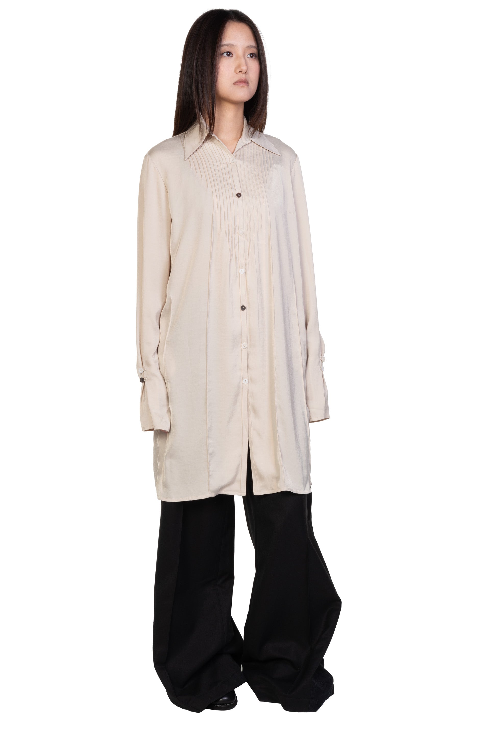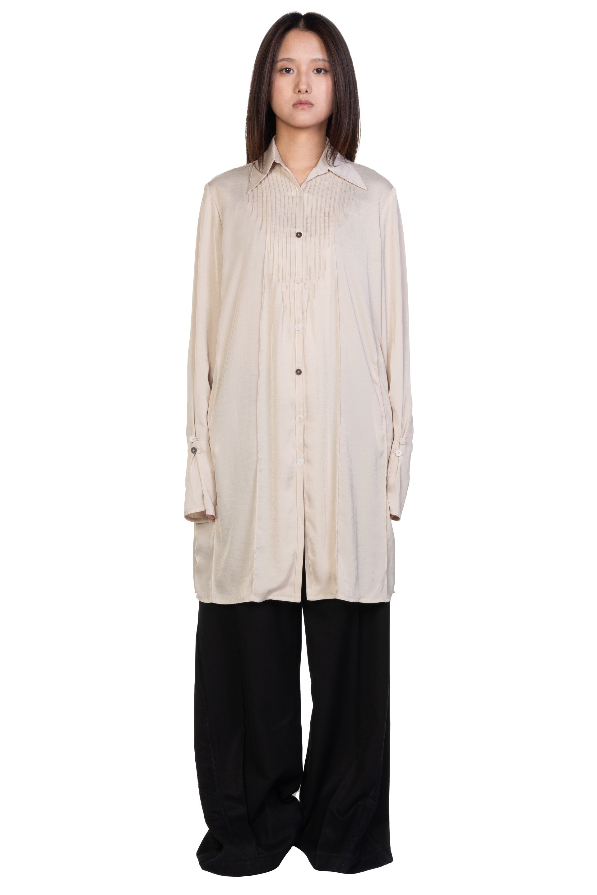Professor. E Dress Tunic Beige. Long sleeves. Button closure at front. Button at cuffs. Pleated details at back and front.