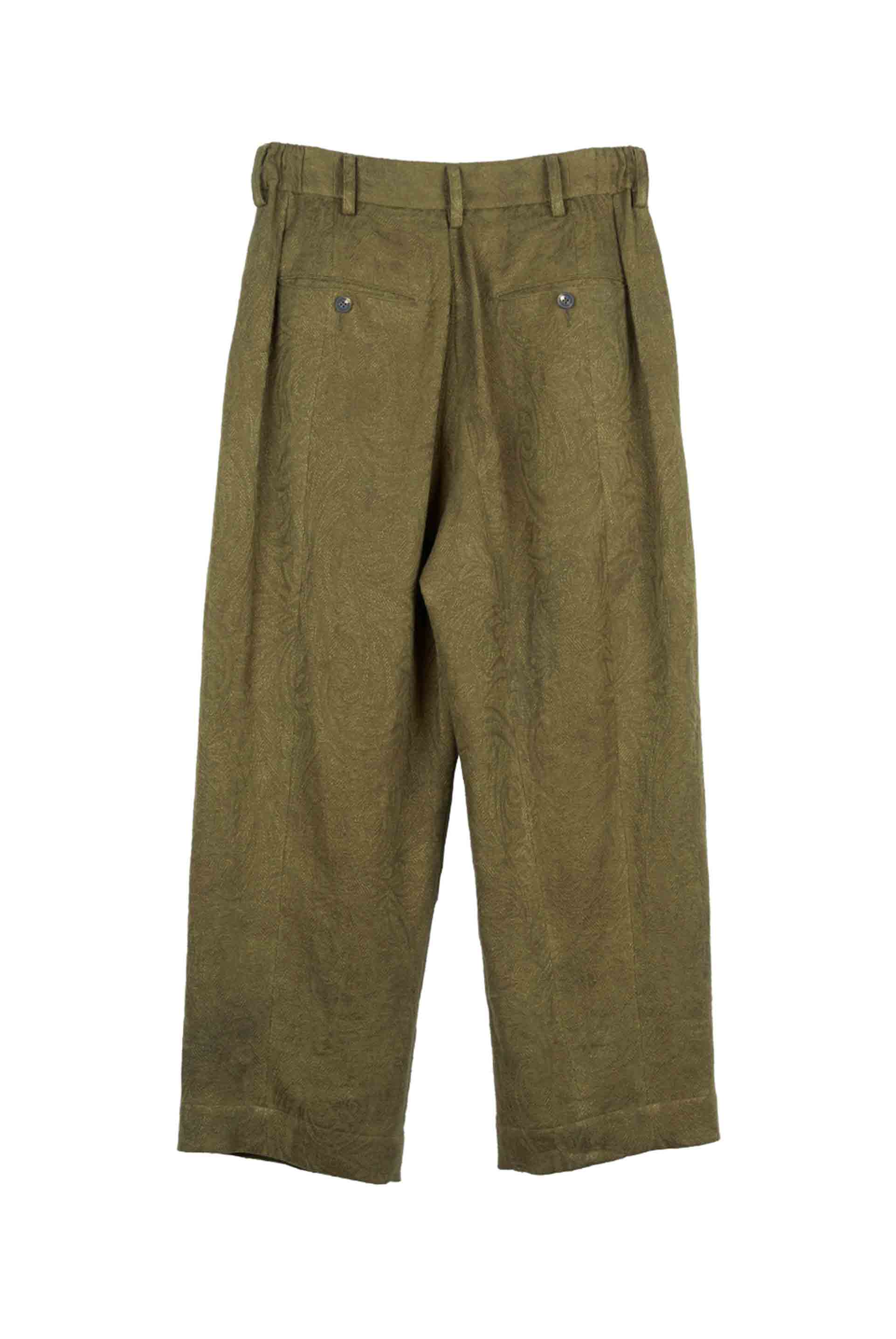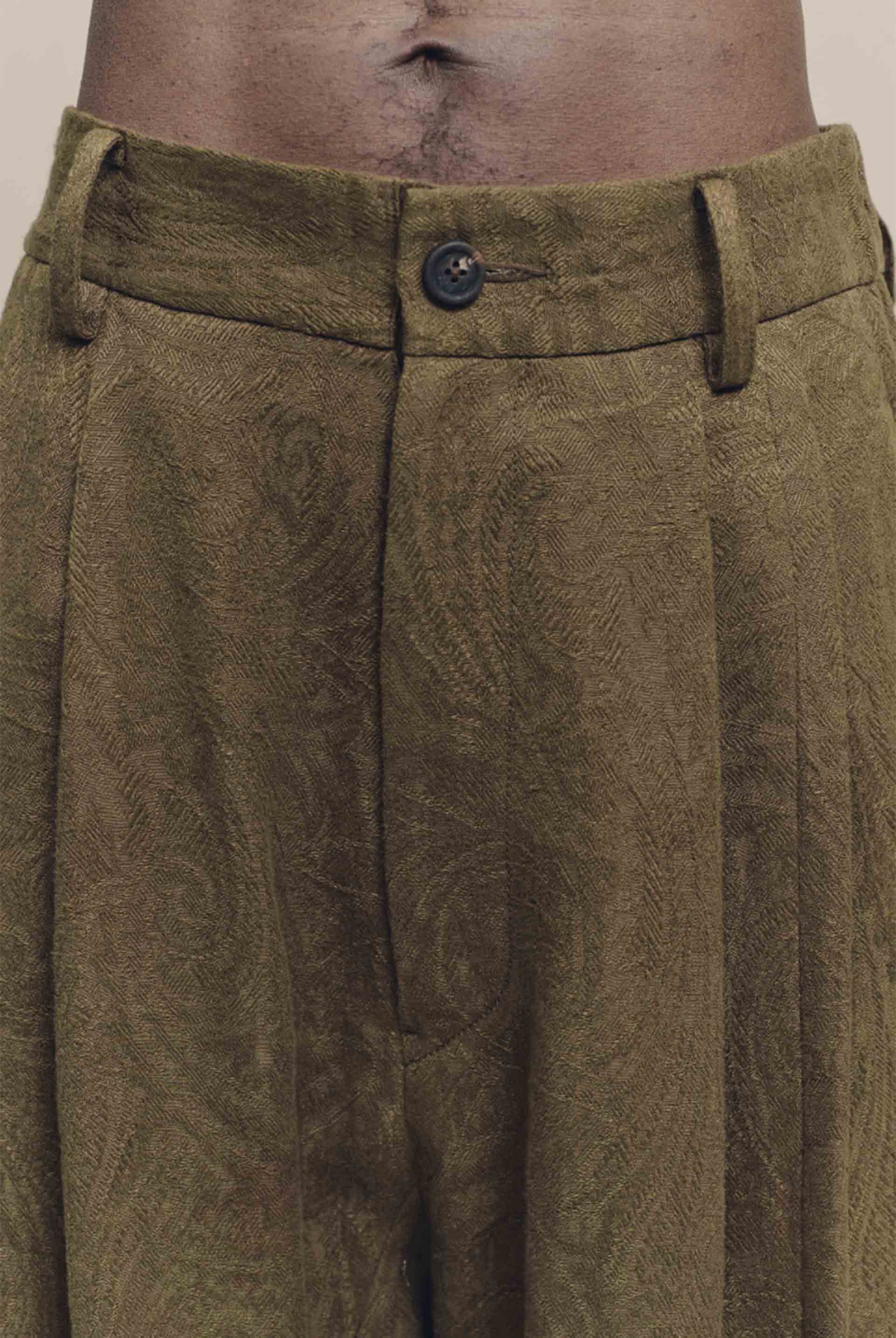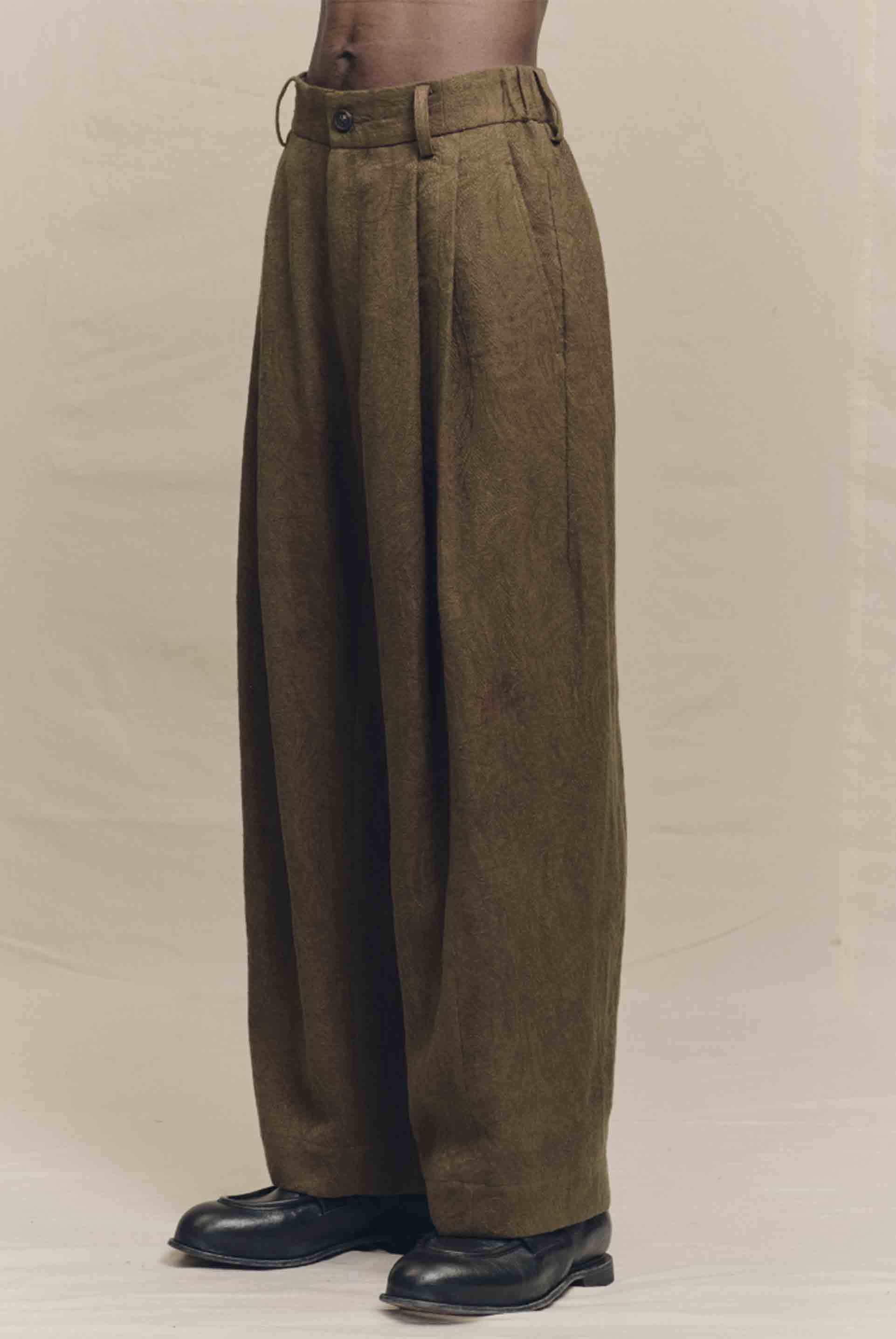 Ziggy Chen linen trousers in olive colour. Two side pockets. Two back pockets. Button closure at front. Zip fly. Rich green colour in a soft textural linen jacquard fabric. Wide leg. Drop crotch.