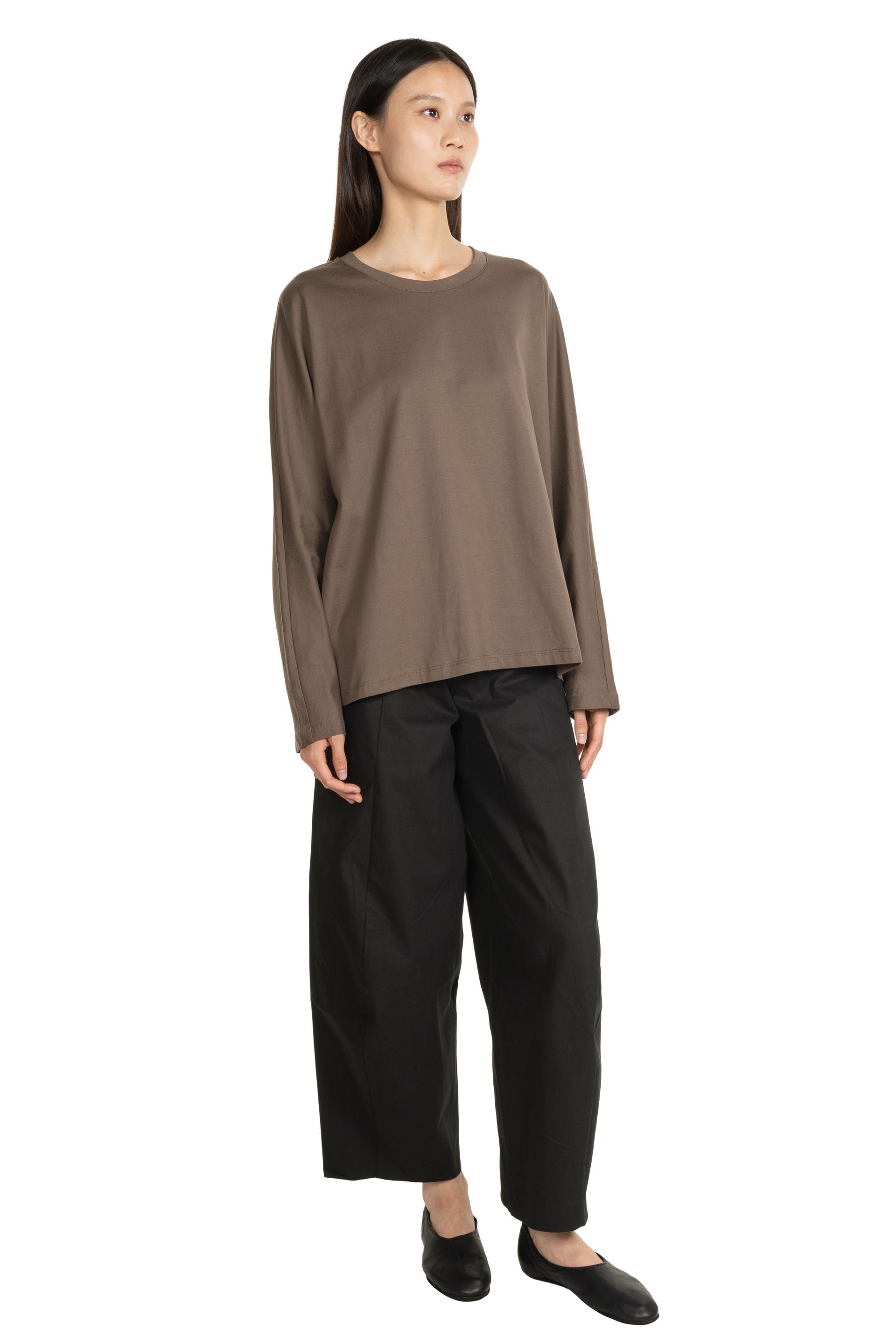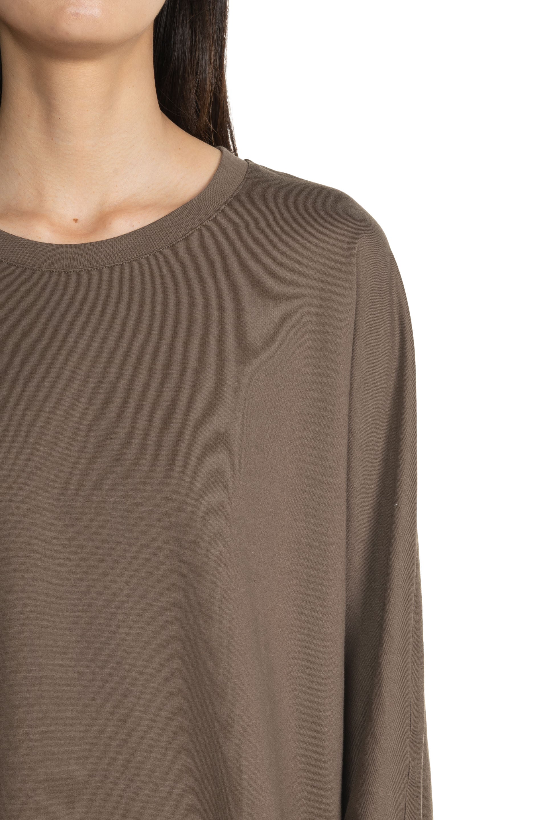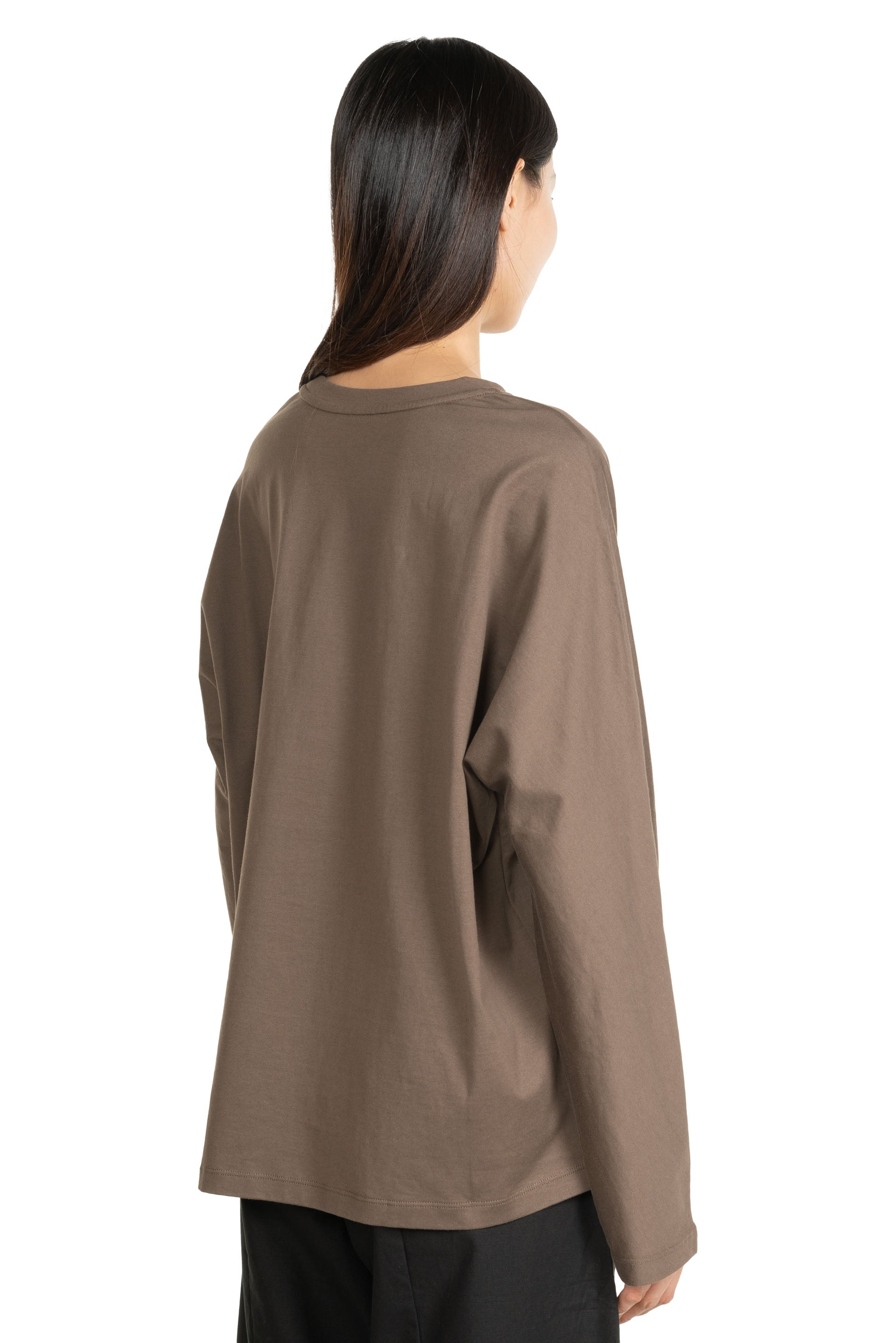 Brown T-shirt. Dropped shoulders. Long sleeves.