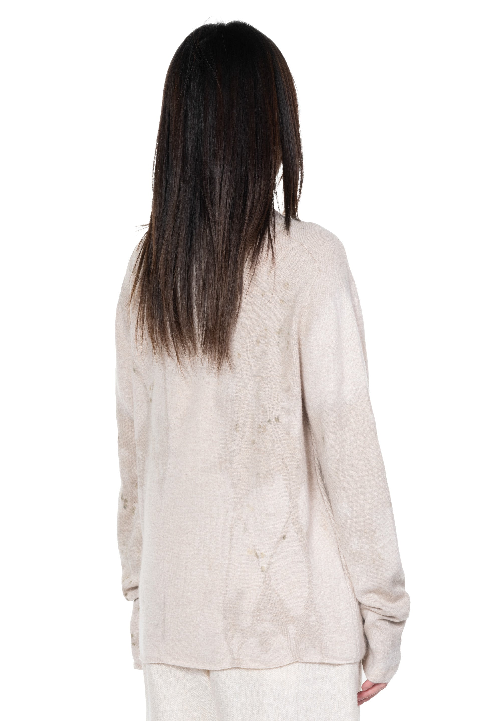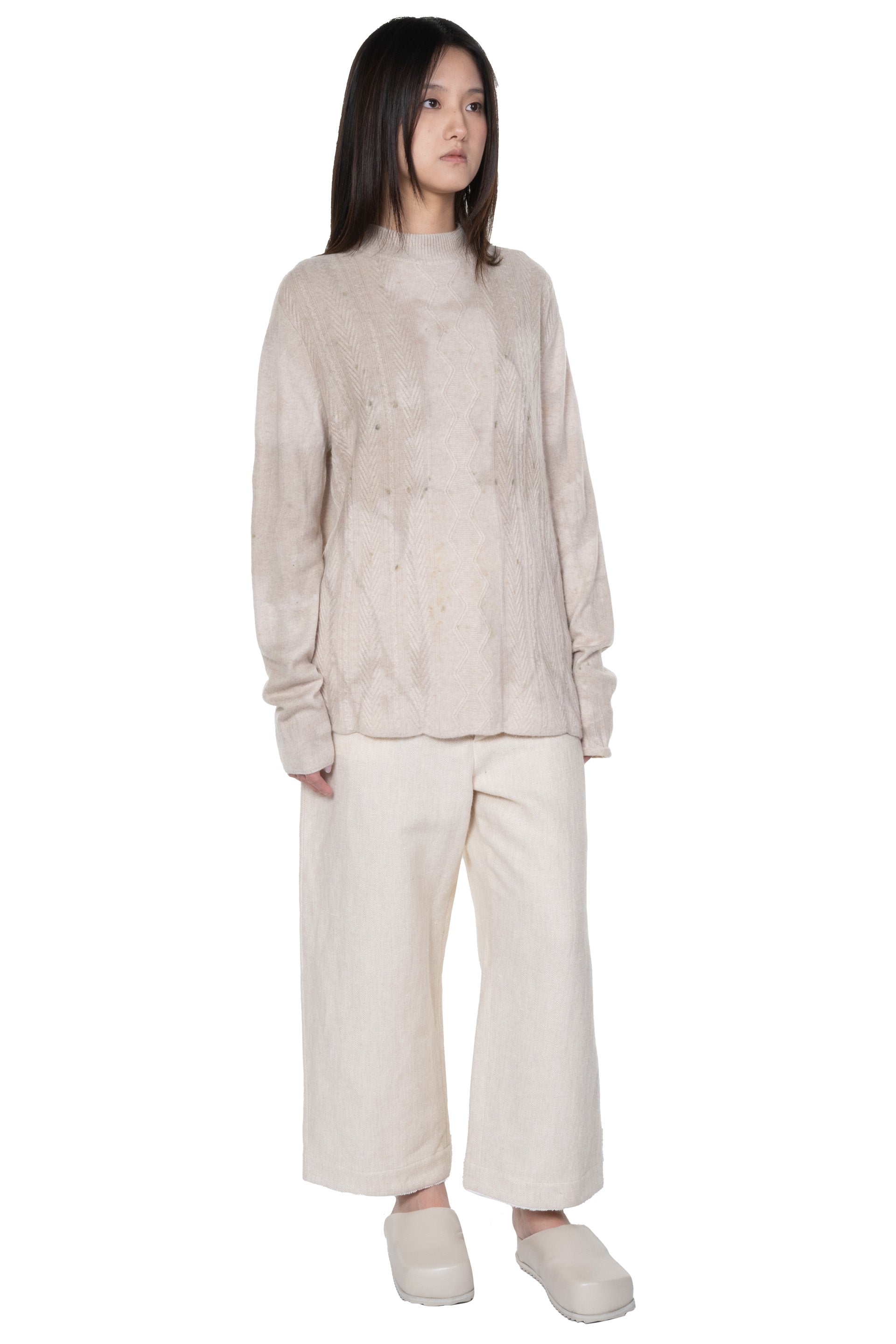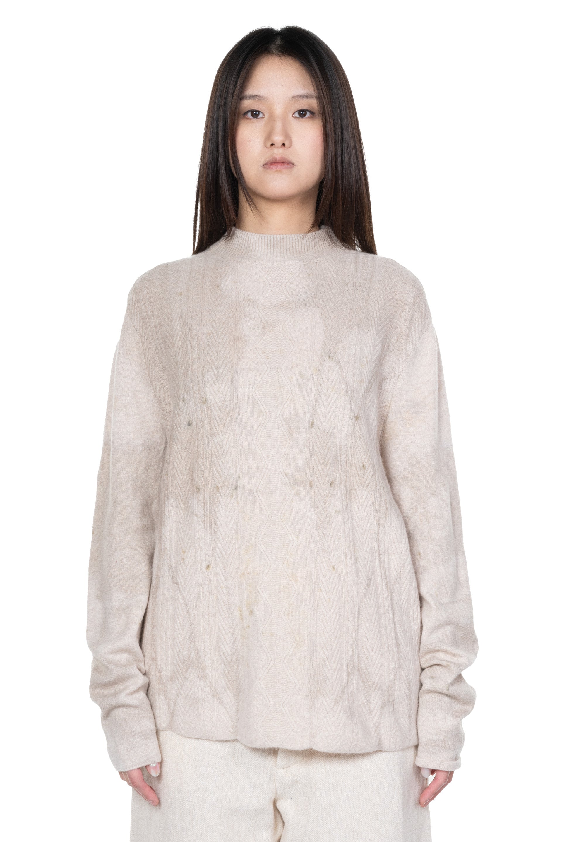 Yu Qun believes that everyone's character is multi-faceted and expressing spiritual independence. Fine hand-stitched threads, old mottled colours and patterns, and unconventional cuts are what Mute Dance has been exploring. The leaves and stems of fresh plants and berries, dried medicinal materials, old metals and so on are combined with the ancient and traditional dyeing technology to dye fabrics and paper as seen with the Dyed Cable Knit Sweater.