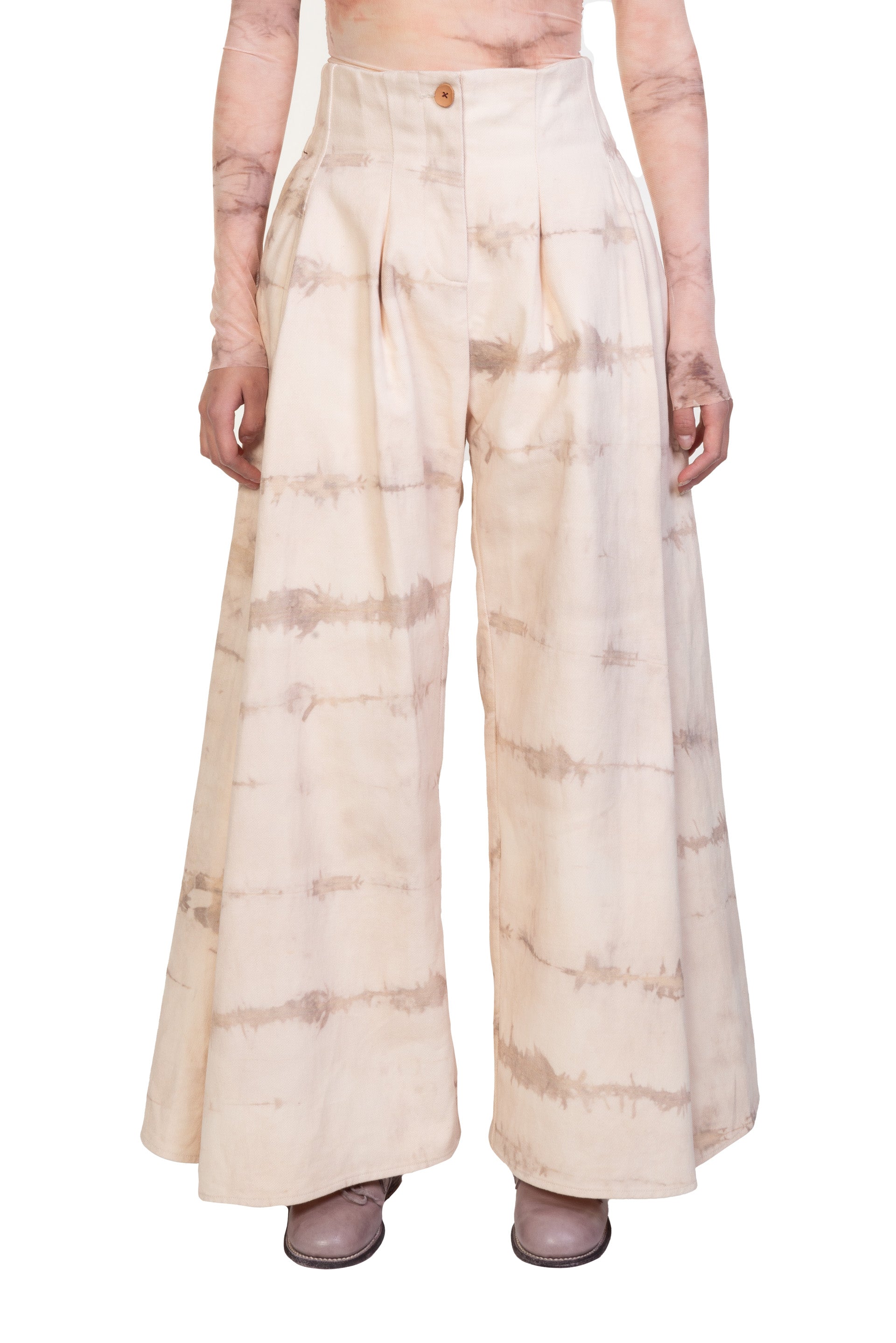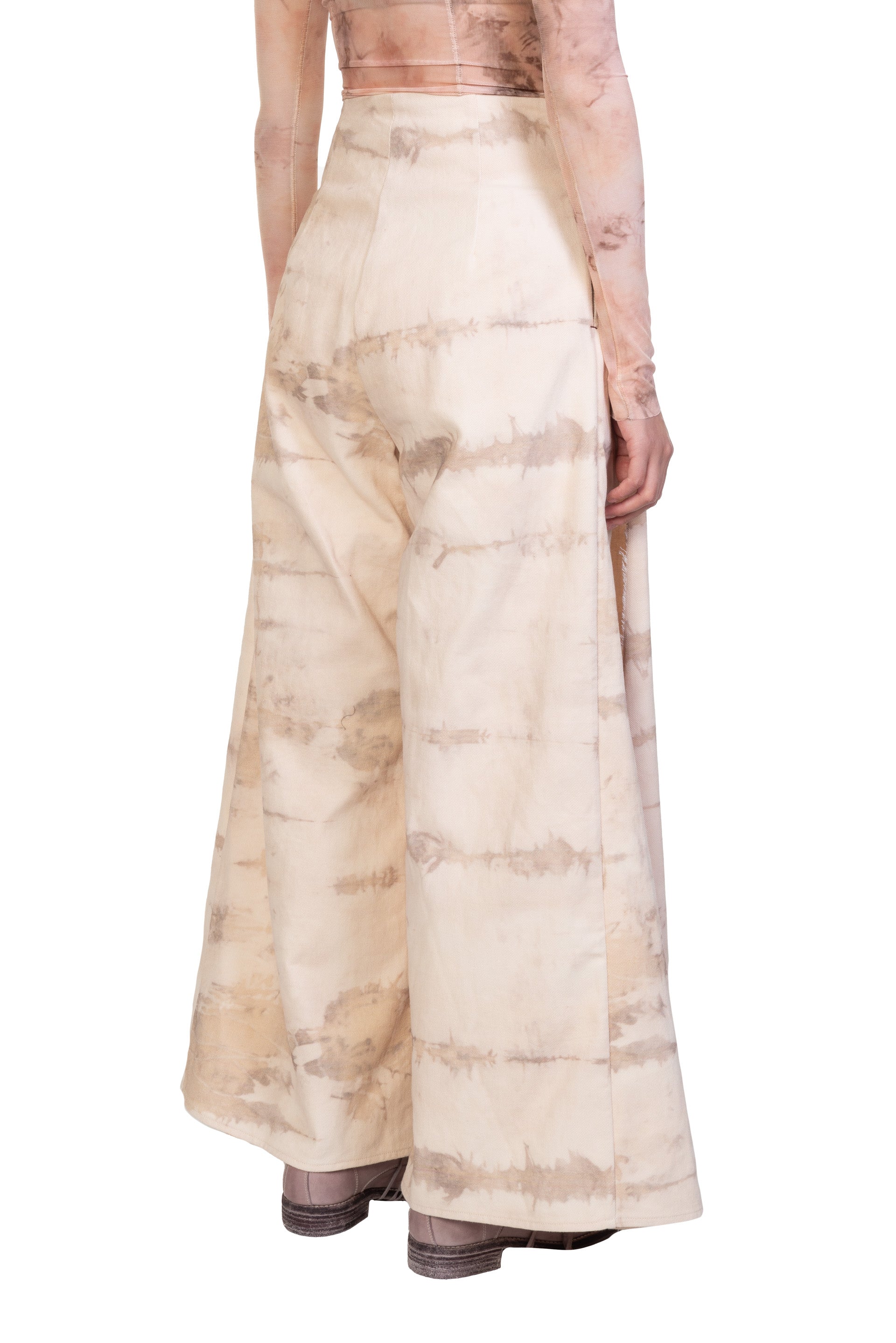 Button closure at waist. Two side pockets. Two back pockets. Leather button closure. Open side at legs.  Random colour dye throughout.  Random colour dye.