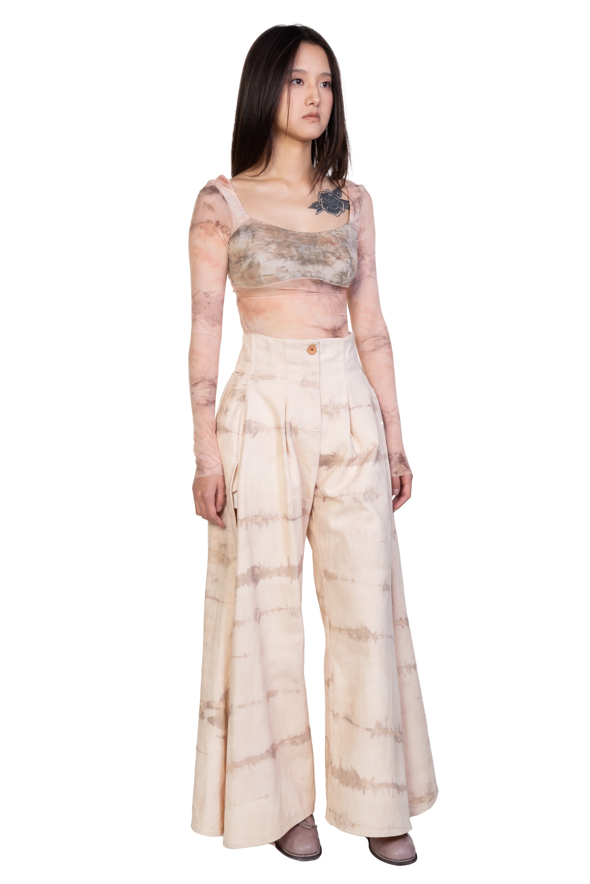 Peng Tai creates modern silhouette with traditional chinese philosophy. Inspired by how Chinese herbal medicine regulates the body from the inside out, Peng Tai aims to research and develop a way to boil Chinese herbal medicine with fabrics, to create clothes that feel like a second skin as seen with the Dyed Denim AC Pants.
