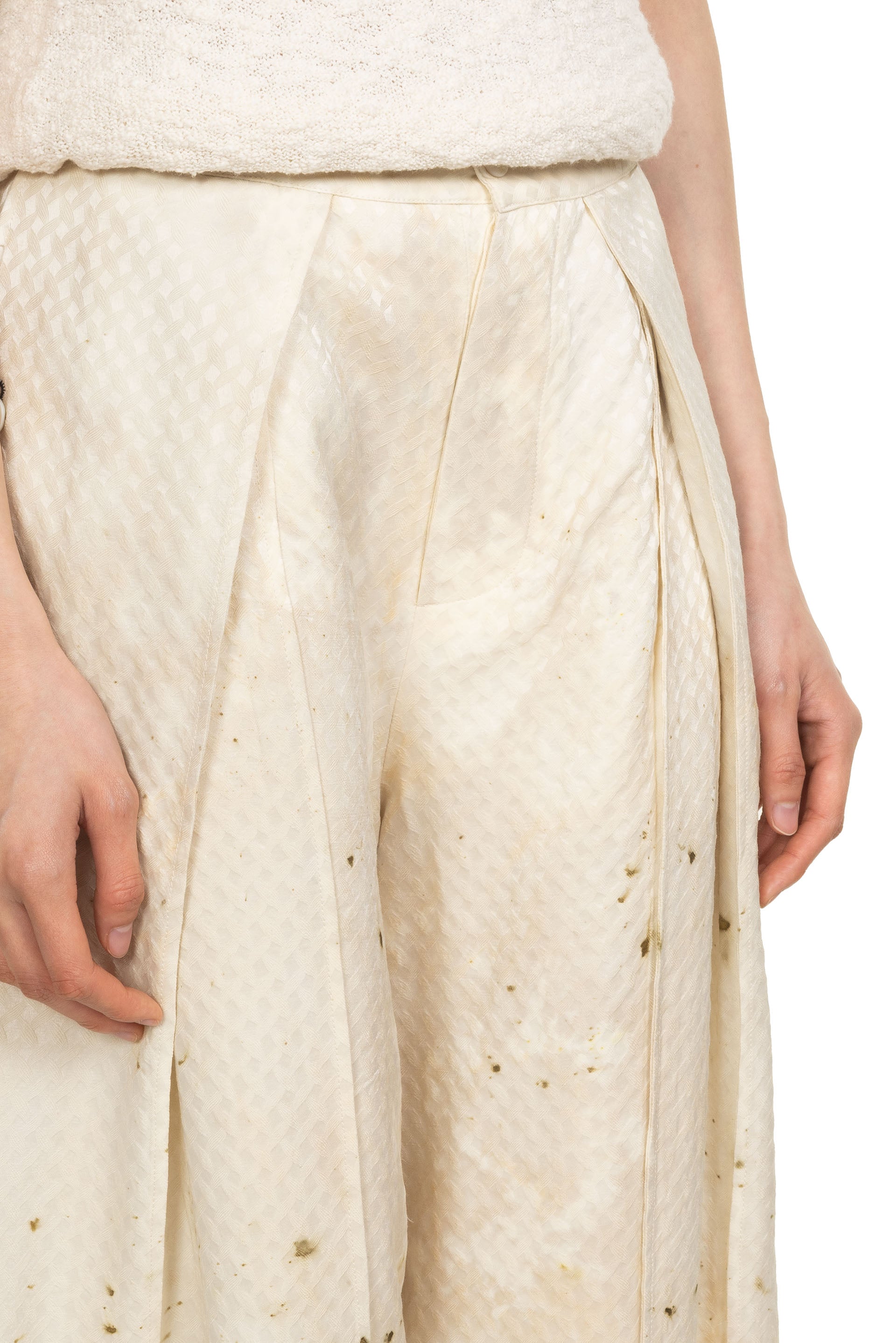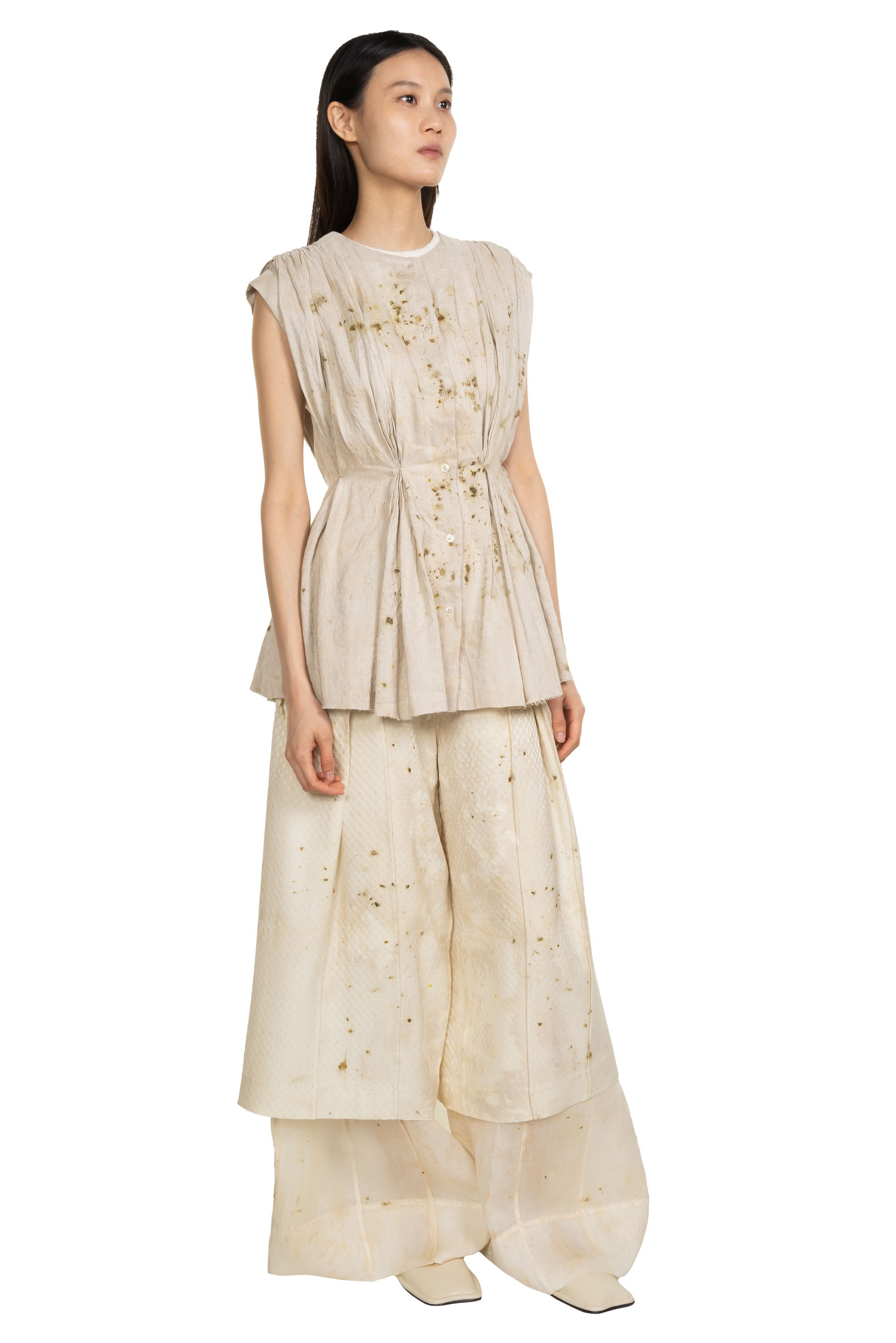 Yu Qun believes that everyone's character is multi-faceted and expressing spiritual independence. Fine hand-stitched threads, old mottled colours and patterns, and unconventional cuts are what Mute Dance has been exploring. The leaves and stems of fresh plants and berries, dried medicinal materials, old metals and so on are combined with the ancient and traditional dyeing technology to dye fabrics and paper as seen with the Dyed Double Layer Wool Silk Trousers.